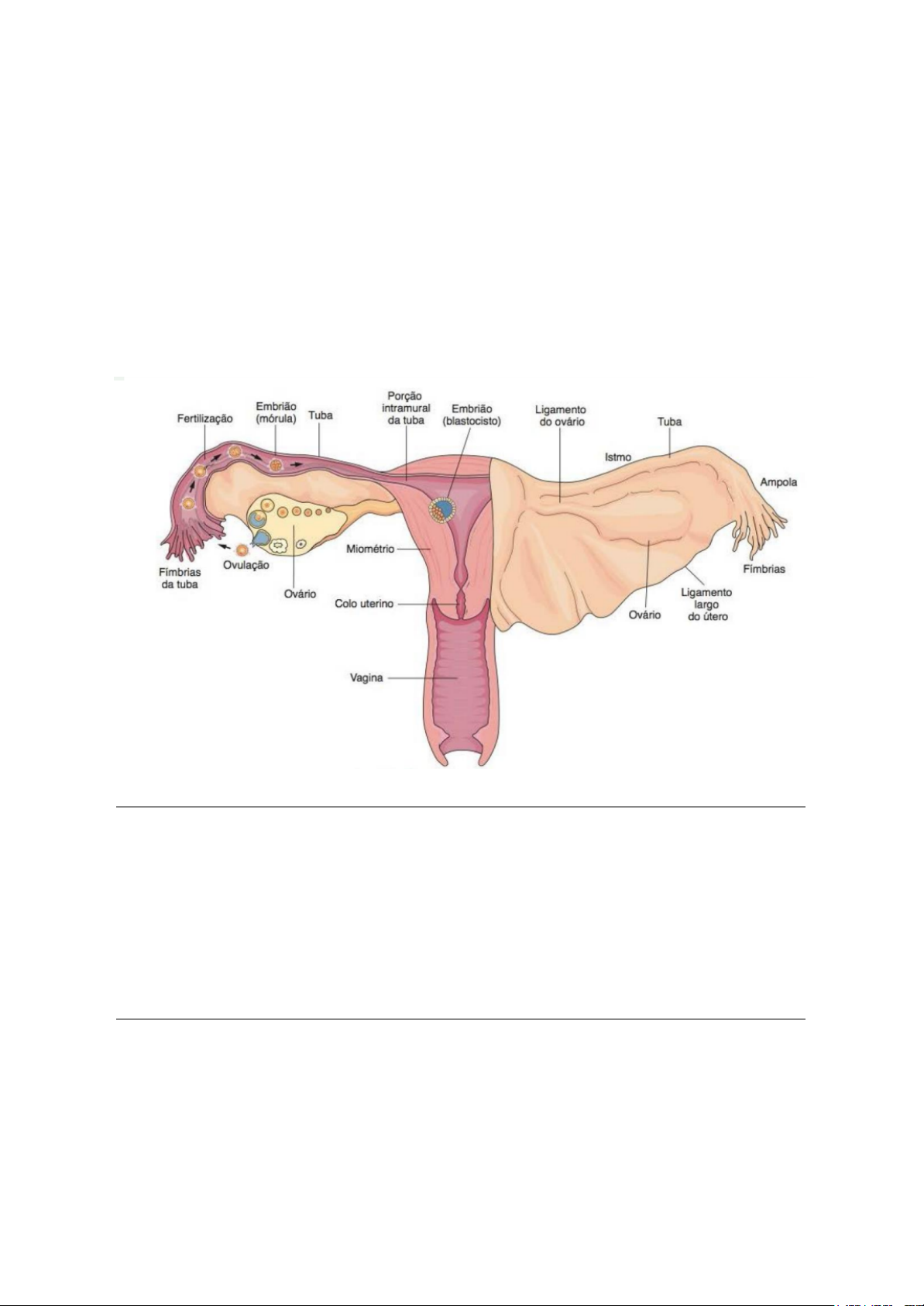 TEMA 4 – HISTOLOGIA DO SISTEMA REPRODUTOR FEMININO A histologia do sistema reprodutor feminino é a base morfológica para compreender todas as alterações vistas na citopatologia. Cada órgão apresenta um padrão microscópico específico, que se modifica de acordo com o ciclo menstrual, a idade e a ação hormonal. Este tema descreve, de forma aprofundada, as características histológicas de ovários, tubas uterinas, útero, colo uterino e vagina. 1. OVÁRIOS Os ovários são órgãos pares responsáveis pela ovogênese e produção hormonal. Histologicamente, apresentam estruturas perfeitamente organizadas que sustentam o desenvolvimento folicular e regulam o ciclo reprodutivo. 1.1. Epitélio de Superfície (Epitélio Germinativo) ● Revestido por epitélio cúbico simples. ● É a camada que recobre externamente o ovário. ● Tem papel fundamental nos mecanismos de ruptura folicular durante a ovulação. 1.2. Túnica Albugínea ● Camada de tecido conjuntivo denso e pouco vascularizado. ● Fica logo abaixo do epitélio de superfície. ● Dá resistência estrutural e protege o estroma ovariano. 1.3. Estroma Ovariano ● Tecido conjuntivo rico em fibras, células fusiformes e vasos. ● Suporta os folículos e permite grande plasticidade tecidual ao longo do ciclo. ● Contém fibroblastos, vasos, nervos, células da teca interna e externa. 1.4. Folículos Ovarianos A unidade funcional do ovário. Cada folículo contém: ● Ovócito (célula germinativa) ● Células foliculares (células da granulosa) ● Estruturas tecais conforme o estágio Estágios do Folículo: 1. Folículo primordial 2. Folículo primário 3. Folículo secundário 4. Folículo terciário (antral) 5. Folículo dominante (de Graaf) Ciclo Folicular e Fase Lútea ● Fase folicular: crescimento progressivo do folículo, maturação do ovócito. ● Ovulação: ruptura folicular e liberação do ovócito. ● Fase lútea: formação do corpo lúteo, que secreta progesterona. ● Se não houver fecundação → regressão para corpo albicans . 1.5. Organização das Regiões Ovarianas Região Cortical ● Porção mais externa. ● Abriga os folículos em todos os estágios. ● Local de ovulação e de formação do corpo lúteo. Região Medular ● Interna. ● Composta por tecido conjuntivo frouxo. ● Rica em vasos, linfáticos e nervos. 2. ÚTERO O útero é o órgão destinado ao crescimento e desenvolvimento fetal. Histologicamente, apresenta três camadas principais. 2.1. Endométrio Camada interna, altamente sensível a hormônios. É uma mucosa rica em vasos e glândulas tubulosas. Composição ● Epitélio colunar simples ● Glândulas endometriais tubulares ● Lâmina própria altamente vascularizada Camadas 1. Camada Basal ○ Fixa ao miométrio. ○ Não sofre descamação. 2. Camada Funcional ○ Responsável pela espessura variável durante o ciclo. ○ É descamada na menstruação. Ciclo Uterino ● Fase proliferativa (dias 1–14) Crescimento endometrial sob influência do estrogênio. ● Fase secretora (dias 14–28) Glândulas dilatam, endométrio fica espesso, rico em nutrientes. ● Fase menstrual Descamação por queda hormonal (degeneração do corpo lúteo) . 2.2. Miométrio ● Camada muscular lisa espessa. ● Responsável por contrações importantes: ○ menstruação ○ parto ○ involução uterina pós-parto ● Composto por fibras musculares organizadas em camadas entrelaçadas. 2.3. Perimétrio ● Camada externa de tecido conjuntivo. ● Deriva do peritônio. ● Revestida por epitélio pavimentoso simples (mesotélio). 3. TUBA UTERINA (Trompas de Falópio) Responsáveis pela captura do ovócito, fecundação e transporte até o útero. 3.1. Histologia da Tuba Serosa ● Mesotélio + tecido conjuntivo. Camada Muscular ● Interna circular espessa. ● Externa longitudinal fina. ● Permite movimentos peristálticos. Mucosa ● Pregas longitudinais projetadas no lúmen. ● Revestida por epitélio colunar simples, formado por: ○ células ciliadas – movem ovócito/zigoto ○ células secretoras (não ciliadas) – nutrição 3.2. Influência Hormonal ● Durante a fase folicular, há hipertrofia epitelial. ● Durante a fase lútea, epitélio tende à atrofia. Essas oscilações refletem as variações de estrogênio e progesterona . 4. COLO DO ÚTERO (Cérvice) ● Estrutura de grande importância clínica e citopatológica. 4.1. Anatomia e Divisões ● Ectocérvice (parte visível na vagina) ● Endocérvice (canal cervical) ● Zona de Transformação (ZT) – área crítica onde ocorrem metaplasia, infecções e carcinogênese. 4.2. Ectocérvice – Epitélio Escamoso Estratificado Camadas celulares: 1. Células superficiais 2. Células intermediárias 3. Células parabasais 4. Células basais Padrão essencial para interpretação citológica. 4.3. Endocérvice – Epitélio Colunar Glandular ● Epitélio colunar simples, secretor de muco. ● Possui glândulas cervicais ramificadas. ● A viscosidade do muco varia com o ciclo menstrual. ● Área extremamente sensível a alterações hormonais e infecções. ● 4.4. Zona de Transformação ● Ponto de encontro entre epitélio escamoso e colunar. ● Região mais vulnerável a lesões precursoras e câncer. ● Deve obrigatoriamente estar presente na coleta citológica adequada. 5. VAGINA Canal fibromuscular que comunica o meio externo ao trato reprodutivo interno. 5.1. Camadas da Parede Vaginal 1. Mucosa ● Epitélio estratificado pavimentoso não queratinizado. ● Lâmina própria de tecido conjuntivo. ● Influenciada por estrogênio (glicogênio – base da flora lactobacilar). 2. Camada Muscular ● Fibras musculares lisas organizadas. ● Permite distensão, cópula e parto. 3. Adventícia ● Tecido conjuntivo denso rico em fibras elásticas. ● Dá elasticidade e resistência. 1. OVÁRIOS 1.1. Epitélio de Superfície (Epitélio Germinativo) 1.2. Túnica Albugínea 1.3. Estroma Ovariano 1.4. F