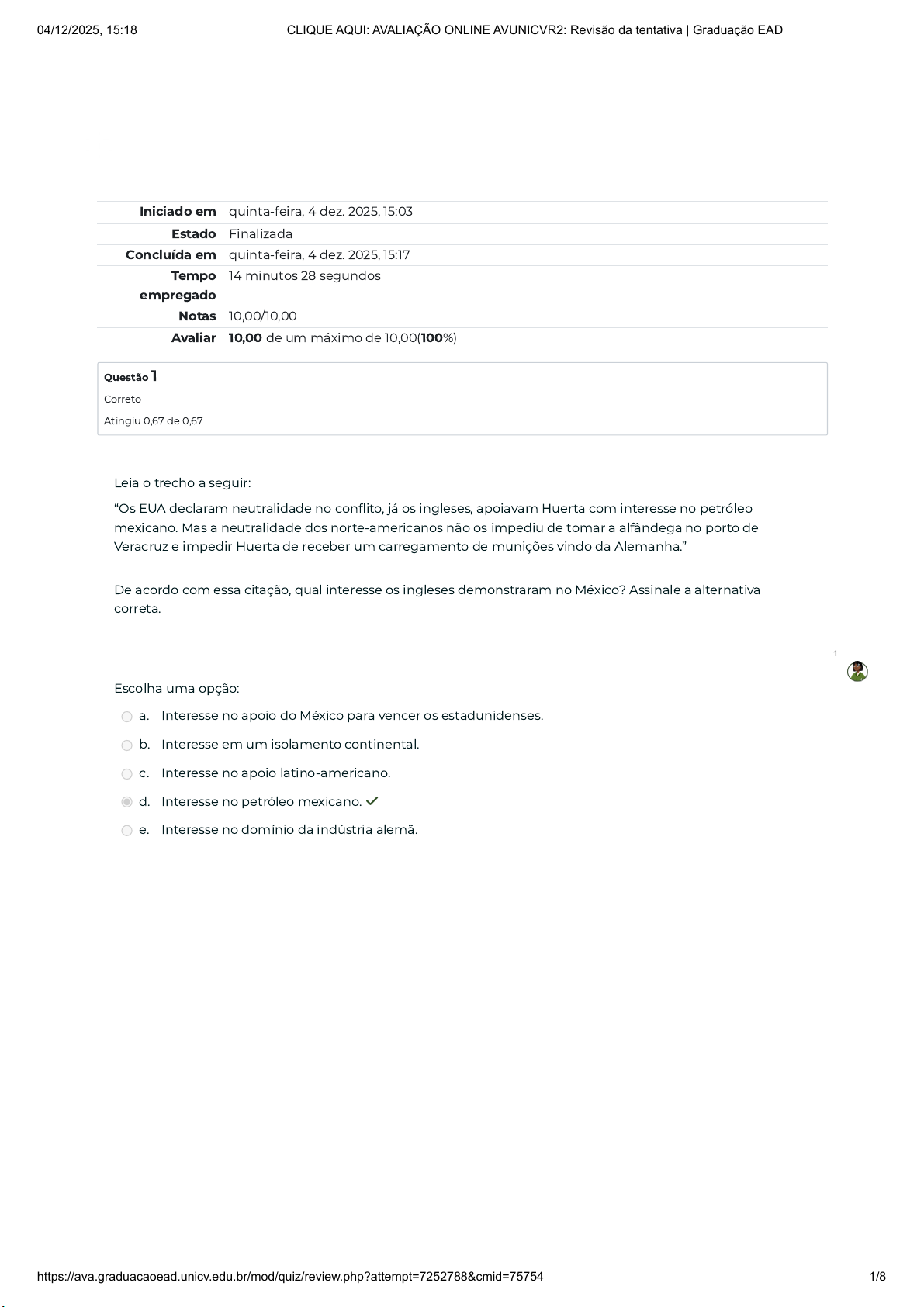 Iniciado em quinta-feira, 4 dez. 2025, 15:03 Estado Finalizada Concluída em quinta-feira, 4 dez. 2025, 15:17 Tempo empregado 14 minutos 28 segundos Notas 10,00/10,00 Avaliar 10,00 de um máximo de 10,00(100%) Questão 1 Correto Atingiu 0,67 de 0,67 Leia o trecho a seguir: “Os EUA declaram neutralidade no conflito, já os ingleses, apoiavam Huerta com interesse no petróleo mexicano. Mas a neutralidade dos norte-americanos não os impediu de tomar a alfândega no porto de Veracruz e impedir Huerta de receber um carregamento de munições vindo da Alemanha.” De acordo com essa citação, qual interesse os ingleses demonstraram no México? Assinale a alternativa correta. Escolha uma opção: a. Interesse no apoio do México para vencer os estadunidenses. b. Interesse em um isolamento continental. c. Interesse no apoio latino-americano. d. Interesse no petróleo mexicano. ✓ e. Interesse no domínio da indústria alemã. 1 04/12/2025, 15:18 CLIQUE AQUI: AVALIAÇÃO ONLINE AVUNICVR2: Revisão da tentativa | Graduação EAD https://ava.graduacaoead.unicv.edu.br/mod/quiz/review.php?attempt=7252788&cmid=75754 1/8 Questão 2 Correto Atingiu 0,67 de 0,67 Questão 3 Correto Atingiu 0,67 de 0,67 Jânio Quadros, ao ver que não possuía apoio do Congresso Nacional e nem da população, resolveu usar o radicalismo político da Guerra Fria a seu favor. O então presidente tentou aumentar seus poderes como governante , e para isso fez parte do seu plano: Assinale a alternativa correta: Escolha uma opção: a. Afirmar que o Congresso Nacional tentava dar um Golpe. b. Destacar a presença de navios norte-americanos no litoral do Rio de Janeiro. c. Alertar uma possível invasão socialista no Brasil. d. Colocar a alcunha de comunista no vice-presidente João Goulart. ✓ e. Culpar Jango por uma tentativa de assassinato. Leia o trecho a seguir: “Com a conversão de Henrique inicia-se uma perseguição religiosa contra os católicos na Inglaterra. A sucessora de Henrique VIII, Maria I de Tudor (1516-1558), continuou a perseguição religiosa que seria freada com a ascensão da rainha Elizabeth I . Com a morte de Elizabeth e a sucessão dada aos Stuart, a perseguição continua e se intensifica. Ora um rei era anglicano, ora era católico. Dependendo da fé do rei, o perseguido era aquele da fé contrária.” A perseguição religiosa na Inglaterra ocasionou: Assinale a alternativa correta: Escolha uma opção: a. À criação da Igreja anglicana. b. A imigração dos puritanos às Treze Colônias. ✓ c. À restauração do catolicismo em território inglês. d. À Revolução Puritana no território inglês. e. À independência dos Estados Unidos. 1 04/12/2025, 15:18 CLIQUE AQUI: AVALIAÇÃO ONLINE AVUNICVR2: Revisão da tentativa | Graduação EAD https://ava.graduacaoead.unicv.edu.br/mod/quiz/review.php?attempt=7252788&cmid=75754 2/8 Questão 4 Correto Atingiu 0,67 de 0,67 Questão 5 Correto Atingiu 0,67 de 0,67 O segundo caso sobre a apropriação do termo bolivariano ocorre à partir de grupos que modificaram suas propostas para o futuro do país com características progressistas, anti-imperialistas e de solidariedade latino- americana. Um segundo caso da apropriação do termo bolivariano é: Assinale a alternativa correta: Escolha uma opção: a. A luta da direita elitista que tenta minar qualquer influência socialista na Venezuela. b. A luta armada guerrilheira de cunho comunista que ainda hoje luta por uma revolução socialista na Venezuela. c. Todo o esforço das classes médias e altas da Venezuela para ligar seus interesses aos dos EUA. d. A grupos progressistas alinhados aos EUA e que alimentam desprezo pela solidariedade latino- americana. e. A releitura de grupos comunistas na Venezuela que abandonaram a perspectiva de revolução socialista. ✓ Leia o trecho a seguir: “A proposta de Zapata preocupou Madero, a elite fundiária, a burguesia industrial e até mesmo os interesses dos Estados Unidos em território mexicano, pois os estadunidenses queriam manter seus interesses econômicos lucrativos em sua fronteira sul.” Após análise do trecho acima, assinale a alternativa correta que corresponde a proposta de Zapata: Escolha uma opção: a. Como líder sindical, propôs uma Reforma Trabalhista. b. Como líder camponês, propôs uma Reforma Trabalhista. c. Como líder operário, propôs uma Reforma Fiscal. d. Como líder operário, propôs uma Reforma Econômica. e. Como líder camponês, propôs uma Reforma Agrária. ✓ 1 04/12/2025, 15:18 CLIQUE AQUI: AVALIAÇÃO ONLINE AVUNICVR2: Revisão da tentativa | Graduação EAD https://ava.graduacaoead.unicv.edu.br/mod/quiz/review.php?attempt=7252788&cmid=75754 3/8 Questão 6 Correto Atingiu 0,67 de 0,67 Questão 7 Correto Atingiu 0,67 de 0,67 Leia o trecho da carta abaixo: “É possível comprar ou vender o céu e o calor da terra? Tal Idéia é estranha para nós. Se não possuímos o frescor do ar e o brilho da água, como podem comprá-los? Cada pedaço desta terra é sagrada para o meu povo. Cada ramo brilhante de um pinheiro, cada areia da prata, cada bruma nas densas florestas, cada clareira e cada inseto a zumbir são sagrados na memória do meu povo. A seiva que corre através das árvores carrega as memórias do homem vermelho [...]. Somos parte da terra e ela é parte de nós [...], Deste modo, quando o grande Chefe manda dizer que quer comprar nossa terra, ele pede muito de nós [...]. Consideraremos sua oferta de comprar nossa terra. Mas não será fácil, pois esta terra é sagrada para nós. (CATANI: 1988). Este fragmento da carta do cacique Seattle ao presidente dos EUA se refere a qual processo histórico? . Assinale a alternativa correta: . Escolha uma opção: a. Ao choque cultural sobre o conceito de terra entre indígenas e estadunidenses. ✓ b. Ao consenso cultural sobre o conceito de terra entre indígenas e estadunidenses. c. Ao valor comercial dado às terras pelos indígenas. d. Ao consenso político sob
