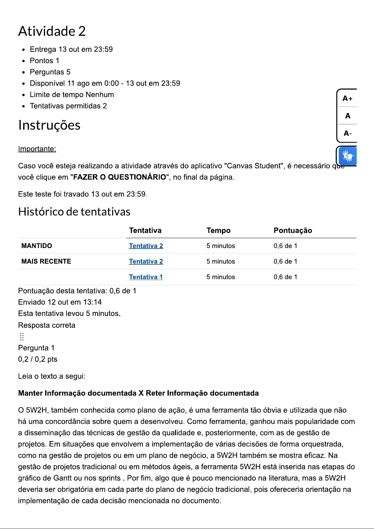 Atividade 2 Entrega 13 out em 23:59 Pontos 1 Perguntas 5 Disponível 11 ago em 0:00 13 out em 23:59 Limite de tempo Nenhum A+ Tentativas permitidas 2 A Instruções A- Importante: Caso você esteja realizando a atividade através do aplicativo "Canvas Student", é necessário que você clique em "FAZER QUESTIONÁRIO", no final da página. Este teste foi travado 13 out em 23:59. Histórico de tentativas Tentativa Tempo Pontuação MANTIDO Tentativa 2 5 minutos 0,6 de 1 MAIS RECENTE Tentativa 2 5 minutos 0,6 de 1 Tentativa 1 5 minutos 0,6 de 1 Pontuação desta tentativa: 0,6 de 1 Enviado 12 out em 13:14 Esta tentativa levou 5 minutos. Resposta correta Pergunta 1 0,2 / 0,2 pts Leia texto a segui: Manter Informação documentada X Reter Informação documentada O 5W2H, também conhecida como plano de ação, é uma ferramenta tão óbvia e utilizada que não há uma concordância sobre quem a desenvolveu. Como ferramenta, ganhou mais popularidade com a disseminação das técnicas de gestão da qualidade e, posteriormente, com as de gestão de projetos. Em situações que envolvem a implementação de várias decisões de forma orquestrada, como na gestão de projetos ou em um plano de negócio, a 5W2H também se mostra eficaz. Na gestão de projetos tradicional ou em métodos ágeis, a ferramenta 5W2H está inserida nas etapas do gráfico de Gantt ou nos sprints Por fim, algo que é pouco mencionado na literatura, mas a 5W2H deveria ser obrigatória em cada parte do plano de negócio tradicional, pois ofereceria orientação na implementação de cada decisão mencionada no documento.Fonte: 5W2H.pdf (sebrae.com.br). Considerando as informações acima, avalie as questões a seguir: I- O 5W2H tem como objetivo principal a melhoria contínua exigida no item 5 da norma ISO 9001: 2015, em substituição ao PDCA. Como ferramenta de apoio à técnica 5W2H o brainstorming é muito utilizado pois este é um método de geração coletiva de novas ideias pela contribuição e participação de diversos indivío A+ inseridos num grupo. A III Após a sessão de brainstorming, cada setor assume seu papel na busca de todos os proble A- prováveis ou não levantados, deixando a causa raiz restrita à operação. É correto que se afirma apenas em: I, apenas. e III, apenas. I e III, apenas. III, apenas. II, apenas. A alternativa está correta, pois apenas a afirmação é verdadeira. A afirmativa está correta, pois como ferramenta de apoio à técnica 5W2H brainstorming é muito utilizado pois este é um método de geração coletiva de novas ideias pela contribuição e participação de diversos indivíduos inseridos num grupo. A afirmativa não está correta, pois o 5W2H tem como objetivo principal auxiliar no planejamento de ações e atividades, esclarecendo e sanando dúvidas sobre um problema e dando suporte à tomada de decisões. A afirmativa III não está correta, pois após a sessão de brainstorming, na qual podem ser geradas dezenas de ideias, é necessário efetuar escolhas, retirando todas as que não se adaptam aos objetivos, as capacidades financeiras, técnicas ou administrativas da organização. Resposta correta Pergunta 2 0,2 / 0,2 pts Observe a seguir primeiro resultado da análise de causas realizado na empresa ABC, após um lote de produção de 10.000 unidades apresentar resultados muito dispersos, fora das especificações:Mão de obra Método Máquina Manutenção demorou a acontecer Sistema de posicionamento Falha no treinamento dos operadores está Intervalo estabelecido para as Instruções não foram desatualizado manutenções é muito longo claras o suficiente Não houve revisão prévia do conteúdo a ser treinado Sistema de alimentação da máquina está desatualizado A+ Problema: alta dispersão resultados de A instrumento que afere a calibração da máquina Composição dos insumos não apresentou instabilidade A- atendia às especificações Fornecedor falhou no fornecimento Meio ambiente Medição Matéria-prima Fonte: CARPINETTI, L. C. R.; GEROLANO, M. C. Gestão da qualidade ISO 9001:2015: requisitos e integração com a ISO 14001:2015. São Paulo: Atlas, 2016, p. 84 adaptado. Considerando as informações acima apresentadas, avalie as afirmações a seguir. I. A análise de causas acima exposta estará completa quando for preenchido no Diagrama de Causa e Efeito o conteúdo relativo a "meio ambiente". II. As causas apontadas em "medição", "matéria-prima" e "método" precisam ser mais investigadas e detalhadas, com a aplicação de outras ferramentas como "Cinco III. uso do brainstorming pode ser considerado para aprofundar as análises apresentadas neste Diagrama de Causa e Efeito. É correto o que se afirma em: I, apenas. II, apenas. I e III, apenas. I, e III. e III, apenas. Esta alternativa está correta, porque apenas as afirmações e III estão corretas.A afirmação está incorreta, por dois motivos. O preenchimento de um Diagrama de Causa e Efeito não exige que se identifiquem respostas para todos os seus eixos, sendo necessário apenas incluir informações naqueles que realmente forem relevantes para a situação que está sendo analisada. Além disso, a análise de causas apresentada está incompleta, requerendo detalhes em diversas causas já identificadas, para se chegar a uma causa raiz ou mais. A afirmação está correta porque, nos três eixos, "medição", "matéria-prima" e "método", as informações estão relatadas de modo incompleto. O uso dos "Cinco Porquês" é uma das A+ ferramentas que permite aprofundamento necessário para se identificar a causa raiz ou cau A para, posteriormente, tornar viável o planejamento e a execução de ações corretivas adequada A- Por fim, a afirmação III está correta, pois brainstorming pode ser utilizado para detalhar cada das causas já identificadas no Diagrama de Causa e Efeito. Brainstorming é outra ferramenta d qualidade, capaz de auxiliar a condução coesa de análises de causas, porque i