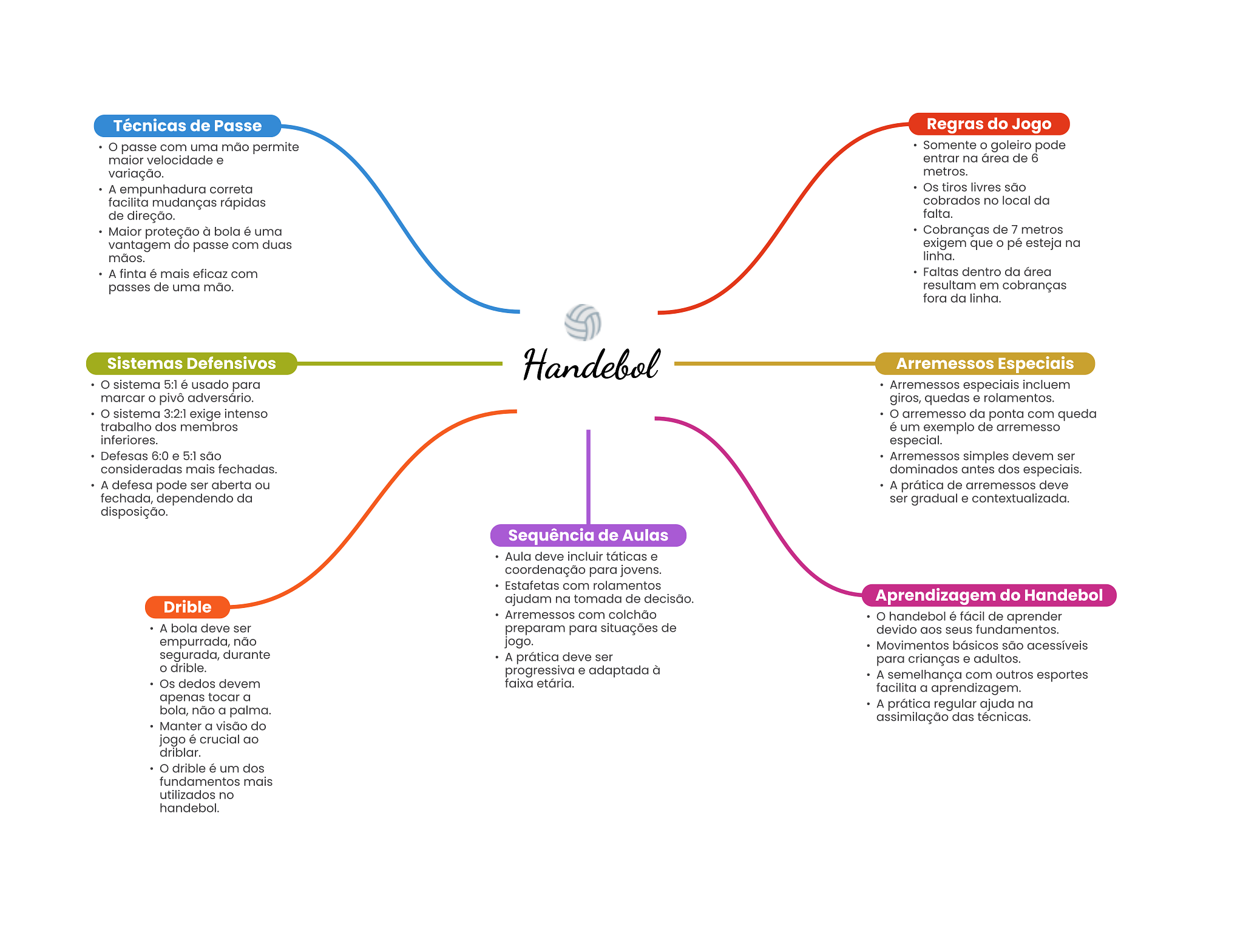 Técnicas de Passe Regras do Jogo passe com uma mão permite Somente goleiro pode maior velocidade e entrar na área de 6 variação. metros. A empunhadura correta Os tiros livres são facilita mudanças rápidas cobrados no local da de direção. falta. Maior proteção à bola é uma Cobranças de 7 metros vantagem do passe com duas exigem que pé esteja na mãos. linha. A finta é mais eficaz com Faltas dentro da área passes de uma mão. resultam em cobranças fora da linha. Sistemas Defensivos Handebol Arremessos Especiais sistema 5:1 é usado para Arremessos especiais incluem marcar pivô adversário. giros, quedas e rolamentos. sistema 3:2:1 exige intenso arremesso da ponta com queda trabalho dos membros é um exemplo de arremesso inferiores. especial. Defesas 6:0 e 5:1 são Arremessos simples devem ser consideradas mais fechadas. dominados antes dos especiais. A defesa pode ser aberta ou A prática de arremessos deve fechada, dependendo da ser gradual e contextualizada. disposição. Sequência de Aulas Aula deve incluir táticas e coordenação para jovens. Estafetas com rolamentos ajudam na tomada de decisão. Aprendizagem do Handebol Drible Arremessos com colchão handebol é fácil de aprender A bola deve ser preparam para situações de devido aos seus fundamentos. empurrada, não jogo. Movimentos básicos são acessíveis segurada, durante A prática deve ser para crianças e adultos. drible. progressiva e adaptada à A semelhança com outros esportes Os dedos devem faixa etária. facilita a aprendizagem. apenas tocar a bola, não a palma. A prática regular ajuda na assimilação das técnicas. Manter a visão do jogo é crucial ao driblar. drible é um dos fundamentos mais utilizados no handebol.