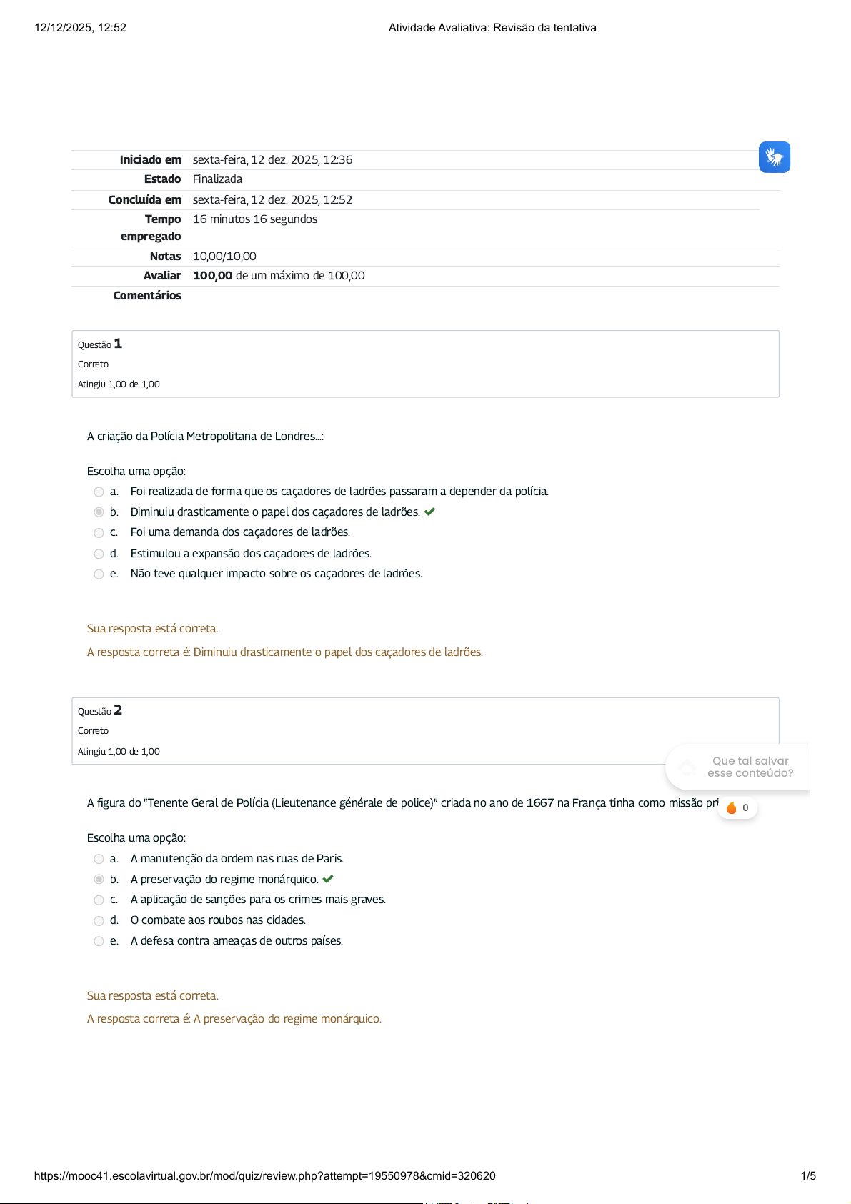 Iniciado em sexta-feira, 12 dez. 2025, 12:36 Estado Finalizada Concluída em sexta-feira, 12 dez. 2025, 12:52 Tempo empregado 16 minutos 16 segundos Notas 10,00/10,00 Avaliar 100,00 de um máximo de 100,00 Comentários Questão 1 Correto Atingiu 1,00 de 1,00 Questão 2 Correto Atingiu 1,00 de 1,00 A criação da Polícia Metropolitana de Londres...: Escolha uma opção: a. Foi realizada de forma que os caçadores de ladrões passaram a depender da polícia. b. Diminuiu drasticamente o papel dos caçadores de ladrões. c. Foi uma demanda dos caçadores de ladrões. d. Estimulou a expansão dos caçadores de ladrões. e. Não teve qualquer impacto sobre os caçadores de ladrões. Sua resposta está correta. A resposta correta é: Diminuiu drasticamente o papel dos caçadores de ladrões. A figura do “Tenente Geral de Polícia (Lieutenance générale de police)” criada no ano de 1667 na França tinha como missão principal: Escolha uma opção: a. A manutenção da ordem nas ruas de Paris. b. A preservação do regime monárquico. c. A aplicação de sanções para os crimes mais graves. d. O combate aos roubos nas cidades. e. A defesa contra ameaças de outros países. Sua resposta está correta. A resposta correta é: A preservação do regime monárquico. Que tal salvar esse conteúdo? 0 12/12/2025, 12:52 Atividade Avaliativa: Revisão da tentativa https://mooc41.escolavirtual.gov.br/mod/quiz/review.php?attempt=19550978&cmid=320620 1/5 Questão 3 Correto Atingiu 1,00 de 1,00 Questão 4 Correto Atingiu 1,00 de 1,00 Com base no que foi discutido na Aula 1, assinale a resposta INCORRETA em relação aos benefícios da “participação” e “controle social” nas políticas públicas de segurança. Escolha uma opção: a. Constitui elemento fundamental para construir a adesão social necessária à implementação e consecução dos objetivos das políticas públicas. b. Permite um melhor conhecimento dos contextos e valores sociais dos potenciais beneficiários e beneficiárias das políticas públicas. c. Permite uma maior interferência política sobre as organizações policiais em decisões técnicas como a compra de armamentos e viaturas. d. Auxilia o Estado na busca de respostas para o caráter multifacetado dos problemas que afetam sociedades de escala e complexidade crescentes. e. Permite o envolvimento ativo dos cidadãos na tomada de decisões, políticas públicas e assuntos de interesse comum. Sua resposta está correta. A resposta correta é: Permite uma maior interferência política sobre as organizações policiais em decisões técnicas como a compra de armamentos e viaturas. Robert Reiner, em seu texto “The Police in the Class Structure” (1978), fala da questão da dificuldade da identificação do/a policial como um “trabalhador” na sociedade anglo-saxã. Com base no que foi discutido na Aula 4, assinale as respostas que melhor caracterizam os motivos dessa afirmação. I - O fato dos/as policiais ocuparem um lugar ambíguo na sociedade de classes, enquanto trabalhadores da segurança pública que são chamados a reprimir manifestações de demandas de outros trabalhadores. II - O fato dos/as policiais, em diversos países, terem o seu direito à sindicalização restringidos, o que é garantido por lei às demais categorias de trabalhadores. III - O fato dos/as policiais serem considerados trabalhadores essenciais, encarregados pelo exercício do monopólio da violência legal e legítima do Estado. Escolha uma opção: a. As opções II e III são verdadeiras. b. Todas as opções são verdadeiras. c. As opções I e II são verdadeiras. d. As opções I e III são verdadeiras. e. Nenhuma das opções é verdadeira. Sua resposta está correta. A resposta correta é: Todas as opções são verdadeiras. Que tal salvar esse conteúdo? 12/12/2025, 12:52 Atividade Avaliativa: Revisão da tentativa https://mooc41.escolavirtual.gov.br/mod/quiz/review.php?attempt=19550978&cmid=320620 2/5 Questão 5 Correto Atingiu 1,00 de 1,00 Questão 6 Correto Atingiu 1,00 de 1,00 O trinômio Plano/Conselho/Fundo busca estabelecer a arquitetura para o funcionamento do Sistema Único de Segurança Pública (SUSP). Assinale a alternativa incorreta sobre esse assunto. Escolha uma opção: a. Busca ir além das capacidades individuais de cada servidor e de cada instituição de segurança pública para tornar o conjunto desses órgãos reconhecido como um “sistema” eficaz, efetivo e eficiente. b. É uma fórmula que busca promover melhores níveis de governança sobre a segurança pública no Brasil. c. O SUSP foi inspirado em sistemas de maiores longevidades no Brasil, como Sistema Único de Saúde (SUS) e o Sistema Único de Assistência Social (SUAS). d. Por Plano, requer a criação de políticas e planos nacionais; por Conselho, cria o Conselho compostos pelo governo e pela sociedade civil e, por Fundo, dedica a destinação orçamentária consoante os objetivos pretendidos pela normatização e pelas instâncias de participação social. e. Consiste no esforço da União em aprofundar a autonomia de entes federativos e órgãos que compõem o SUSP, de modo a lhes aumentar a capacidade operativa. Sua resposta está correta. A resposta correta é: Consiste no esforço da União em aprofundar a autonomia de entes federativos e órgãos que compõem o SUSP, de modo a lhes aumentar a capacidade operativa. Com base no que foi discutido na Aula 2, assinale a resposta que melhor caracteriza a diferença entre uma "polícia política" e uma "polícia democrática". Escolha uma opção: a. Ambas são essencialmente iguais, com a distinção entre elas sendo uma questão de nomenclatura. b. Uma polícia política é mais transparente em suas ações do que uma polícia democrática. c. Uma polícia política é focada na proteção dos direitos individuais, enquanto uma polícia democrática está preocupada com a manutenção do poder político. d. Uma polícia política é lidera