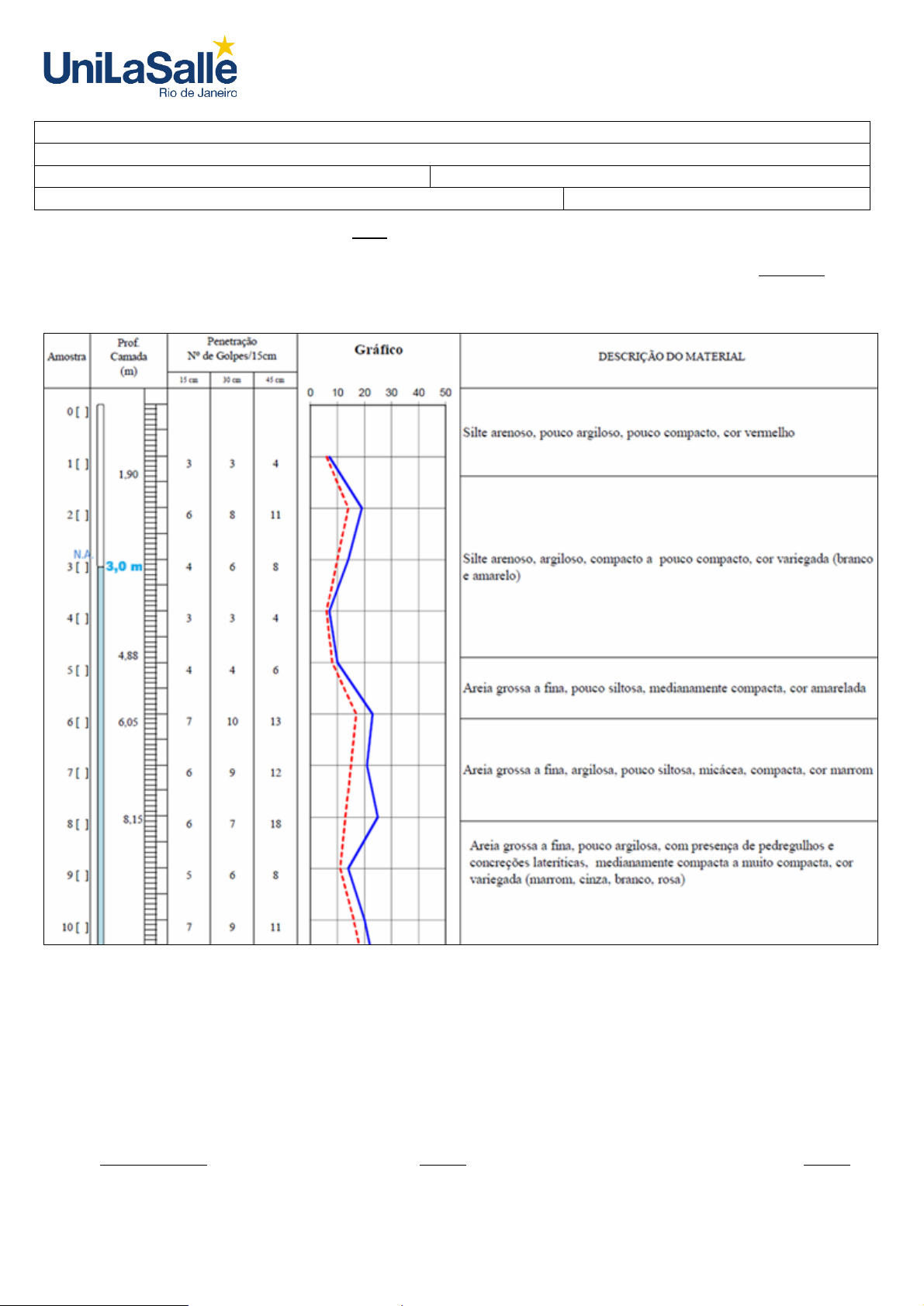 CURSO: ENGENHARIA CIVIL (NOTURNO) PROFESSOR: ELAINE CRISTINA G. BARRETO TURMA: ENC1P0804N0001 DISCIPLINA: FUNDAÇÕES, SONDAGEM E CONTENÇÃO ALUNO: RA: QUESTÃO EXTRA – VALE ATÉ 2,0 PONTOS PARA G2 – ENTREGA ATÉ 07/12/2025 No terreno indicado no perfil de sondagem à percussão abaixo será construída uma estaca escavada (com equipamento de hélice contínua), em concreto armado, com 0,4 m de diâmetro e 10,0 m de comprimento. Pede-se: (a) Desenhe o perfil geotécnico deste terreno, considerando como profundidades de transição no solo: 1,5 m, 3,0 m, 5,0 m, 6,0 m e 8,0 m. (b) Desprezando a parcela de coesão do solo (c’ = 0), calcule a capacidade de carga desta fundação profunda: (b.1) Pelo método teórico de Terzaghi, obtendo o peso específico e o ângulo de atrito das camadas de solo por meio das correlações com NSPT indicadas. i. Teixeira (1996): ϕ’ = 15° + [(24 . NSPT)1/2] (Nota 1: Use o NSPT médio da camada para calcular ϕ’); (Nota 2: Na ponta da estaca, para o valor de ϕ’ obtido diretamente, considere Nq* = 74) ii. Godoy (1972): (Nota 1: Utilize os valores da tabela para siltes arenosos também); (Nota 2: Para obter o peso específico, considere: acima do N.A. = solo seco, abaixo do N.A. = solo saturado, desprezando a fase úmida da franja capilar). (b.2) Pelo método semi-empírico de Aoki-Velloso.
