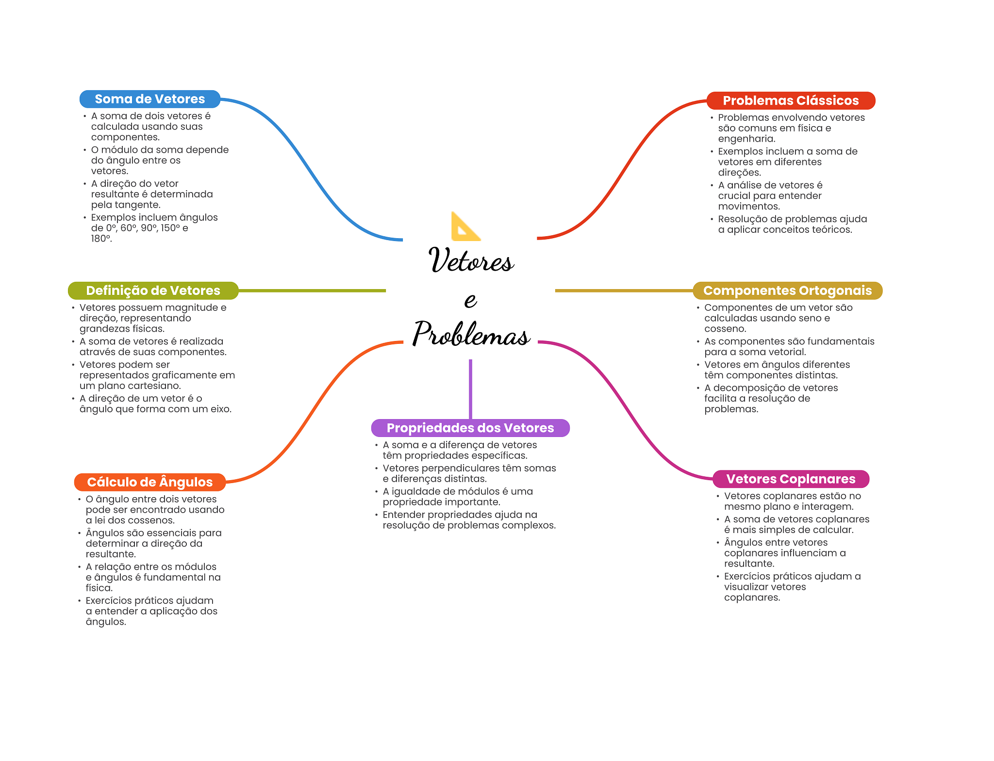 Soma de Vetores Problemas Clássicos A soma de dois vetores é Problemas envolvendo vetores calculada usando suas são comuns em física e componentes. engenharia. módulo da soma depende Exemplos incluem a soma de do ângulo entre OS vetores em diferentes vetores. direções. A direção do vetor A análise de vetores é resultante é determinada crucial para entender pela tangente. movimentos. Exemplos incluem ângulos Resolução de problemas ajuda de 60°, 90°, 150° e a aplicar conceitos teóricos. Vetores Definição de Vetores Componentes Ortogonais e Vetores possuem magnitude e Componentes de um vetor são direção, representando calculadas usando seno e grandezas físicas. A soma de vetores é realizada Problemas cosseno. As componentes são fundamentais através de suas componentes. para a soma vetorial. Vetores podem ser Vetores em ângulos diferentes representados graficamente em têm componentes distintas. um plano cartesiano. A decomposição de vetores A direção de um vetor é facilita a resolução de ângulo que forma com um eixo. problemas. Propriedades dos Vetores A soma e a diferença de vetores têm propriedades específicas. Vetores perpendiculares têm somas Cálculo de e diferenças distintas. Vetores Coplanares A igualdade de módulos é uma ângulo entre dois vetores Vetores coplanares estão no propriedade importante. pode ser encontrado usando mesmo plano e interagem. a lei dos cossenos. Entender propriedades ajuda na A soma de vetores coplanares resolução de problemas complexos. Ângulos são essenciais para é mais simples de calcular. determinar a direção da entre vetores resultante. coplanares influenciam a A relação entre OS módulos resultante. e ângulos é fundamental na Exercícios práticos ajudam a física. visualizar vetores Exercícios práticos ajudam coplanares. a entender a aplicação dos ângulos.