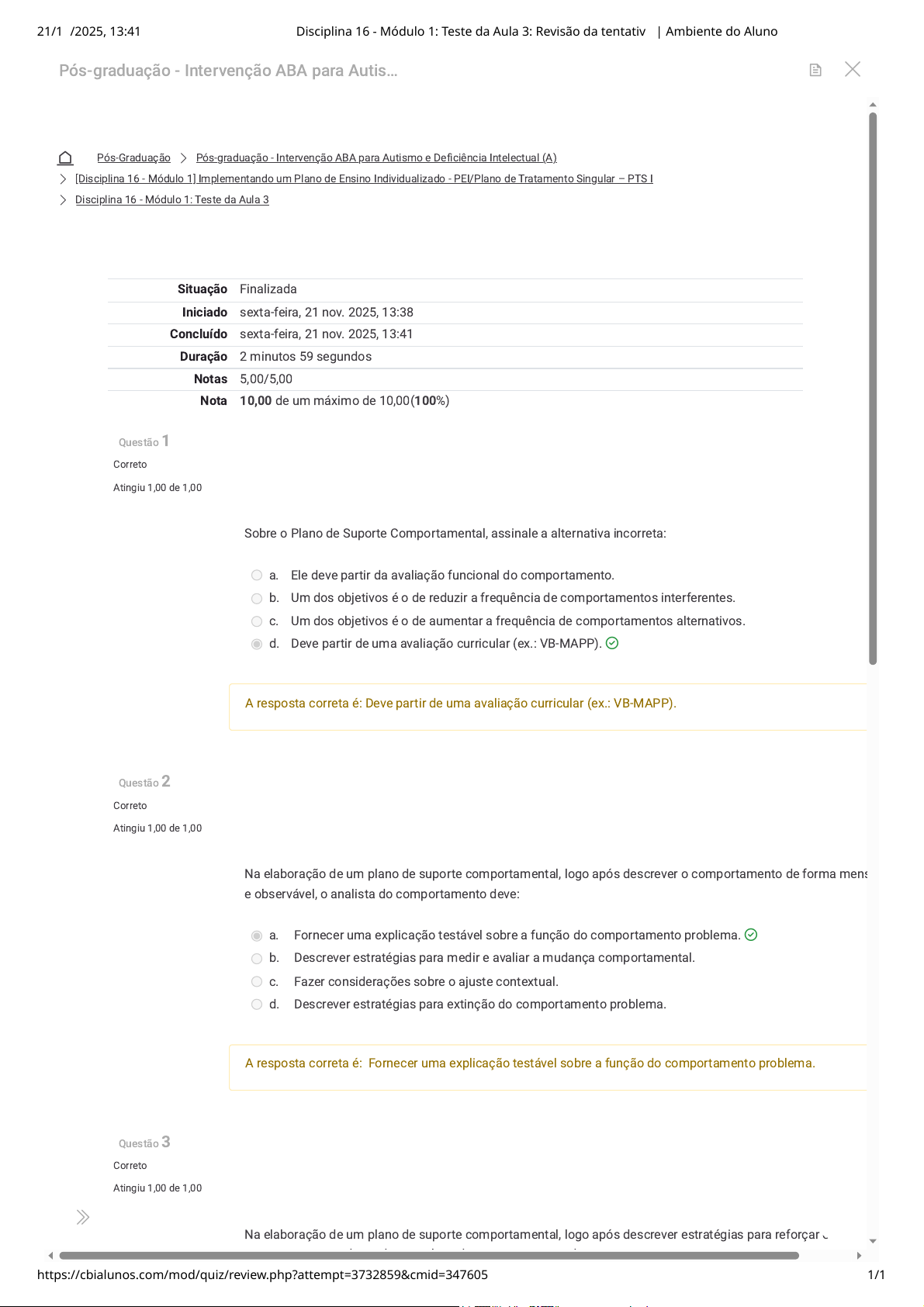 Pós-Graduação Pós-graduação - Intervenção ABA para Autismo e Deficiência Intelectual (A) [Disciplina 16 - Módulo 1] Implementando um Plano de Ensino Individualizado - PEI/Plano de Tratamento Singular – PTS I Disciplina 16 - Módulo 1: Teste da Aula 3 Questão 1 Correto Atingiu 1,00 de 1,00 Questão 2 Correto Atingiu 1,00 de 1,00 Questão 3 Correto Atingiu 1,00 de 1,00 Sobre o Plano de Suporte Comportamental, assinale a alternativa incorreta: a. Ele deve partir da avaliação funcional do comportamento. b. Um dos objetivos é o de reduzir a frequência de comportamentos interferentes. c. Um dos objetivos é o de aumentar a frequência de comportamentos alternativos. d. Deve partir de uma avaliação curricular (ex.: VB-MAPP). A resposta correta é: Deve partir de uma avaliação curricular (ex.: VB-MAPP). Na elaboração de um plano de suporte comportamental, logo após descrever o comportamento de forma mens e observável, o analista do comportamento deve: a. Fornecer uma explicação testável sobre a função do comportamento problema. b. Descrever estratégias para medir e avaliar a mudança comportamental. c. Fazer considerações sobre o ajuste contextual. d. Descrever estratégias para extinção do comportamento problema. A resposta correta é: Fornecer uma explicação testável sobre a função do comportamento problema. Na elaboração de um plano de suporte comportamental, logo após descrever estratégias para reforçar o d d l d d Situação Finalizada Iniciado sexta-feira, 21 nov. 2025, 13:38 Concluído sexta-feira, 21 nov. 2025, 13:41 Duração 2 minutos 59 segundos Notas 5,00/5,00 Nota 10,00 de um máximo de 10,00(100%) Pós-graduação - Intervenção ABA para Autis… 21/11/2025, 13:41 Disciplina 16 - Módulo 1: Teste da Aula 3: Revisão da tentativa | Ambiente do Aluno https://cbialunos.com/mod/quiz/review.php?attempt=3732859&cmid=347605 1/1 https://cbialunos.com/course/index.php?categoryid=7 https://cbialunos.com/course/view.php?id=349 https://cbialunos.com/course/section.php?id=13261 https://cbialunos.com/mod/quiz/view.php?id=347605 https://cbialunos.com/my/courses.php https://cbialunos.com/course/view.php?id=349 https://cbialunos.com/course/view.php?id=349&mb2sct=60