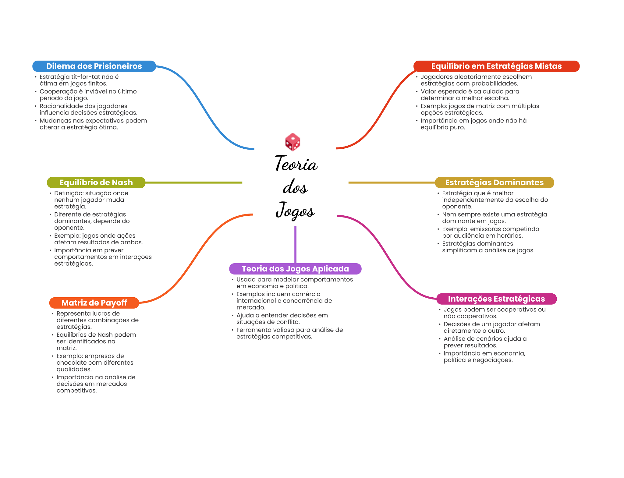 Dilema dos Prisioneiros Equilíbrio em Estratégias Mistas Estratégia tit-for-tat não é Jogadores aleatoriamente escolhem ótima em jogos finitos. estratégias com probabilidades. Cooperação é inviável no último Valor esperado é calculado para período do jogo. determinar a melhor escolha. Racionalidade dos jogadores Exemplo: jogos de matriz com múltiplas influencia decisões estratégicas. opções estratégicas. Mudanças nas expectativas podem Importância em jogos onde não há alterar a estratégia ótima. equilíbrio puro. Teoria Equilíbrio de Nash dos Estratégias Dominantes Definição: situação onde Estratégia que é melhor nenhum jogador muda independentemente da escolha do estratégia. Jogos oponente. Diferente de estratégias Nem sempre existe uma estratégia dominantes, depende do dominante em jogos. oponente. Exemplo: emissoras competindo Exemplo: jogos onde ações por audiência em horários. afetam resultados de ambos. Estratégias dominantes Importância em prever simplificam a análise de jogos. comportamentos em interações estratégicas. Teoria dos Jogos Aplicada Usada para modelar comportamentos em economia e política. Exemplos incluem comércio Matriz de Payoff internacional e concorrência de Interações Estratégicas mercado. Jogos podem ser cooperativos ou Representa lucros de Ajuda a entender decisões em não cooperativos. diferentes combinações de situações de conflito. estratégias. Decisões de um jogador afetam Ferramenta valiosa para análise de diretamente O outro. Equilíbrios de Nash podem estratégias competitivas. ser identificados na Análise de cenários ajuda a matriz. prever resultados. Exemplo: empresas de Importância em economia, chocolate com diferentes política e negociações. qualidades. Importância na análise de decisões em mercados competitivos.