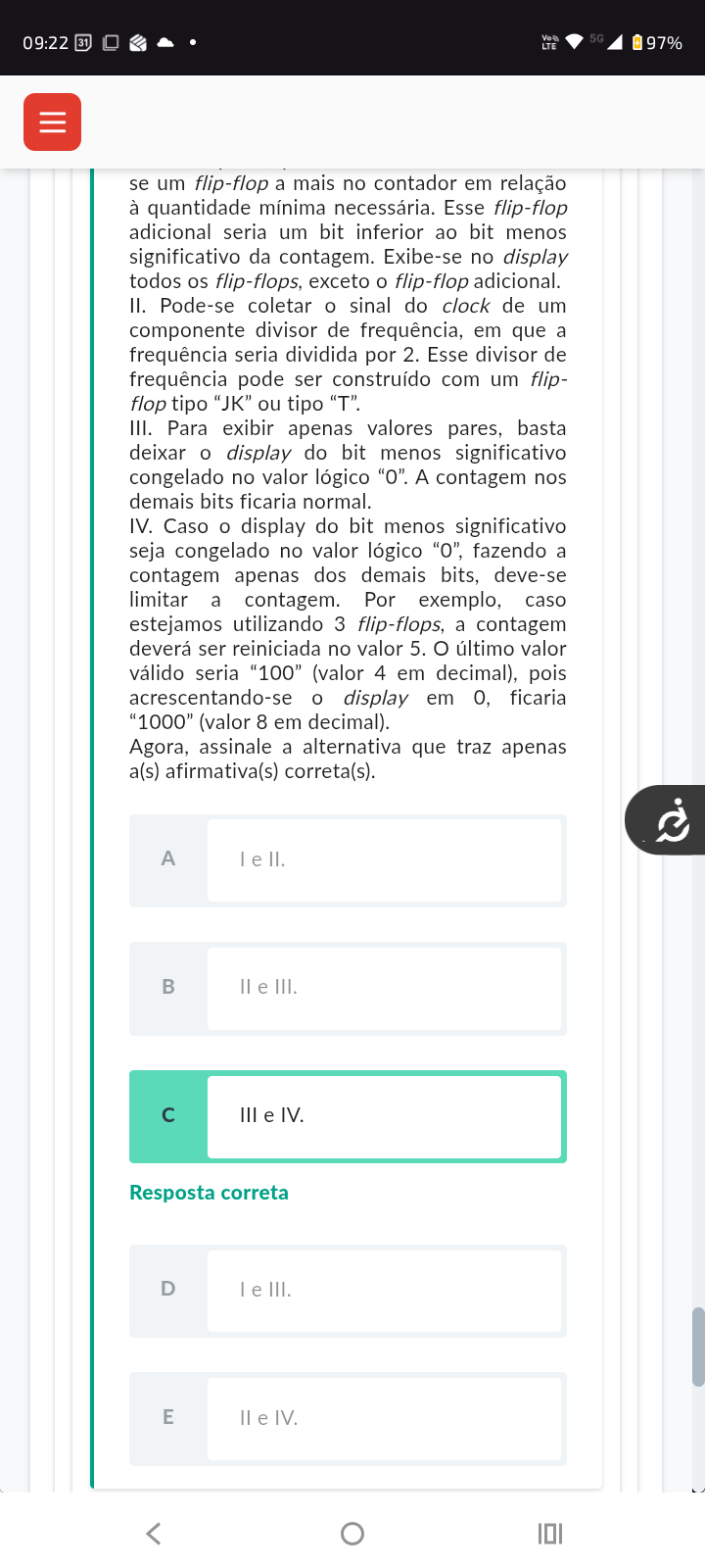 09:22 5G LTE 97% se um flip-flop a mais no contador em relação à quantidade mínima necessária. Esse flip-flop adicional seria um bit inferior ao bit menos significativo da contagem. Exibe-se no display todos os flip-flops, exceto flip-flop adicional. II. Pode-se coletar sinal do clock de um componente divisor de frequência, em que a frequência seria dividida por 2. Esse divisor de frequência pode ser construído com um flip- flop tipo "JK" ou tipo "T". III. Para exibir apenas valores pares, basta deixar O display do bit menos significativo congelado no valor lógico A contagem nos demais bits ficaria normal. IV. Caso O display do bit menos significativo seja congelado no valor lógico fazendo a contagem apenas dos demais bits, deve-se limitar a contagem. Por exemplo, caso estejamos utilizando 3 flip-flops, a contagem deverá ser reiniciada no valor 5. último valor válido seria "100" (valor 4 em decimal), pois acrescentando-se display em ficaria "1000" (valor 8 em decimal). Agora, assinale a alternativa que traz apenas a(s) afirmativa(s) correta(s). A e II. B III. III e IV. Resposta correta D e III. E e IV.