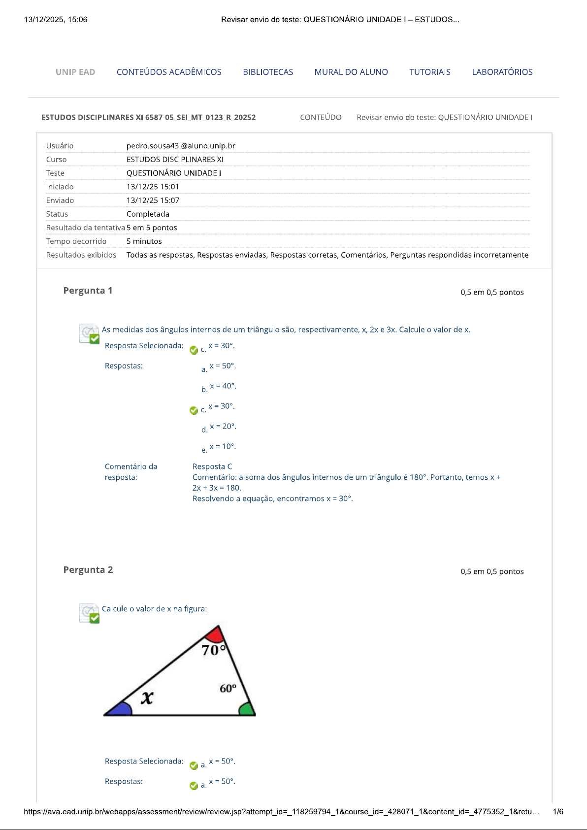 13/12/2025, 15:06 Revisar envio do teste: QUESTIONÁRIO UNIDADE ESTUDOS... UNIP EAD CONTEÚDOS ACADÊMICOS BIBLIOTECAS MURAL DO ALUNO TUTORIAIS LABORATÓRIOS ESTUDOS DISCIPLINARES XI 6587-05_SEI_MT_0123_R_20252 CONTEÚDO Revisar envio do teste: QUESTIONÁRIO UNIDADE Usuário pedro.sousa43@aluno.unip.br Curso ESTUDOS DISCIPLINARES XI Teste QUESTIONÁRIO UNIDADE I Iniciado 13/12/25 15:01 Enviado 13/12/25 15:07 Status Completada Resultado da tentativa 5 em 5 pontos Tempo decorrido 5 minutos Resultados exibidos Todas as respostas, Respostas enviadas, Respostas corretas, Comentários, Perguntas respondidas incorretamente Pergunta 1 0,5 em 0,5 pontos As medidas dos ângulos internos de um triângulo são, respectivamente, X, e Calcule valor de X. Resposta Selecionada: Respostas: b. e. Comentário da Resposta resposta: Comentário: a soma dos ângulos internos de um triângulo é 180°. Portanto, temos X+ + 3x = 180. Resolvendo a equação, encontramos 30°. Pergunta 2 0,5 em 0,5 pontos Calcule valor de X na figura: 70° 60° x Resposta Selecionada: a. Respostas: a. 1/613/12/2025, 15:06 Revisar envio do teste: QUESTIONÁRIO UNIDADE - ESTUDOS... Comentário da resposta: Resposta: A Comentário: a soma dos ângulos internos de um triângulo é 180°. Portanto, temos X + 70 + 180. Resolvendo a equação, encontramos X = 50°. Pergunta 3 0,5 em 0,5 pontos Considere a seguinte figura: A P R T M S U Q Marque a alternativa correta: Resposta e. Selecionada: ponto Mé circuncentro e os segmentos PQ, RS e TU são as mediatrizes do triângulo. Respostas: a. ponto M é o ortocentro e os segmentos PQ, RS e TU são as mediatrizes do triângulo. b. ponto M é o circuncentro e os segmentos PQ, RS e TU são as medianas do triângulo. ponto Mé baricentro e os segmentos PQ, RS e TU são as alturas do triângulo. d. ponto Mé incentro e os segmentos PQ, RS e TU são as mediatrizes do triângulo. e. ponto Mé o circuncentro e os segmentos PQ, RS e TU são as mediatrizes do triângulo. Comentário da Resposta: E resposta: Comentário: como os segmentos PQ, RS e TU formam um ângulo perpendicular com os lados do triângulo a partir do seu ponto médio, estes são as mediatrizes do triângulo. Sabendo que encontro das mediatrizes é chamado de circuncentro, a alternativa E está correta. Pergunta 4 0,5 em 0,5 pontos Considere a seguinte figura: 2/613/12/2025, 15:06 Revisar envio do teste: QUESTIONÁRIO UNIDADE I - ESTUDOS... A R P M T Marque a alternativa correta: Resposta ponto M é ortocentro e os segmentos AT, BR e CP são as alturas do triângulo. a. Selecionada: Respostas: ponto M é o ortocentro e os segmentos AT, BR e são as alturas do triângulo. a. b. ponto M é circuncentro e os segmentos AT, BR e CP são as bissetrizes do triângulo. ponto M é ortocentro e os segmentos AT, BR e CP são as medianas do triângulo. d. ponto Mé incentro e os segmentos AT, BR e são as alturas do triângulo. e. ponto Mé circuncentro e os segmentos AT, BR e são as mediatrizes do triângulo. Comentário da Resposta: A resposta: Comentário: como os segmentos AT, BR e CP são perpendiculares a um dos lados do triângulo, traçados pelo seu vértice oposto, estes são as alturas do triângulo. Sabendo que encontro das alturas é chamado de ortocentro, a alternativa A está correta. Pergunta 5 0,5 em 0,5 pontos Considere a seguinte figura: A Q M U Marque a alternativa correta: Resposta d. Selecionada: ponto Mé baricentro e os segmentos AU, BS e CQ são as medianas do triângulo. Respostas: ponto Mé ortocentro e os segmentos AU, BS e CQ são as alturas do triângulo. a. b. ponto Mé baricentro e os segmentos AU, BS e CQ são as bissetrizes do triângulo. C. ponto Mé ortocentro e os segmentos AU, BS e CQ são as medianas do triângulo. d. ponto Mé baricentro e os segmentos AU, BS e CQ são as medianas do triângulo. e. ponto M é circuncentro e os segmentos AU, BS e CQ são as mediatrizes do triângulo. Comentário da Resposta: D resposta: Comentário: como os segmentos AU, BS e CQ estão unindo cada vértice do triângulo ao ponto 3/613/12/2025, 15:06 Revisar envio do teste: QUESTIONÁRIO UNIDADE - médio do lado oposto, estes são as medianas do triângulo. Sabendo que encontro das medianas é chamado de baricentro, a alternativa D está correta. Pergunta 6 0,5 em 0,5 pontos Determine perímetro do triângulo equilátero ABC: A 2x y B C Resposta Selecionada: d. 45. Respostas: a. 15. b. 25. 35. d. 45. e. 55. Comentário da Resposta: D resposta: Comentário: como o triângulo ABC é equilátero, todos os lados são iguais. Sendo assim, temos que + 2y y +3 e y Resolvendo a primeira equação, encontramos y = 3. Substituindo na segunda, encontramos X = 9. Assim, podemos concluir que os lados do triângulo medem 15 e, assim, seu perímetro mede 45. Pergunta 7 0,5 em 0,5 pontos Quanto aos softwares de geometria dinâmica, quais das afirmações estão corretas? São ambientes virtuais utilizados no ensino e aprendizagem de geometria. Permitem a construção de entes geométricos a partir das propriedades que os definem. III Nos softwares de geometria dinâmica utilizamos apenas uma régua virtual. IV É uma nova geometria. Resposta Selecionada: e II. a. Respostas: a. e C. I, II, III, IV. d. I, II, IV. e. II, IV. Comentário Resposta: A da resposta: Comentário: nos softwares de geometria dinâmica são utilizados régua e compasso virtuais, por isso a afirmação III é falsa. Além disso, a geometria dinâmica não é uma nova geometria, apenas 4/613/12/2025, 15:06 Revisar envio do teste: QUESTIONÁRIO UNIDADE I ESTUDOS... uma ferramenta para seu ensino e aprendizagem. termo "dinâmico" se refere à possibilidade de movimento durante estudo das formas geométricas. Portanto, apenas as alternativas e são verdadeiras. Pergunta 8 0,5 em 0,5 pontos Sabendo que triângulo ABC é equilátero, determine X e y: A 14 y 12 C Resposta Selecionada: d.x=5ey=2. Respostas: a.x=2ey=5. b.x=3ey=5. c.x=2ey=3. d.x=5ey=2. e.x=3ey=3. Comentário da 