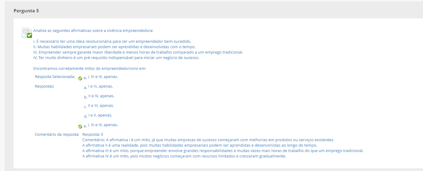 Pergunta 5 Analise as seguintes afirmativas sobre a vivência empreendedora: I. É necessário ter uma ideia revolucionária para ser um empreendedor bem-sucedido. II. Muitas habilidades empresariais podem ser aprendidas e desenvolvidas com tempo. III. Empreender sempre garante maior liberdade e menos horas de trabalho comparado a um emprego tradicional. IV. Ter muito dinheiro é um pré-requisito indispensável para iniciar um negócio de sucesso. Encontramos corretamente mitos do empreendedorismo em: Resposta Selecionada: e. I, III e IV, apenas. Respostas: a. le III, apenas. b. II e IV, apenas. C. II e III, apenas. d. e II, apenas. e. I, III e IV, apenas. Comentário da resposta: Resposta: E Comentário: A afirmativa I é um mito, já que muitas empresas de sucesso começaram com melhorias em produtos ou serviços existentes. A afirmativa é uma realidade, pois muitas habilidades empresariais podem ser aprendidas e desenvolvidas ao longo do tempo. A afirmativa III é um mito, porque empreender envolve grandes responsabilidades e muitas vezes mais horas de trabalho do que um emprego tradicional. A afirmativa IV é um mito, pois muitos negócios começaram com recursos limitados e cresceram gradualmente.