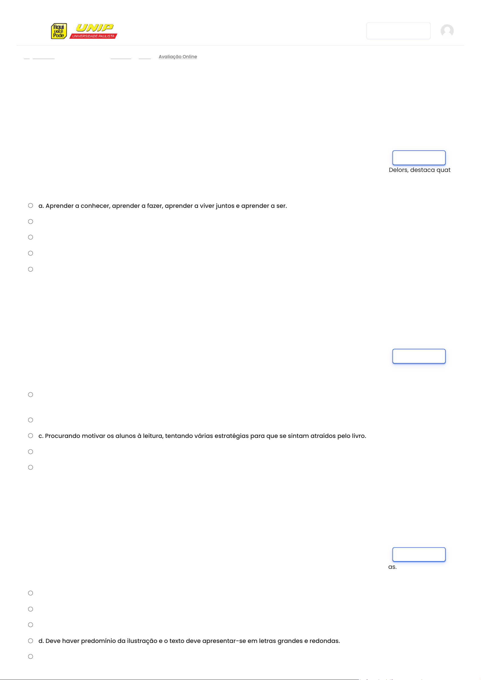 21/09/2020 Avaliação Online www.unipvirtual.com.br/avaunip/mod/quiz/attempt.php?attempt=3097206&cmid=63411 1/4 - Minhas disciplinas - - - Bibliotecas Virtuais Página inicial S6-L0091 Geral Avaliação Online O Relatório da Unesco, redigido pela Comissão Internacional sobre Educação para o Século XXI, coordenada por Jacques Delors, destaca quatro pilares que devem nortear a educação mundial. Assinale a alternativa que apresenta esses “quatro pilares da educação”: Escolha uma: a. Aprender a conhecer, aprender a fazer, aprender a viver juntos e aprender a ser. b. Aprender a aprender, aprender a raciocinar, aprender a ser e aprender a fazer. c. Solidariedade, cientificidade, pesquisa e conhecimento. d. Descrever, apreender, conviver e compreender. e. Sucesso escolar, inclusão, culturalidade e diversidade. Se a leitura deve ser um prazer, como o educador deve ajudar o aluno a tomar gosto pela leitura? Escolha uma: a. Substituindo a leitura por filmes ou desenhos que sejam sobre a história que seria lida, destacando que tanto o filme/desenho substitui a leitura. b. Obrigando o aluno a ler livros, ou obrigando o aluno a ouvir a leitura de livros que o educador percebe que não agradam. c. Procurando motivar os alunos à leitura, tentando várias estratégias para que se sintam atraídos pelo livro. d. Substituindo a atividade de leitura pela aula de artes. e. Não insistir na atividade de leitura, deixando os alunos decidirem o que querem ler quando forem mais velhos. Assinale a alternativa correta em relação à apresentação do livro no processo de incentivo à leitura das crianças pequenas. Escolha uma: a. O excesso de ilustrações é fundamental para a criança nessa fase. b. O livro infantil não deve apresentar nenhum tipo de ilustração. c. À medida que a criança evolui na leitura, devem-se ampliar as ilustrações que acompanham o texto. d. Deve haver predomínio da ilustração e o texto deve apresentar-se em letras grandes e redondas. e. A ilustração apresenta a leitura que um artista fez do texto feito por outro artista (o escritor), portanto, deve-se evitar o exagero de Marcar questão Questão 1 Ainda não respondida Vale 1,00 ponto(s). Marcar questão Questão 2 Ainda não respondida Vale 1,00 ponto(s). Marcar questão Questão 3 Ainda não respondida Vale 1,00 ponto(s). http://www.unipvirtual.com.br/avaunip http://www.unipvirtual.com.br/avaunip/ http://www.unipvirtual.com.br/avaunip/course/view.php?id=2664 http://www.unipvirtual.com.br/avaunip/course/view.php?id=2664#section-0 http://www.unipvirtual.com.br/avaunip/mod/quiz/view.php?id=63411 Samsung Realce Samsung Realce Samsung Realce 21/09/2020 Avaliação Online www.unipvirtual.com.br/avaunip/mod/quiz/attempt.php?attempt=3097206&cmid=63411 2/4 ilustrações. Para Maria Antonieta Cunha (2003), o essencial em uma narração é ser agradável ao espírito infantil. Acerca disso, assinale a alternativa correta: Escolha uma: a. O diálogo torna a leitura muito menos interessante dentro de uma narrativa. b. Toda e qualquer narrativa, independente de seu desfecho, seja ela feliz ou infeliz, desperta a atenção da criança, uma vez que ela se identifica com as personagens da história. c. O diálogo é sempre agradável para as crianças, uma vez que ele atualiza a cena. d. Todos os processos, planos narrativos utilizados em um romance para adulto devem ser empregados em uma obra infantil. e. Entre os recursos narrativos fundamentais à criança, podemos destacar a ironia crítica como estratégia de linguagem de todo e qualquer texto humorístico infantil. O questionamento das finalidades da ciência moderna, das especializações e das tecnologias configurou, globalmente, um movimento epistemológico pela interdisciplinaridade. Considerando o movimento pela interdisciplinaridade na educação brasileira, assinale a afirmativa correta. Escolha uma: a. Os questionamentos que o movimento pela interdisciplinaridade faz à disciplinaridade do currículo escolar têm pouca importância para o pensamento pedagógico crítico. b. Os teóricos da Pedagogia que desencadearam o movimento pela interdisciplinaridade têm como expoente Ivani Fazenda. c. Os teóricos da Pedagogia que se opuseram ao movimento pela interdisciplinaridade são representados por Hilton Japiassú. d. Os níveis de integração dos conhecimentos compõem um gradiente de pouca importância para se definir a interdisciplinaridade. e. As concepções atuais de interdisciplinaridade apresentam uniformidade no que diz respeito à terminologia, aos pressupostos teóricos e às abordagens metodológicas. Observe as seguintes características: I. Parte do diálogo entre diferentes formas de conhecimento. II. Busca a ousadia e o exercício da pesquisa. III. A diferença é parte do trabalho. IV. Parte do paradigma emergente do conhecimento. Essas características se referem a uma prática que: Marcar questão Questão 4 Ainda não respondida Vale 1,00 ponto(s). Marcar questão Questão 5 Ainda não respondida Vale 1,00 ponto(s). Marcar questão Questão 6 Ainda não respondida Vale 1,00 ponto(s). Samsung Realce Samsung Realce 21/09/2020 Avaliação Online www.unipvirtual.com.br/avaunip/mod/quiz/attempt.php?attempt=3097206&cmid=63411 3/4 Escolha uma: a. Prima pela integração dos saberes que são tidos como os saberes das minorias oprimidas no contexto global. b. Traz o tecnicismo em sua prática e o conhecimento é o instrumento de ação dos saberes. c. Conjuga os princípios da globalização dos conhecimentos com os da homogeneidade para o trabalho com os conteúdos. d. Traz o saber da experiência e o empirismo em sua base para a construção de novos saberes. e. Tem a interdisciplinaridade e a globalização do conhecimento como princípios para o tratamento dos conteúdos. A justificativa para a hierarquização dos conhecimentos e dos conteúdos escolares não encontra sustentação na perspectiva dos PCNs. Assinale a alternativa que corrobora e