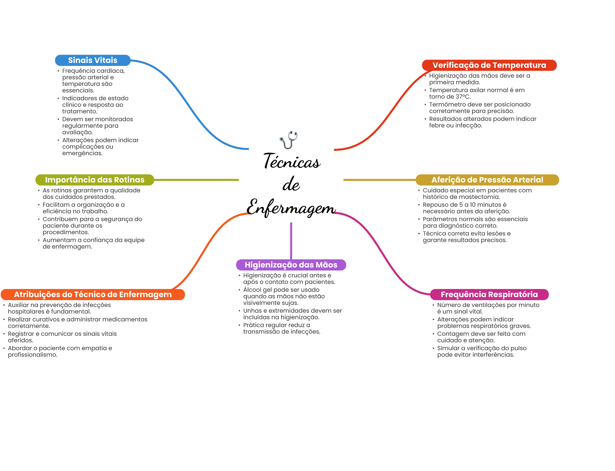 Sinais Vitais Verificação de Temperatura Frequência cardíaca, pressão arterial e Higienização das mãos deve ser a temperatura são primeira medida. essenciais. Temperatura axilar normal é em Indicadores de estado torno de 37°C. clínico e resposta ao Termômetro deve ser posicionado tratamento. corretamente para precisão. Devem ser monitorados Resultados alterados podem indicar regularmente para febre ou infecção. avaliação. Alterações podem indicar complicações ou emergências. Técnicas Importância das Rotinas de Aferição de Pressão Arterial As rotinas garantem a qualidade Cuidado especial em pacientes com dos cuidados prestados. histórico de mastectomia. Facilitam a organização e a eficiência no trabalho. Enfermagem Repouso de 5 a 10 minutos é necessário antes da aferição. Contribuem para a segurança do Parâmetros normais são essenciais paciente durante OS para diagnóstico correto. procedimentos. Técnica correta evita lesões e Aumentam a confiança da equipe garante resultados precisos. de enfermagem. Higienização das Mãos Higienização é crucial antes e após contato com pacientes. Álcool gel pode ser usado Atribuições do Técnico de Enfermagem quando as mãos não estão Frequência Respiratória Auxiliar na prevenção de infecções visivelmente sujas. Número de ventilações por minuto hospitalares é fundamental. Unhas e extremidades devem ser é um sinal vital. Realizar curativos e administrar medicamentos incluídas na higienização. Alterações podem indicar corretamente. Prática regular reduz a problemas respiratórios graves. Registrar e comunicar sinais vitais transmissão de infecções. Contagem deve ser feita com aferidos. cuidado e atenção. Abordar o paciente com empatia e Simular a verificação do pulso profissionalismo. pode evitar interferências.