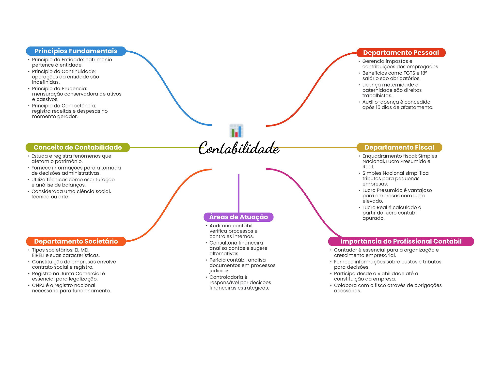 Princípios Fundamentais Departamento Pessoal Princípio da Entidade: patrimônio Gerencia impostos e pertence à entidade. contribuições dos empregados. Princípio da Continuidade: Benefícios como FGTS e 13° operações da entidade são salário são obrigatórios. indefinidas. Licença maternidade e Princípio da Prudência: paternidade são direitos mensuração conservadora de ativos trabalhistas. e passivos. Auxílio-doença é concedido Princípio da Competência: após 15 dias de afastamento. registra receitas e despesas no momento gerador. Conceito de Contabilidade Contabilidade Departamento Fiscal Estuda e registra fenômenos que Enquadramento fiscal: Simples afetam patrimônio. Nacional, Lucro Presumido e Fornece informações para a tomada Real. de decisões administrativas. Simples Nacional simplifica Utiliza técnicas como escrituração tributos para pequenas e análise de balanços. empresas. Considerada uma ciência social, Lucro Presumido é vantajoso técnica ou arte. para empresas com lucro elevado. Lucro Real é calculado a partir do lucro contábil Áreas de Atuação apurado. Auditoria contábil verifica processos e controles internos. Departamento Societário Consultoria financeira Importância do Profissional Contábil Tipos societários: MEI, analisa contas e sugere Contador é essencial para a organização e EIRELI e suas características. alternativas. crescimento empresarial. Constituição de empresas envolve Perícia contábil analisa Fornece informações sobre custos e tributos contrato social e registro. documentos em processos para decisões. Registro na Junta Comercial é judiciais. Participa desde a viabilidade até a essencial para legalização. Controladoria é constituição da empresa. CNPJ é registro nacional responsável por decisões necessário para funcionamento. financeiras estratégicas. Colabora com fisco através de obrigações acessórias.