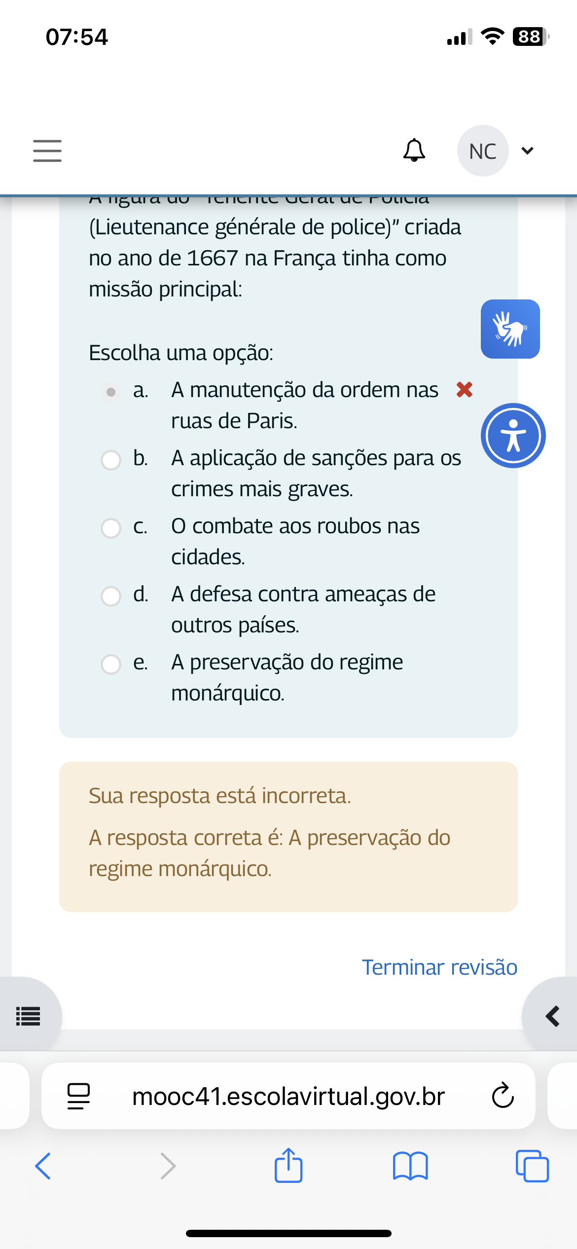 07:54 88 NC (Lieutenance générale de police)" criada no ano de 1667 na França tinha como missão principal: Escolha uma opção: a. A manutenção da ordem nas ruas de Paris. b. A aplicação de sanções para os crimes mais graves. combate aos roubos nas cidades. d. A defesa contra ameaças de outros países. e. A preservação do regime monárquico. Sua resposta está incorreta. A resposta correta é: A preservação do regime monárquico. Terminar revisão