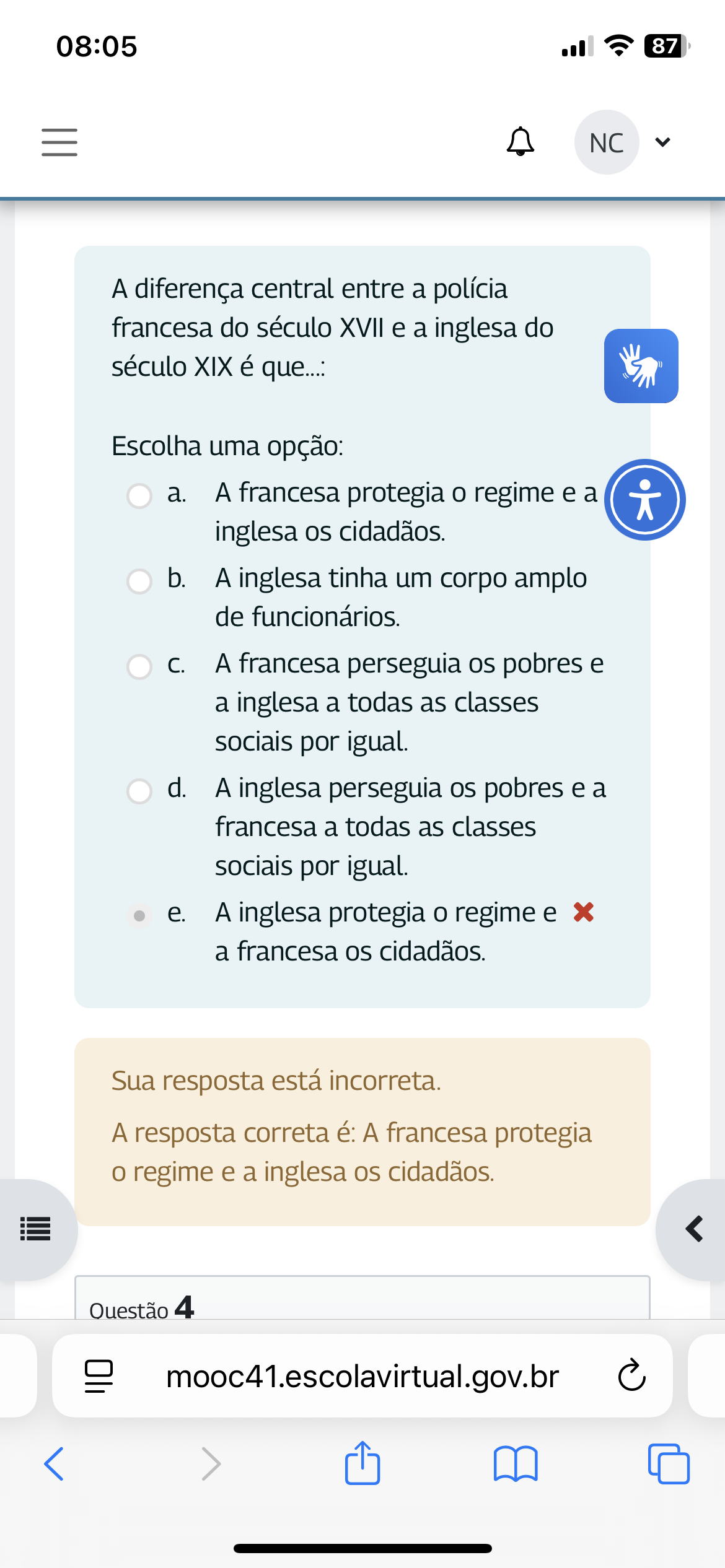 08:05 87 NC A diferença central entre a polícia francesa do século XVII e a inglesa do século XIX é que...: Escolha uma opção: a. A francesa protegia regime e a inglesa os cidadãos. b. A inglesa tinha um corpo amplo de funcionários. A francesa perseguia os pobres e a inglesa a todas as classes sociais por igual. d. A inglesa perseguia pobres e a francesa a todas as classes sociais por igual. e. A inglesa protegia regime e a francesa os cidadãos. Sua resposta está incorreta. A resposta correta é: A francesa protegia regime e a inglesa cidadãos. 4 mooc41.escolavirtual.gov.br