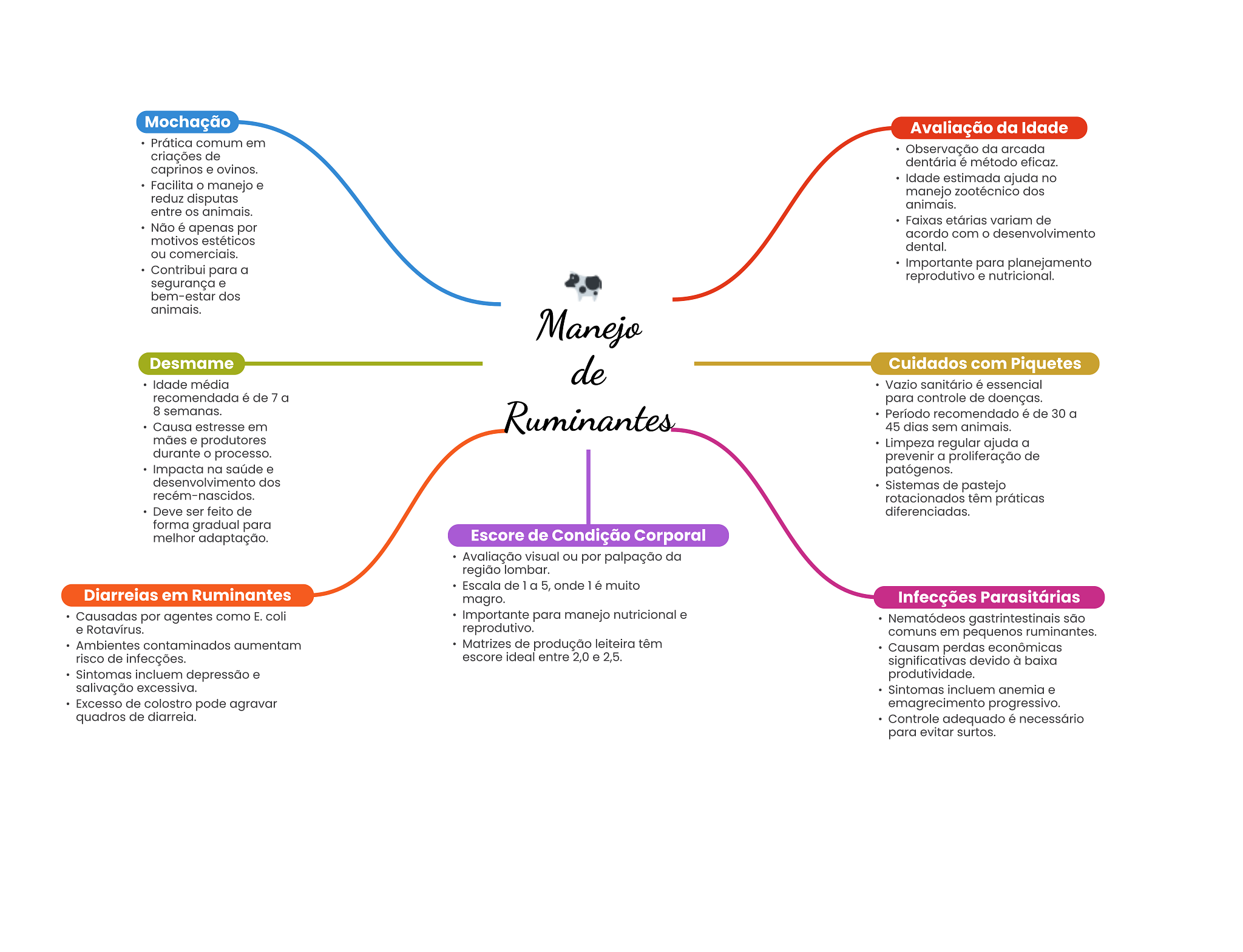 Mochação Avaliação da Idade Prática comum em Observação da arcada criações de dentária é método eficaz. caprinos e ovinos. Idade estimada ajuda no Facilita manejo e manejo zootécnico dos reduz disputas animais. entre animais. Faixas etárias variam de Não é apenas por acordo com desenvolvimento motivos estéticos dental. ou comerciais. Importante para planejamento Contribui para a reprodutivo e nutricional. segurança e bem-estar dos animais. Manejo Desmame de Cuidados com Piquetes Idade média Vazio sanitário é essencial recomendada é de 7 a para controle de doenças. 8 semanas. Ruminantes Período recomendado é de 30 a Causa estresse em 45 dias sem animais. mães e produtores Limpeza regular ajuda a durante processo. prevenir a proliferação de Impacta na saúde e patógenos. desenvolvimento dos Sistemas de pastejo recém-nascidos. rotacionados têm práticas Deve ser feito de diferenciadas. forma gradual para melhor adaptação. Escore de Condição Corporal Avaliação visual ou por palpação da região lombar. Escala de 1 a 5, onde lé muito Diarreias em Ruminantes magro. Infecções Parasitárias Causadas por agentes como E. coli Importante para manejo nutricional e Nematódeos gastrintestinais são e Rotavírus. reprodutivo. comuns em pequenos ruminantes. Ambientes contaminados aumentam Matrizes de produção leiteira têm Causam perdas econômicas risco de infecções. escore ideal entre 2,0 e 2,5. significativas devido à baixa Sintomas incluem depressão e produtividade. salivação excessiva. Sintomas incluem anemia e Excesso de colostro pode agravar emagrecimento progressivo. quadros de diarreia. Controle adequado é necessário para evitar surtos.