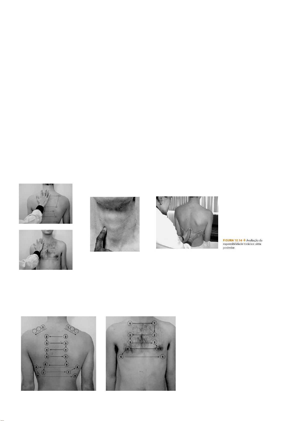 ROTEIRO AULA PRÁTICA – EXAME FÍSICO DO SISTEMA RESPIRATÓRIO Preparo: Ambiente: paciente despido da cintura para cima, no caso de mulheres permanecer de sutiã, se de camisola, peça para abrir na parte de trás. Cercar com biombos. Higienização das mãos. Materiais: estetoscópio, algodão com álcool. Sequência do exame: começar logo após a palpação da tireoide, quando estiver de pé atrás da pessoa. Realizar inspeção, palpação, percussão e ausculta no tórax posterior e laterais. Mover a face da pessoa e repetir as manobras no tórax anterior. Sentido do ápice para as bases pulmonares. Semiotécnica: 1. Inspeção Técnica: paciente sentado observe: Inspeção estática: - Condições da pele e distribuição dos pelos - Forma e contorno do tórax: simétrico, formato elíptico normal, tonel (barril), funil (pectus excavatum), peito de pombo (pectus carinatum), cifoescoliose; anormalidades assimétricas do tórax. Verificar relação entre diâmetro anteroposterior e transverso. Anteroposterior deve ser
