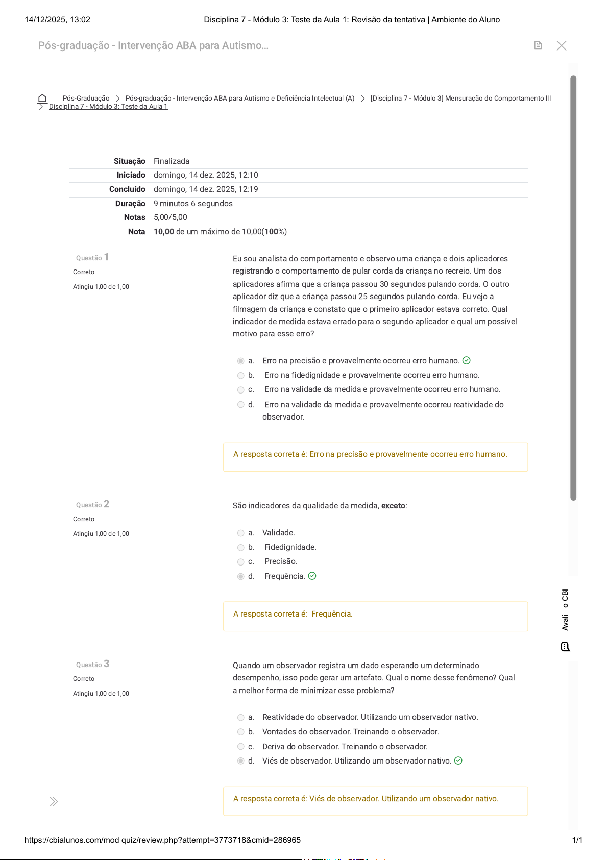 Pós-Graduação Pós-graduação - Intervenção ABA para Autismo e Deficiência Intelectual (A) [Disciplina 7 - Módulo 3] Mensuração do Comportamento III Disciplina 7 - Módulo 3: Teste da Aula 1 Questão 1 Correto Atingiu 1,00 de 1,00 Questão 2 Correto Atingiu 1,00 de 1,00 Questão 3 Correto Atingiu 1,00 de 1,00 Eu sou analista do comportamento e observo uma criança e dois aplicadores registrando o comportamento de pular corda da criança no recreio. Um dos aplicadores afirma que a criança passou 30 segundos pulando corda. O outro aplicador diz que a criança passou 25 segundos pulando corda. Eu vejo a filmagem da criança e constato que o primeiro aplicador estava correto. Qual indicador de medida estava errado para o segundo aplicador e qual um possível motivo para esse erro? a. Erro na precisão e provavelmente ocorreu erro humano. b. Erro na fidedignidade e provavelmente ocorreu erro humano. c. Erro na validade da medida e provavelmente ocorreu erro humano. d. Erro na validade da medida e provavelmente ocorreu reatividade do observador. A resposta correta é: Erro na precisão e provavelmente ocorreu erro humano. São indicadores da qualidade da medida, exceto: a. Validade. b. Fidedignidade. c. Precisão. d. Frequência. A resposta correta é: Frequência. Quando um observador registra um dado esperando um determinado desempenho, isso pode gerar um artefato. Qual o nome desse fenômeno? Qual a melhor forma de minimizar esse problema? a. Reatividade do observador. Utilizando um observador nativo. b. Vontades do observador. Treinando o observador. c. Deriva do observador. Treinando o observador. d. Viés de observador. Utilizando um observador nativo. A resposta correta é: Viés de observador. Utilizando um observador nativo. Situação Finalizada Iniciado domingo, 14 dez. 2025, 12:10 Concluído domingo, 14 dez. 2025, 12:19 Duração 9 minutos 6 segundos Notas 5,00/5,00 Nota 10,00 de um máximo de 10,00(100%) Av al ie o C BI Pós-graduação - Intervenção ABA para Autismo… 14/12/2025, 13:02 Disciplina 7 - Módulo 3: Teste da Aula 1: Revisão da tentativa | Ambiente do Aluno https://cbialunos.com/mod/quiz/review.php?attempt=3773718&cmid=286965 1/1 https://cbialunos.com/course/index.php?categoryid=7 https://cbialunos.com/course/view.php?id=349 https://cbialunos.com/course/section.php?id=13225 https://cbialunos.com/mod/quiz/view.php?id=286965 https://cbialunos.com/my/courses.php https://cbialunos.com/course/view.php?id=349 https://cbialunos.com/course/view.php?id=349&mb2sct=24