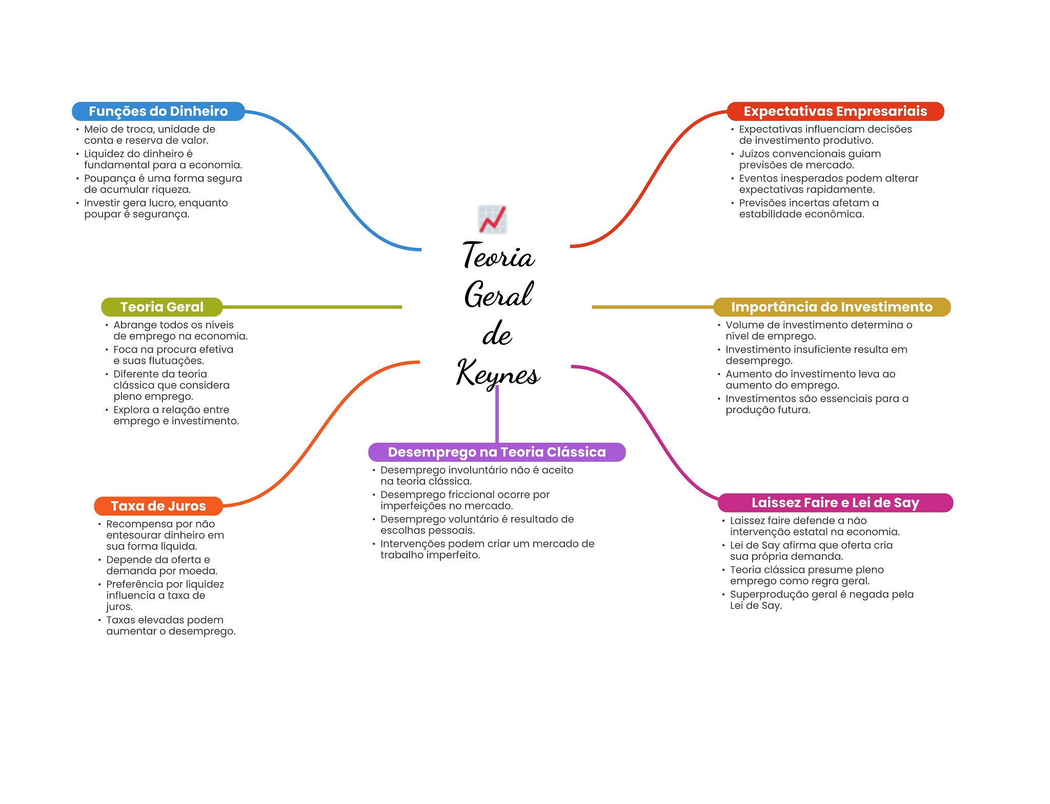 Funções do Dinheiro Expectativas Empresariais Meio de troca, unidade de Expectativas influenciam decisões conta e reserva de valor. de investimento produtivo. Liquidez do dinheiro é Juízos convencionais guiam fundamental para a economia. previsões de mercado. Poupança é uma forma segura Eventos podem alterar de acumular riqueza. expectativas rapidamente. Investir gera lucro, enquanto Previsões incertas afetam a poupar é segurança. N estabilidade econômica. Teoria Geral Teoria Geral Importância do Investimento Abrange todos níveis de emprego na economia. de Volume de investimento determina nível de emprego. Foca na procura efetiva Investimento insuficiente resulta em e suas flutuações. desemprego. Diferente da teoria clássica que considera Keynes Aumento do investimento leva ao aumento do emprego. pleno emprego. Investimentos são essenciais para a Explora a relação entre produção futura. emprego e investimento. Desemprego na Teoria Clássica Desemprego involuntário não é aceito na teoria clássica. Desemprego friccional ocorre por Taxa de Juros imperfeições no mercado. Laissez Faire e Lei de Say Recompensa por não Desemprego voluntário é resultado de Laissez faire defende a não entesourar dinheiro em escolhas pessoais. intervenção estatal na economia. sua forma líquida. Intervenções podem criar um mercado de Lei de Say afirma que oferta cria Depende da oferta e trabalho imperfeito. sua própria demanda. demanda por moeda. Teoria clássica presume pleno Preferência por liquidez emprego como regra geral. influencia a taxa de Superprodução geral é negada pela juros. Lei de Say. Taxas elevadas podem aumentar desemprego.