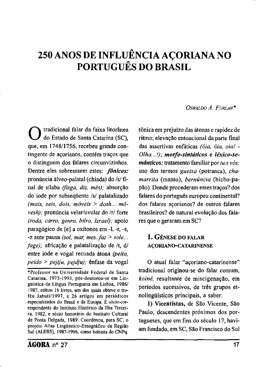 250 ANOS DE INFLUÊNCIA AÇORIANA NO PORTUGUÊS DO BRASIL OSWALDO A. FURLAN* O tradicional falar da faixa litorânea do Estado de Santa Catarina (SC), que, em 1748/1756, recebeu grande con- tingente de açorianos, contém traços que o distinguem dos falares circunvizinhos. Dentre eles sobressaem estes: fônicos: pronúncia álveo-palatal (chiada) do /s/ fi- nal de sílaba (fisga, diz, mês); absorção do iode por subseqüente /s/ palatalizado (mais, seis, dois, móveis > dosh... mó- vesh); pronúncia velar/uvular do /r/ forte (roda, carro, genro, bilro, Israel); apoio paragógico de [e] a oxítonos em -1, -r, -s, -z ante pausa (sol, mar, mes, faz > sole... fage); africação e palatalização de /t, d/ entre iode e vogal recuada átona (peito, peido > pejtju, pejdju); ênfase da vogal *Professor na Universidade Federal de Santa Catarina, 1973-1993, pós-doutorou-se em Lin- güística da Língua Portuguesa em Lisboa, 1986/ 1987, editou 16 livros, um dos quais obteve o tro- féu Jabuti/1997, e 26 artigos em periódicos especializados do Brasil e da Europa. É sócio-cor- respondente do Instituto Histórico da Ilha Tercei- ra, 1982, e sócio honorário do Instituto Cultural de Ponta Delgada, 1989. Coordenou, para SC, o projeto Atlas Lingüístico-Etnográfico da Região Sul (ALERS), 1987-1996, como bolsista do CNPq. tônica em prejuízo das átonas e rapidez de ritmo; elevação entoacional da parte final das assertivas enfáticas (óia, óia, oia! - Olha...!); morfo-sintáticos e léxico-se- mânticos: tratamento familiar por tu x vós; uso dos termos gueixa (potranca), áa- marrita (manto), bernúncia (bicho-pa- pão). Donde procederam esses traços? dos falares do português europeu continental? dos falares açorianos? de outros falares brasileiros? de natural evolução dos fala- res que o geraram em SC? 1. GÊNESE DO FALAR AÇORIANO-CATARINENSE O atual falar "açoriano-catarinense" tradicional originou-se do falar comum, koiné, resultante de miscigenação, em períodos sucessivos, de três grupos et- nolingüísticos principais, a saber: 1) Vicentistas, de São Vicente, São Paulo, descendentes próximos dos por- tugueses, que em fins do século 17, havi- am fundado, em SC, São Francisco do Sul ÁGORA n° 27 17 250 ANOS DE INFLUENCIA AÇORIANA NO PORTUGUÊS DO BRASIL OSWALDO A. FUMAI (1658), Nossa Senhora do Desterro (1662), hoje Florianópolis e Laguna (1682), póvo- as que, em 1748, perfaziam 4.197 cathari- nenses; Açorianos, 6.071, mais de mil dos quais seguiram logo para o Estado do Rio Grande do Sul (RS): em 1748/1756, ele- varam em 144,6% os referidos 4.197; estabeleceram-se na parte central da fai- xa litorânea (Laguna ao rio Camboriú), havendo-se expandido a toda ela; provie- ram, segundo relação de 7.817 alistados, de: São Miguel, 326, 4,2%; Terceira, 912, 11,6%; Graciosa, 772, 9,9%; S. Jorge, 2.822, 36%; Pico, 1.776, 22,7%; Faial, 1.207, 15,4%; Madeira, 579 (PIAllA, 1983: 138-157); os descendentes daque- les 6.071, hoje cerca de 450 mil, dedica- ram-se à pesca e à lavoura artesanal no litoral de SC. (Note-se que as sucessivas levas que, desde 1450, povoaram as nove ilhas dos Açores (2.335 km2, hoje cerca de 290.000 hs) procederam de todos os recantos e camadas sociais de Portugal continental. Em Faial, S. Jorge e Pico, entre 1450/1473, juntaram-se flamengos, que cultivaram a pecuária.) Outros: várias centenas advindos de Portugal continental; mais numerosos, de póvoas da costa brasileira (Santos, Rio, Salvador...); muitíssimos, sobretudo des- de 1950, do interior de SC e Estados vi- zinhos, que vieram mais para concorrer com o "açoriano-catarinense" da área ru- ral e pesqueira do que para integrar-se a ele. Como se falava em Portugal continen- tal, nos Açores e em SC em 1750? Sendo impossível sintetizar resposta, vale dizer, grosso modo, que: I) a pronúncia do cen- tro-sul de Portugal continental e dos Aço- res teria tido os traços mais comuns do falares do Brasil de hoje; 2) o mesmo vale para a morfo-sintaxe, mas Portugal con- servava-se mais tradicional no uso de pro- nomes átonos e nas formas de tratamen- to, repudiando o você brasileiro, já regis- trado, para o Rio, por volta de 1800; 3) devia haver diferenças léxico-semânticas singificativas, já que o léxico constitui número aberto e que as situações cultu- rais das Ilhas e do Continente eram muito diversas. 2. QUESTÃO DA INFLUÊNCIA AÇORIANA NO PORTUGUÊS DO BRASIL BOLÉO, 1943, 45, 50, 74, 83, de Coimbra, empenhou-se por acumular in- dícios em prol de sua (hipó)tese de que haveria influência dos Açores no falar do Brasil, a qual lhe pareceu "evidente" em SC, em cuja Ilha homônima fez passagei- ra pesquisa em 1948. ROGERS, 1974, de Harvard, argüiu de não-sólidos os dados e argumentos de Boléo. No Brasil, LAYTANO, do RS, 1974, divulgou como 18 ÁGORA n° 27 OSWALDO A. FURLAN 250 ANOS DENUNCIA AÇORIANA NO PORTUGUÊS DO BRASIL seguras as idéias de Boléo; SILVA NETO, 1953 e 1970 fez cautelosas distinções. Para bem responder a essa indagação, o ideal seria fazer o que eles não fizeram: 1) escrever, ao menos aproximadamente, a gra- mática do português continental, açoriano e catarinense de 1750, bem como a do de hoje: em nível fônico, morfo-sintático e léxi- co-semântico; 2) definir o que se entende por "influência açoriana". Em Influência Açoriana no Portugu- ês do Brasil, 1989, 240 p., e em vários artigos editados em Portugal e no Brasil, propus-me responder à pergunta acima formulada. Para isso, levantei, analisei e comparei usos lingüísticos em diferen- tes tempos, regiões e classes sociais, so- bretudo de Portugal e do Brasil. As difi- culdades de tal pesquisa são imensas, de vez que as distâncias dos dados no tempo e no espaço são quase insuperáveis e que o estudo dos falares dos Açores e de SC começaram há poucas décadas, sem fri- sar que, em 250 anos, esses falares evo- luíram. Embora a matéria fosse bem mo- vediça, requerendo senso 