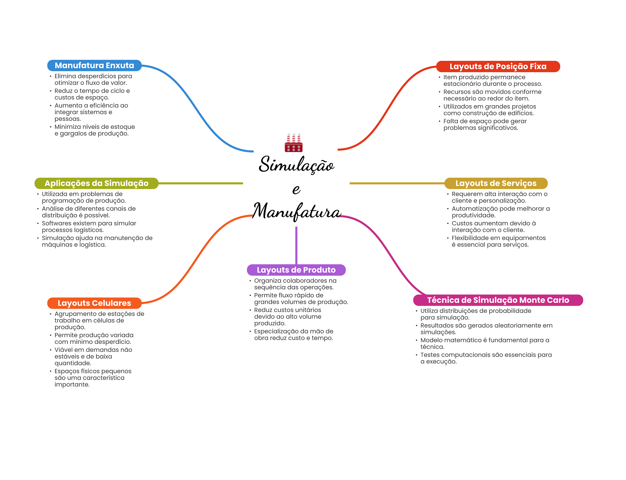 Manufatura Enxuta Layouts de Posição Fixa Elimina desperdícios para Item produzido permanece otimizar fluxo de valor. estacionário durante processo. Reduz tempo de ciclo e Recursos são movidos conforme custos de espaço. necessário ao redor do item. Aumenta a eficiência ao Utilizados em grandes projetos integrar sistemas e como construção de edifícios. pessoas. Falta de espaço pode gerar Minimiza níveis de estoque problemas significativos. e gargalos de produção. Simulação Aplicações da Simulação Layouts de Serviços Utilizada em problemas de e Requerem alta interação com programação de produção. cliente e personalização. Análise de diferentes canais de Manufatura Automatização pode melhorar a distribuição é possível. produtividade. Softwares existem para simular Custos aumentam devido à processos logísticos. interação com O cliente. Simulação ajuda na manutenção de Flexibilidade em equipamentos máquinas e logística. é essencial para serviços. Layouts de Produto Organiza colaboradores na sequência das operações. Permite fluxo rápido de Layouts Celulares grandes volumes de produção. Técnica de Simulação Monte Carlo Reduz custos unitários Agrupamento de estações de Utiliza distribuições de probabilidade devido ao alto volume trabalho em células de para simulação. produzido. produção. Resultados são gerados aleatoriamente em Especialização da mão de Permite produção variada simulações. obra reduz custo e tempo. com mínimo desperdício. Modelo matemático é fundamental para a Viável em demandas não técnica. estáveis e de baixa Testes computacionais são essenciais para quantidade. a execução. Espaços físicos pequenos são uma característica importante.