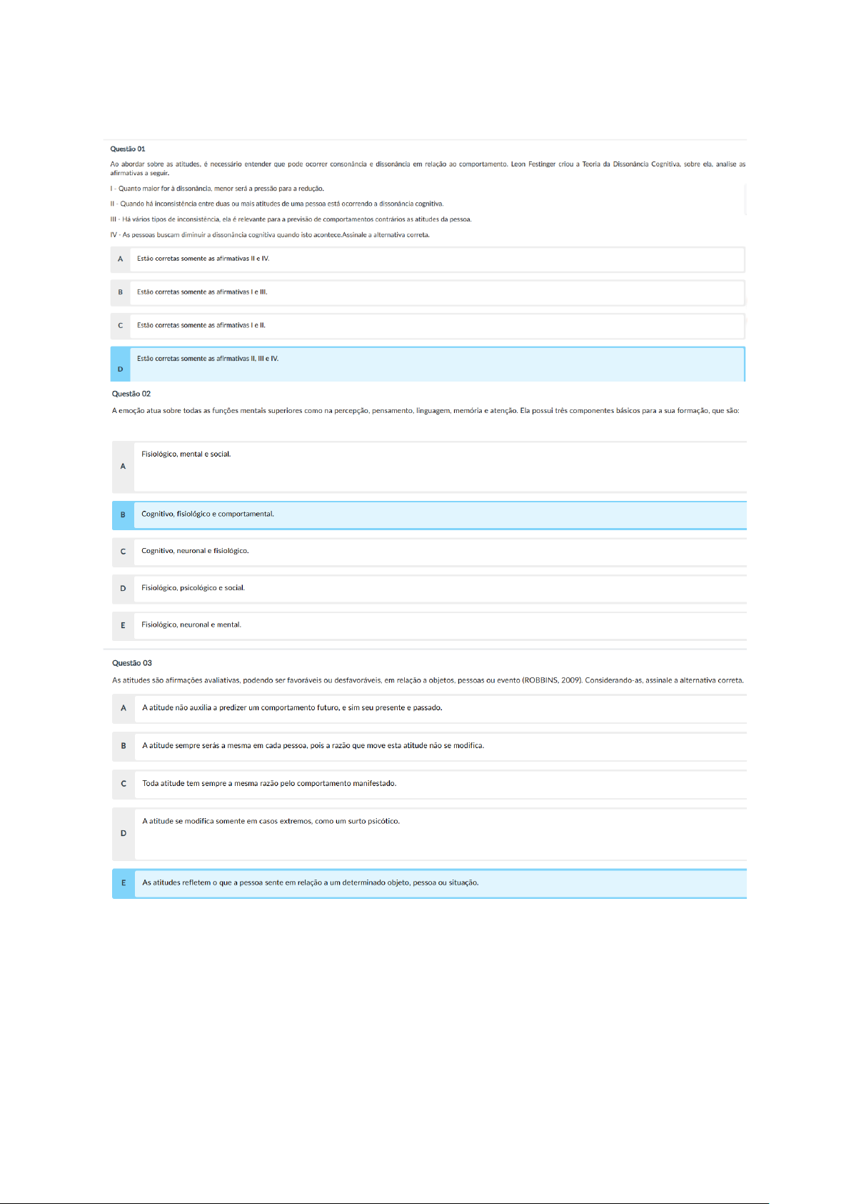 Questão 01 Ao abordar sobre as atitudes, é necessário entender que pode ocorrer consonância e dissonância em relação ao comportamento. Leon Festinger criou a Teoria da Dissonância Cognitiva, sobre ela, analise as afirmativas seguir. Quanto maior for à dissonância, menor será a pressão para a redução. II Quando há inconsistência entre duas ou mais atitudes de uma pessoa está ocorrendo a dissonância cognitiva. III Há vários tipos de inconsistência, ela é relevante para a previsão de comportamentos contrários as atitudes da pessoa. IV As pessoas buscam diminuir a dissonância cognitiva quando isto acontece.Assinale a alternativa correta. A Estão corretas somente as afirmativas II e IV. Estão corretas somente as afirmativas e III. c Estão corretas somente as afirmativas e II. Estão corretas somente as afirmativas III e IV. D Questão 02 A emoção atua sobre todas as funções mentais superiores como na percepção, pensamento, linguagem, memória e atenção. Ela possui três componentes básicos para a sua formação, que são: Fisiológico, mental e social. A Cognitivo, fisiológico e comportamental. c Cognitivo, neuronal e fisiológico. D Fisiológico, psicológico e social. E Fisiológico, neuronal e mental. Questão 03 As atitudes são afirmações avaliativas, podendo ser favoráveis ou desfavoráveis, em relação a objetos, pessoas ou evento (ROBBINS, 2009). Considerando-as, assinale a alternativa correta. A A atitude não auxilia a predizer um comportamento futuro, e sim seu presente e passado. A atitude sempre serás a mesma em cada pessoa, pois a razão que move esta atitude não se modifica. Toda atitude tem sempre a mesma razão pelo comportamento manifestado. A atitude se modifica somente em casos extremos, como um surto psicótico. D E As atitudes refletem que a pessoa sente em relação a um determinado objeto, pessoa ou situação.Questão 04 No mundo do trabalho, a pessoa inicia desenvolvimento de seu estresse quando é submetida a alguma situação negativa. Sobre estresse, avalie as afirmativas a seguir. primeiro fator de estresse no mundo do trabalho se refere às relações interpessoais, neste caso estressado reduz a comunicação com outros profissionais. II. As organizações devem evitar alguns modos de trabalho que acabam desenvolvendo estresse como ritmos acelerados de trabalho, ambiguidade nas orientações da chefia. III. Um dos principais causadores de estresse é modo de pensar e agir de uma pessoa, devido suas crenças, cultura e normas pessoais. IV. Não temos controle sobre estresse, nem seu gerenciamento, ele infelizmente é a causa de várias doenças surgidas na vida dos colaboradores. Está correto que se afirma em: A II. II, IV. c I, IV. D I, III. E I. IV. Questão 05 Muitos trabalhadores não possuem conhecimento adequado sobre assédio moral, acreditam ser somente ameaça, insulto e constrangimento. Desse modo, sobre assédio moral avalie as afirmativas abaixo. - ato ocorre como uma humilhação, expondo trabalhador a situações de constrangimento durante a jornada de trabalho. Pode-se considerar como ato de humilhação ao trabalhador podendo fazer surgir sentimento de baixa autoestima, inferiorizado e menosprezado. III A humilhação ao trabalhador pode ocorrer fora da empresa e não necessariamente na jornada de trabalho. IV Na maioria dos casos a humilhação ocorre entre os colegas da mesma hierarquia que convivem constantemente e diretamente com trabalhador. Assinale a alternativa correta: A Estão corretas somente as afirmativas II, III e IV. Estão corretas somente as afirmativas I, III e IV. Estão corretas somente as afirmativas I, e III. D Estão corretas somente as afirmativas II. Todas as afirmativas estão corretas. E Questão 06 A Psicologia Organizacional tem suas raizes no século XIX, período que os psicólogos experimentais se interessaram em aplicar os da psicologia para resolver problemas nas organizações. Diante do tema da psicologia organizacional, assinale alternativa correta. A psicologia organizacional busca compreender somente em uma visão macroorganizacional para agir de forma microorganizacional. A A psicologia organizacional tem seu foco na interação do comportamento das pessoas no trabalho e na organização. A psicologia organizacional busca realizar atendimento psicológico individual aos trabalhadores da organização que está inserido. D Foi no final do século XIX que ocorreu sua criação, e seu desenvolvimento foi amadurecendo com influência da catástrofe ocorrida nos Estados Unidos. E Primeira Guerra Mundial os estudos de Hawthorne foram obstáculos para desenvolvimento da Psicologia Organizacional naquela época.Questão 07 A psicologia com 0 tempo foi se definindo com surgimento das novas teorias e se apresentando com enfoques diferentes sobre 0 ser humano. Considerando estes enfoques analise as afirmativas seguir e assinale a alternativa correta estruturalismo é ciência da vida mental. II comportamental é estudo do comportamento. III mentalismo é a ciência que investiga processos e estados conscientes, suas origens efeitos. IV A psicanálise é ciência que estuda comportamento e os processos mentais dos indivíduos-psiquismo. A Estão corretas somente as afirmativas II. Estão corretas somente as afirmativas II e IV. Estão corretas somente as afirmativas IV. D Estão corretas somente as afirmativas III. Estão corretas somente as afirmativas IV. E Questão 08 A percepção é processo por meio dos sentidos de tornar consciente de objetos, relacionamentos e eventos. Diante do tema percepção, assinale a alternativa correta. A Os fatores que influenciam processo de percepção dependem das características do observador como suas motivações, experiências anteriores, estímulo e situação. estímulo do ambiente como um som alto, repetição, não podem influenciar no processo de percepção, uma vez que indivíduo é motivado a perceber diante de seus interesses