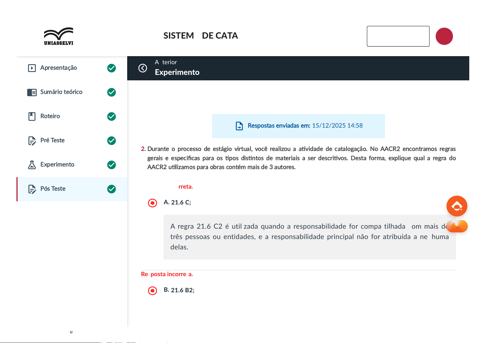 Pós Teste Respostas enviadas em: 15/12/2025 14:58 2. Durante o processo de estágio virtual, você realizou a atividade de catalogação. No AACR2 encontramos regras gerais e especificas para os tipos distintos de materiais a ser descritivos. Desta forma, explique qual a regra do AACR2 utilizamos para obras contém mais de 3 autores. Resposta incorreta. A. 21.6 C; A regra 21.6 C2 é utilizada quando a responsabilidade for compartilhada com mais de três pessoas ou entidades, e a responsabilidade principal não for atribuída a nenhuma delas. Resposta incorreta. B. 21.6 B2; Anterior ExperimentoApresentação Sumário teórico Roteiro Pré Teste Experimento Pós Teste SISTEMA DE CATALOGAÇÃO Avalie esta aula FM 0 15/12/2025, 14:59 SISTEMA DE CATALOGAÇÃO :: Plataforma A https://uniasselvi.grupoa.education/sagah/object/default/121437465 1/2 A regra 21.6 B2 é utilizada quando a responsabilidade principal é indicada a uma pessoa ou entidade. Você acertou! C. 21.6 C2. As regras para a escolha do ponto de acesso principal estão descritas na segunda parte do AACR2, escolha de ponto de acesso. Nessa situação a regra a ser utilizada é a regra 21.6 C2, quando a responsabilidade principal não é indicada na fonte de informação. Utilizamos essa regra para obras de autoria compartilhada com mais de 3 autores e entidades. Deve se fazer a entrada pelo título, posteriormente fazer a entrada secundária sob o cabeçalho estabelecido para a pessoa ou entidade mencionada em primeiro lugar, no item que está sendo catalogado. 2 de 5 perguntas Voltar Próximo Anterior ExperimentoApresentação Sumário teórico Roteiro Pré Teste Experimento Pós Teste SISTEMA DE CATALOGAÇÃO Avalie esta aula FM 15/12/2025, 14:59 SISTEMA DE CATALOGAÇÃO :: Plataforma A https://uniasselvi.grupoa.education/sagah/object/default/121437465 2/2