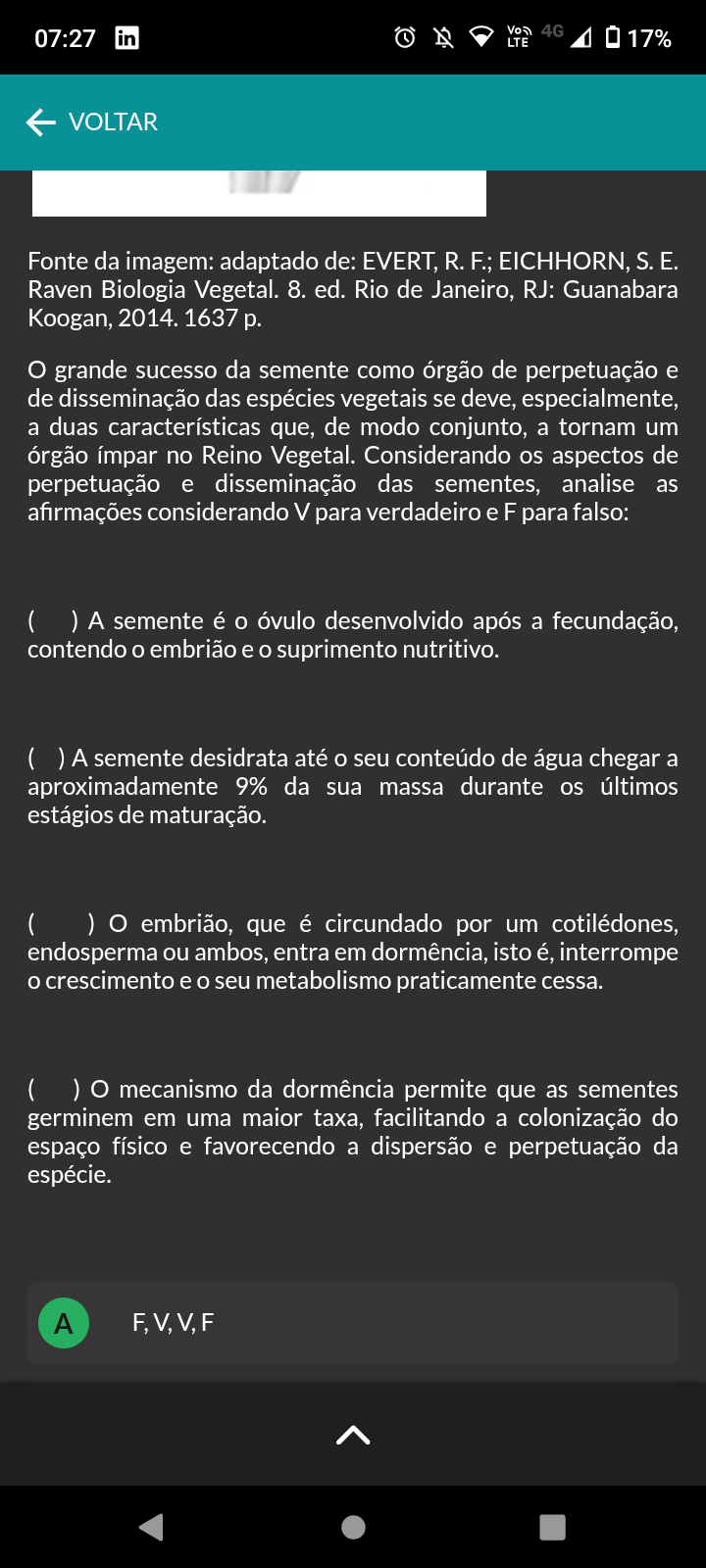 07:27 in 4G LTE 17% VOLTAR Fonte da imagem: adaptado de: EVERT, R. EICHHORN, S. E. Raven Biologia Vegetal. 8. ed. Rio de Janeiro, RJ: Guanabara Koogan, 2014. 1637 p. grande sucesso da semente como órgão de perpetuação e de disseminação das espécies vegetais se deve, especialmente, a duas características que, de modo conjunto, a tornam um órgão ímpar no Reino Vegetal. Considerando os aspectos de perpetuação e disseminação das sementes, analise as afirmações considerando V para verdadeiro e F para falso: ( ) A semente é o óvulo desenvolvido após a fecundação, contendo o embrião e o suprimento nutritivo. A semente desidrata até o seu conteúdo de água chegar a aproximadamente 9% da sua massa durante os últimos estágios de maturação. ( ) embrião, que é circundado por um cotilédones, endosperma ou ambos, entra em dormência, isto é, interrompe o crescimento e o seu metabolismo praticamente cessa. ( ) mecanismo da dormência permite que as sementes germinem em uma maior taxa, facilitando a colonização do espaço físico e favorecendo a dispersão e perpetuação da espécie. A F,V,V,F