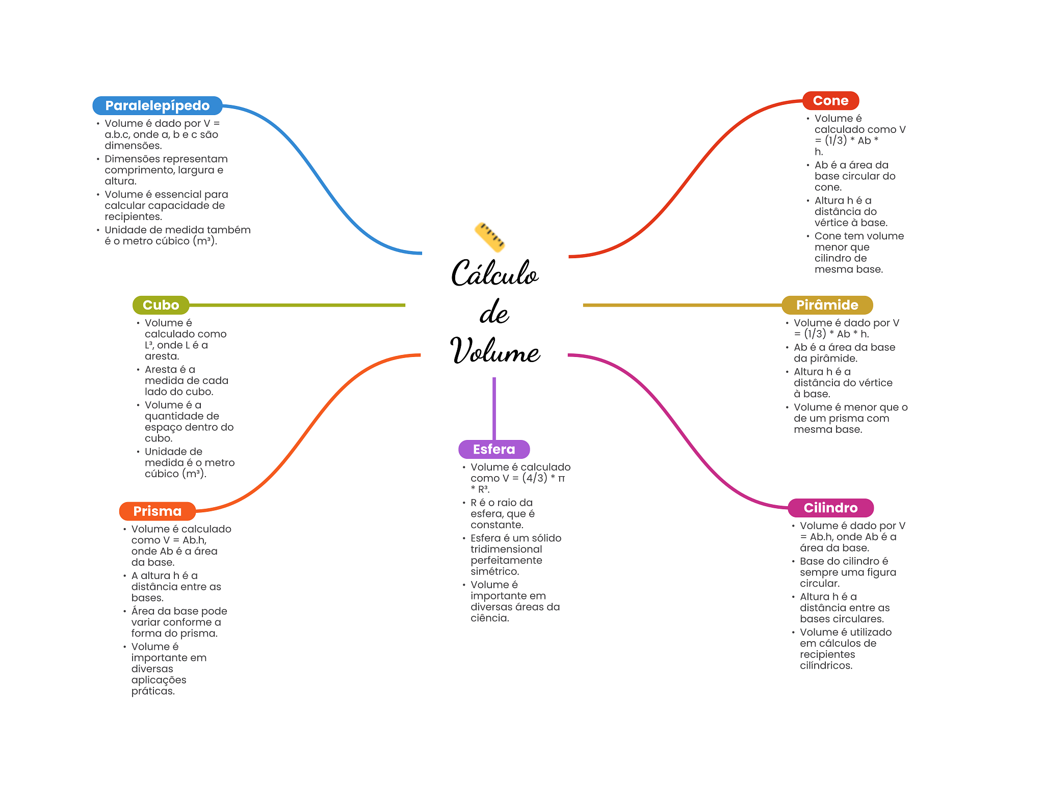 Paralelepípedo Cone Volume é Volume é dado por V = calculado como V a.b.c, onde a, b e C são dimensões. = (1/3) * Ab * h. Dimensões representam Ab é a área da comprimento, largura e base circular do altura. cone. Volume é essencial para Altura h é a calcular capacidade de distância do recipientes. vértice à base. Unidade de medida também é metro cúbico Cone tem volume menor que cilindro de Cálculo mesma base. Cubo de Pirâmide Volume é Volume é dado por V calculado como = (1/3) * Ab * h. L³, onde L é a aresta. Volume Ab é a área da base da pirâmide. Aresta é a Altura h é a medida de cada distância do vértice lado do cubo. à base. Volume é a Volume é menor que quantidade de de um prisma com espaço dentro do mesma base. cubo. Unidade de Esfera medida é metro Volume é calculado cúbico como V = (4/3) * * Ré raio da Prisma Cilindro esfera, que é Volume é calculado constante. Volume é dado por V como V = Ab.h, Esfera é um sólido = Ab.h, onde Ab é a onde Ab é a área tridimensional área da base. da base. perfeitamente Base do cilindro é A altura h é a simétrico. sempre uma figura distância entre as Volume é circular. bases. importante em Altura h é a Área da base pode diversas áreas da distância entre as variar conforme a ciência. bases circulares. forma do prisma. Volume é utilizado Volume é em cálculos de importante em recipientes diversas cilíndricos. aplicações práticas.