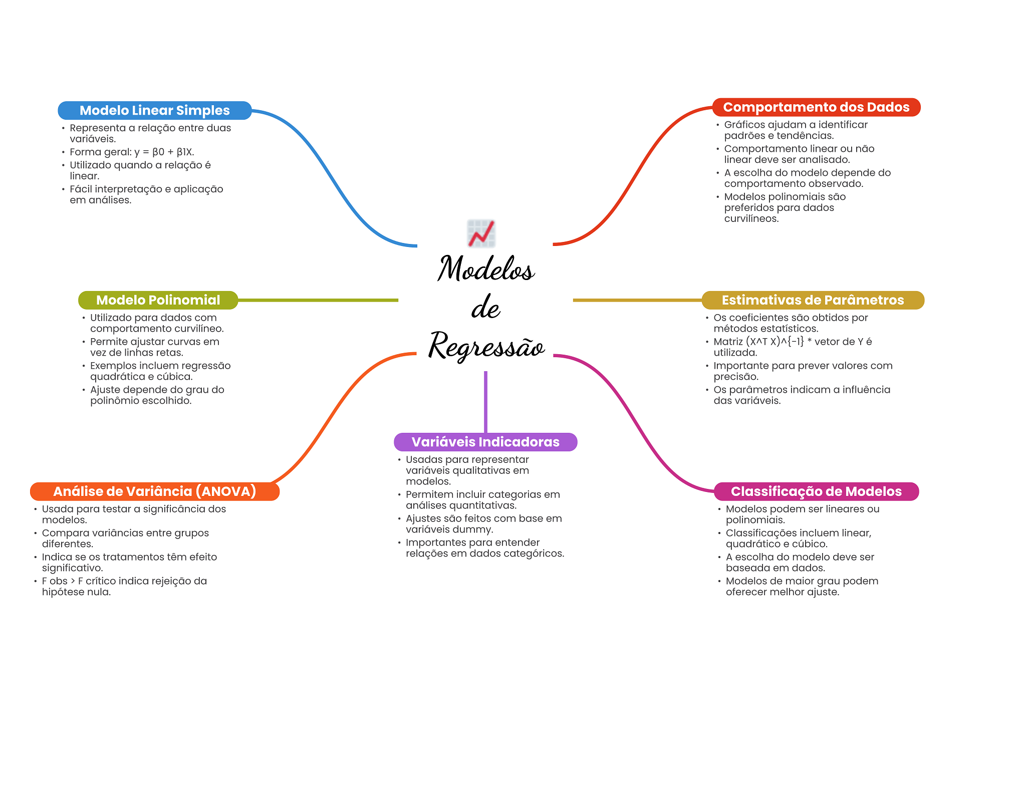 Modelo Linear Simples Comportamento dos Dados Representa a relação entre duas Gráficos ajudam a identificar variáveis. padrões e tendências. Forma geral: y = + Comportamento linear ou não linear deve ser analisado. Utilizado quando a relação é linear. A escolha do modelo depende do Fácil interpretação e aplicação comportamento observado. em análises. Modelos polinomiais são preferidos para dados curvilíneos. N Modelos Modelo Polinomial de Estimativas de Parâmetros Utilizado para dados com Os coeficientes são obtidos por comportamento curvilíneo. métodos estatísticos. Permite ajustar curvas em Regressão Matriz * vetor de Y é vez de linhas retas. utilizada. Exemplos incluem regressão Importante para prever valores com quadrática e cúbica. precisão. Ajuste depende do grau do Os parâmetros indicam a influência polinômio escolhido. das variáveis. Variáveis Indicadoras Usadas para representar variáveis qualitativas em modelos. Análise de Variância (ANOVA) Permitem incluir categorias em Classificação de Modelos Usada para testar a significância dos análises quantitativas. Modelos podem ser lineares ou modelos. Ajustes são feitos com base em polinomiais. Compara variâncias entre grupos variáveis dummy. Classificações incluem linear, diferentes. Importantes para entender quadrático e cúbico. Indica se tratamentos têm efeito relações em dados categóricos. A escolha do modelo deve ser significativo. baseada em dados. F obs > F crítico indica rejeição da Modelos de maior grau podem hipótese nula. oferecer melhor ajuste.