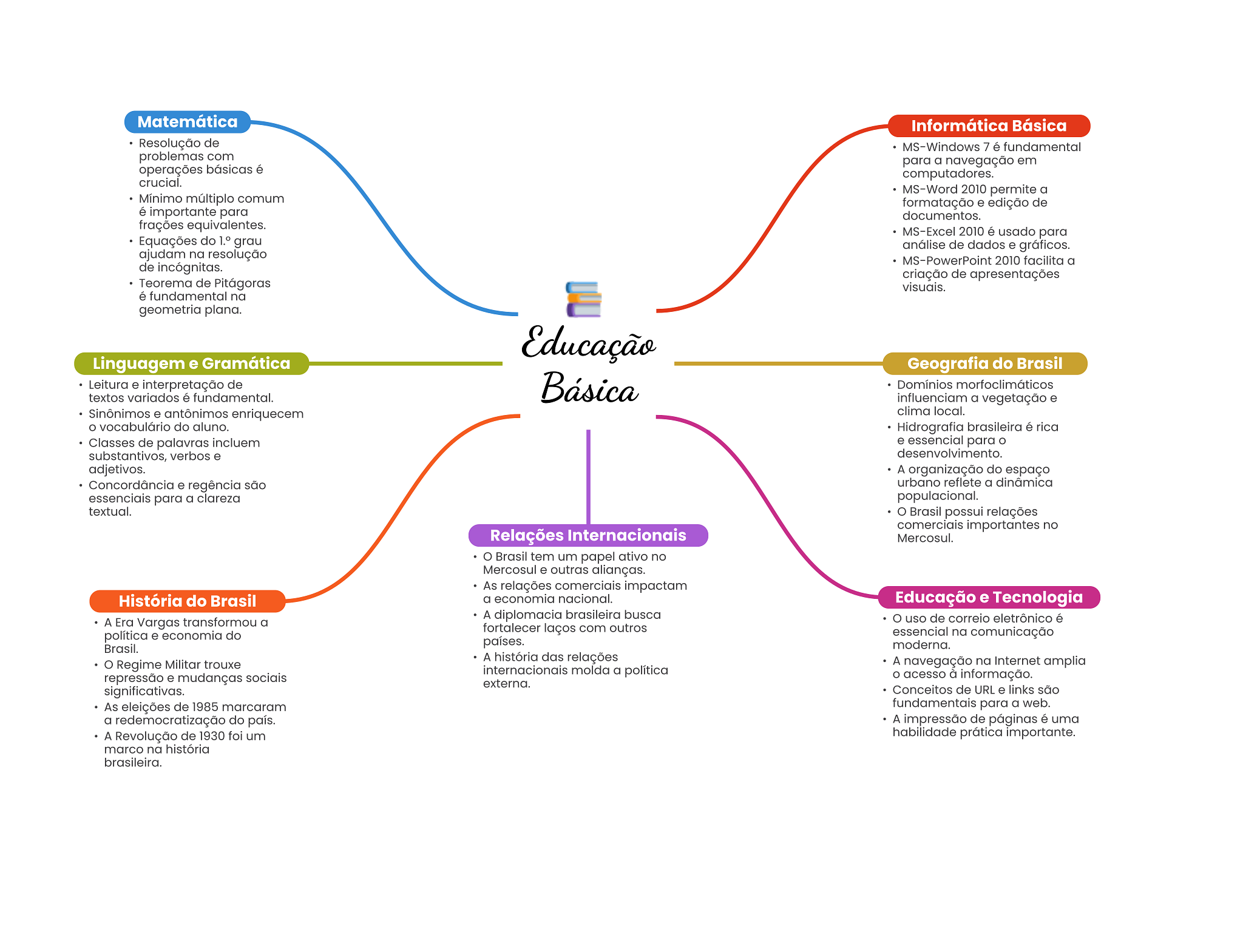 Matemática Informática Básica Resolução de MS-Windows 7 é fundamental problemas com para a navegação em operações básicas é computadores. crucial. MS-Word 2010 permite a Mínimo múltiplo comum formatação e edição de é importante para documentos. frações equivalentes. MS-Excel 2010 é usado para Equações do 1.° grau análise de dados e gráficos. ajudam na resolução MS-PowerPoint 2010 facilita a de incógnitas. criação de apresentações Teorema de Pitágoras visuais. é fundamental na geometria plana. Educação Linguagem e Gramática Geografia do Brasil Leitura e interpretação de Básica Domínios morfoclimáticos textos variados é fundamental. influenciam a vegetação e Sinônimos e antônimos enriquecem clima local. vocabulário do aluno. Hidrografia brasileira é rica Classes de palavras incluem e essencial para substantivos, verbos e desenvolvimento. adjetivos. A organização do espaço Concordância e regência são urbano reflete a dinâmica essenciais para a clareza populacional. textual. Brasil possui relações comerciais importantes no Relações Internacionais Mercosul. Brasil tem um papel ativo no Mercosul e outras alianças. As relações comerciais impactam História do Brasil a economia nacional. Educação e Tecnologia A diplomacia brasileira busca A Era Vargas transformou a O uso de correio eletrônico é fortalecer laços com outros política e economia do essencial na comunicação Brasil. países. moderna. A história das relações Regime Militar trouxe A navegação na Internet amplia internacionais molda a política repressão e mudanças sociais acesso à informação. externa. significativas. Conceitos de URL e links são As eleições de 1985 marcaram fundamentais para a web. a redemocratização do país. A impressão de páginas é uma A Revolução de 1930 foi um habilidade prática importante. marco na história brasileira.