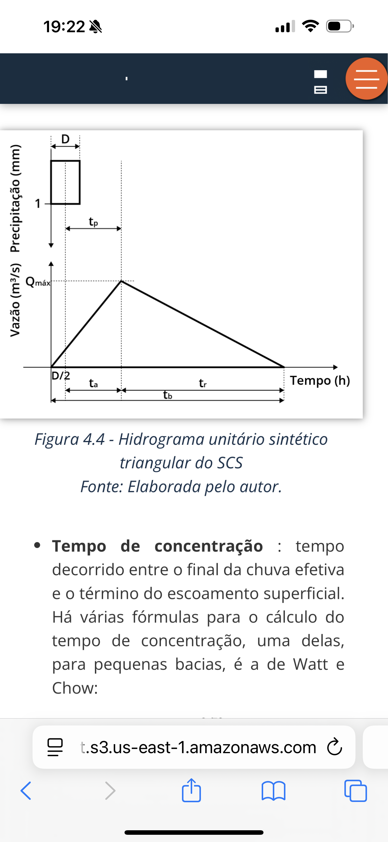 19:22 D Vazão (m³/s) Precipitação (mm) 1 tp Qmáx D/2 ta tr Tempo (h) tb Figura 4.4 - Hidrograma unitário sintético triangular do SCS Fonte: Elaborada pelo autor. Tempo de concentração : tempo decorrido entre final da chuva efetiva e término do escoamento superficial. Há várias fórmulas para cálculo do tempo de concentração, uma delas, para pequenas bacias, é a de Watt e Chow: t.s3.us-east-1.amazonaws.com