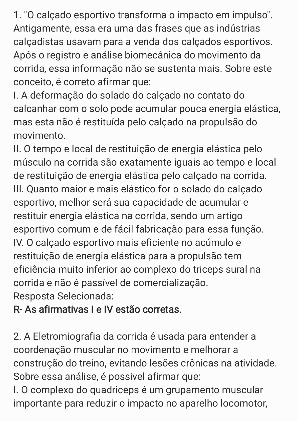 1. "O calçado esportivo transforma impacto em impulso". Antigamente, essa era uma das frases que as indústrias calçadistas usavam para a venda dos calçados esportivos. Após registro e análise biomecânica do movimento da corrida, essa informação não se sustenta mais. Sobre este conceito, é correto afirmar que: I. A deformação do solado do calçado no contato do calcanhar com solo pode acumular pouca energia elástica, mas esta não é restituída pelo calçado na propulsão do movimento. II. tempo e local de restituição de energia elástica pelo músculo na corrida são exatamente iguais ao tempo e local de restituição de energia elástica pelo calçado na corrida. III. Quanto maior e mais elástico for solado do calçado esportivo, melhor será sua capacidade de acumular e restituir energia elástica na corrida, sendo um artigo esportivo comum e de fácil fabricação para essa função. IV. calçado esportivo mais eficiente no acúmulo e restituição de energia elástica para a propulsão tem eficiência muito inferior ao complexo do triceps sural na corrida e não é passível de comercialização. Resposta Selecionada: R- As afirmativas I e IV estão corretas. 2. A Eletromiografia da corrida é usada para entender a coordenação muscular no movimento e melhorar a construção do treino, evitando lesões crônicas na atividade. Sobre essa análise, é possivel afirmar que: I. complexo do quadriceps é um grupamento muscular importante para reduzir impacto no aparelho locomotor,trabalhando no início da fase de apoio da corrida em ação excêntrica. II. complexo do triceps sural é importante para propulsionar corpo dos corredores e melhorar rendimento no movimento e trabalha em ação concêntrica no final da fase de apoio da corrida. III. Pela análise eletromiografica é possível verificar que, no padrão de corrida com músculo tibial anterior é menos participativo na fase de apoio do movimento. IV. Pela análise eletromiográfica é possível verificar que, no padrão de corrida com médio pé, músculo triceps sural é menos participativo na fase de apoio do movimento. Resposta Selecionada: R- As afirmativas III e IV estão corretas. 3. A capacidade de absorção de choque mecânico do calçado esportivo é testada pelas indústrias calçadistas e a venda do calçado explora esta informação. Sobre a metodologia usada para verificar esta caracteristica do calçado, è correto afirmar que: I. Os testes mecânicos avaliam a capacidade de deformação do material do solado e a relacionam com impacto. Quanto mais deformável é material do solado, maior é a capacidade de absorção de choque do calçado. II. A analise da interação entre calçado esportivo e aparelho locomotor é feita com uso dos testes biomecânicos. Para tanto, a Plataforma de Força de Reação do Solo é usada para medir impacto aplicado ao corpo na corrida de sujeitos com calçados de diferentes características deconstrução. III. Os resultados dos testes biomecânicos não diferem dos obtidos nos testes mecânicos. Os calçados com solados mais macios reduzem as cargas mecánicas aplicadas ao aparelho locomotor. IV. aparelho locomotor é capaz de criar estratégias diferentes para atenuação do impacto, como mudar a forma da pisada, independentemente da característica do solado (macio ou duro) do calçado. Resposta Selecionada: R- As afirmativas I, III e IV estão corretas. 4. A distribuição de pressão pelo calçado esportivo na corrida é outra caracteristica estudada para verificação do controle de forças sobre a região plantar. Sabendo que, a pressão plantar é uma variável sensível as características de construção do calçado, ao observa a figura abaixo, é correto afirmar que I. calçado macio apresenta picos de pressão menores em todas as áreas do pé. II. calçado duro apresenta maiores valores de picos de pressão nas áreas do calcanhar e do antepé. III. tipo de solado do calçado esportivo afeta a distribuição de pressão plantar. IV. Quanto mais deformável for solado, maior será a pressão plantar. V. excesso de pressão na região plantar altera as caracteristicas da pele, podendo ocasionar bolas, feridas e calos. RespostaSelecionada:R- As afirmativas I, e IV estão corretas. 5. A corrida de rua é uma atividade que se tornou popular em todo mundo. Muitas pessoas a praticam como um fim, embora muitas também a usem como estratégia de condicionamento físico, com objetivo de praticar outra modalidade esportiva. conhecimento da biomecânica da corrida pode ser obtido por meio: I. Da filmagem e obtenção dos parâmetros como deslocamento, velocidade e aceleração para entender como se dá movimento. II. Da análise das ações musculares para compreender como os músculos se coordenam para controlar impacto e acelerar movimento. III. Da quantificação da força que incide no corpo no início da fase de apoio da corrida. IV. Da quantificação da pressão sobre a região plantar para entender qual músculo é acionado na corrida. Resposta Selecionada: R- As afirmativas I, II e III estão corretas. 6. Com a Plataforma de FRS, a magnitude da força externa será medida sempre de forma dinâmica, assim, toda variação de força para mais ou para menos no movimento é registrada em forma de gráfico. gráfico da componente vertical da FRS da corrida pode ser visto a seguir. Ao analisar este gráfico é possível fazer as seguintes considerações: Fonte: Adaptado de Brandina, 2009, 36.7. Com a Plataforma de FRS, a magnitude da força externa será medida sempre de forma dinâmica, assim, toda variação de força para mais ou para menos no movimento é registrada em forma de gráfico. gráfico da componente vertical da FRS da corrida pode ser visto a seguir. Ao analisar este gráfico é possível fazer as seguintes considerações: Fonte: Adaptado de Brandina, 2009, 36. I. valor de Fyl na corrida é obtido quando calcanhar entra em contato com solo para 