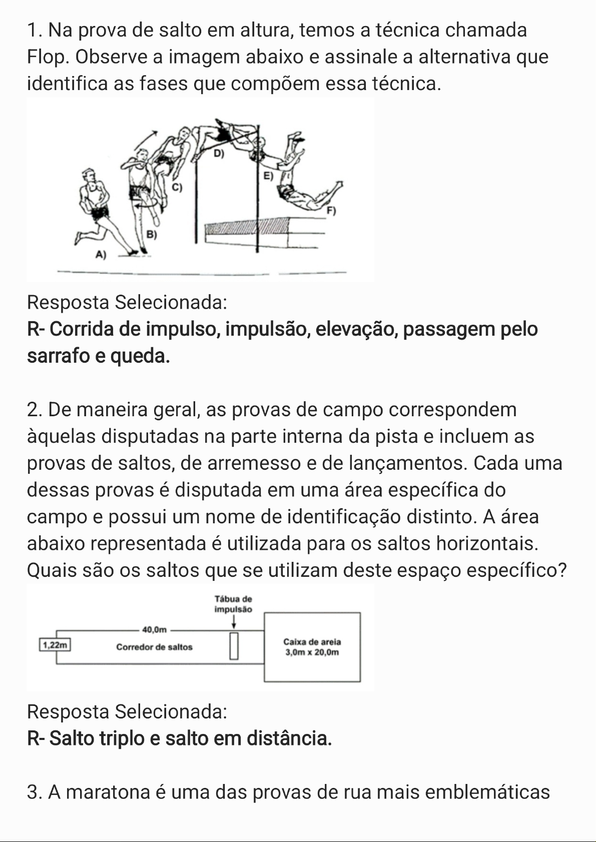 1. Na prova de salto em altura, temos a técnica chamada Flop. Observe a imagem abaixo e assinale a alternativa que identifica as fases que compõem essa técnica. D) E) C) F) B) A) Resposta Selecionada: R- Corrida de impulso, impulsão, elevação, passagem pelo sarrafo e queda. 2. De maneira geral, as provas de campo correspondem àquelas disputadas na parte interna da pista e incluem as provas de saltos, de arremesso e de lançamentos. Cada uma dessas provas é disputada em uma área específica do campo e possui um nome de identificação distinto. A área abaixo representada é utilizada para os saltos horizontais. Quais são os saltos que se utilizam deste espaço específico? Tábua de impulsão 40,0m 1,22m Caixa de areia Corredor de saltos 3,0m 20,0m Resposta Selecionada: R- Salto triplo e salto em distância. 3. A maratona é uma das provas de rua mais emblemáticasdo atletismo, tendo sua origem da história do herói grego que, segundo a lenda, sacrificou sua vida para correr entre as cidades de Marathon e Atenas. Qual a distância a ser percorrida por um maratonista? Resposta Selecionada: R- 42195 m. 4. Relacione corretamente as provas do atletismo com suas respectivas descrições. 1- Lançamento de dardo. 2- Lançamento de disco. 3- Lançamento de martelo. 4- Arremesso de peso. ( ) atleta lança uma peça formada por um cabo com um peso na ponta. Consiste no lançamento de uma haste metálica, que é feita de uma pista, na qual lançador corre cerca de 15 passadas. ( ) São bolas maciças de metal com diâmetros e pesos diferentes para homens e mulheres. ( ) A peça lembra uma nave espacial feita de metal e possui pesos diferentes para homens e mulheres. A sequência correta é: Resposta Selecionada: R- 3,1,4,2. 5. As provas combinadas no atletismo são algumas competições esportivas que envolvem uma combinação devárias modalidades no intuito de consagrar um atleta mais completo. Uma dessas provas é decatio, que é composto por dez provas. Sobre as provas que compõem decatio, marque c para as afirmativas Certas, E para as Erradas e, após, assinale alternativa que apresenta a sequência correta: ( ) Salto em altura. ( ) 800 m rasos. ( ) Lançamento do dardo. ( ) Salto em distância. ( ) Salto com vara. A sequência correta é: Resposta Selecionada: R-C-E-C-C-C. 6. As provas combinadas no atletismo são algumas competições esportivas que envolvem uma combinação de várias modalidades no intuito de consagrar um atleta mais completo. Uma dessas provas é heptatio, que é composto por sete provas. Sobre as provas que compõem heptatio, marque c para as afirmativas Certas, E para as Erradas e, após, assinale alternativa que apresenta sequência correta: ( ) Salto em altura. ( ) 800 m rasos. ( ) Lançamento do dardo. ( ) Salto em distância. ( ) Salto com vara. A sequência correta é:Resposta Selecionada: R-C-C-C-C-E. 7.0 arremesso de peso é realizado no interior de um círculo idêntico ao usado no lançamento de martelo, com apenas uma diferença: a existência de um anteparo de madeira com 1,22 m de largura colocado na frente do círculo, no início do setor de queda. Para esse arremesso, temos dois tipos de técnica. São elas: Resposta Selecionada: R- Rotacional e de costas. 8. salto com vara é uma modalidade do atletismo que possui técnica muito complexa, que é composta de várias fases e subfases que se interligam e apresentam uma estrutura rítmica. Matthiesen (2014) considera que as fases do salto com vara são. Resposta Selecionada: R- Empunhadura, corrida, preparação para encaixe e salto, que envolve as fases de impulsão, elevação, giro e transposição e, por último, fase da queda. 9. Para saltador da prova de salto em distância conseguir atingir melhor desempenho e uma distância maior em seu salto, ele terá que ajustar ponto de partida de sua corrida de impulso e utilizará, em seus treinamentos, a distância ideal para a corrida. Para ajustar tal ponto de partida, ele se utilizará de métodos específicos. Assinale a alternativa que cita tais métodos. Resposta Selecionada:R- Tentativas, corrida inversa e matemático. 10. atletismo é considerado principal esporte olímpico, contemplando modalidades esportivas que requerem dosatletas muita força, técnica e resistência, além de concentração e equilibrio emocional. Em uma de suas modalidades, os atletas devem percorrer determinada distância sempre com um pé em contato com solo. Além disso, a perna de apoio deve estar estendida totalmente até que pé da perna contrária esteja no chão. Por isso, há árbitros ao longo do percurso que verificam cumprimento das regras e advertem os atletas, os quais podem ser eliminados após trés advertências. A modalidade a que se refere texto é a: Resposta Selecionada: R- Marcha atlética. 11. Sobre as corridas de revezamento, assinale a alternativa que preenche as lacunas abaixo corretamente. bastão deve ser passado numa determinada área que possui Caso bastão seja passado fora dessa área, a equipe é desclassificada. Na corrida de revezamento 4x100 m, equipe trocar a raia de início após a primeira passagem do bastão. Na corrida de revezamento 4x400 m, equipe trocar a raia de início após a primeira passagem do bastão. Resposta Selecionada: R- 20 m não pode não pode. 12. A respeito da história do atletismo e sua organização,analise as afirmativas: I atletismo é a forma organizada mais antiga de competição e desta modalidade derivaram-se outras modalidades. A Associação Internacional de Federações de Atletismo (IAAF) -World Athletics (WA) foi criada em 1896. III - A Confederação Brasileira de Atletismo (CBAt) foi criada em 1977. Está correto que se afirma em: Resposta Selecionada: R- Somente as afirmativas I e III. 13. atletismo é composto de um conjunto de provas nas quais praticante tem que pôr em prática melhor de seu desempenho relacionado às suas capacidades e habilidades naturais para correr, saltar, lançar e m