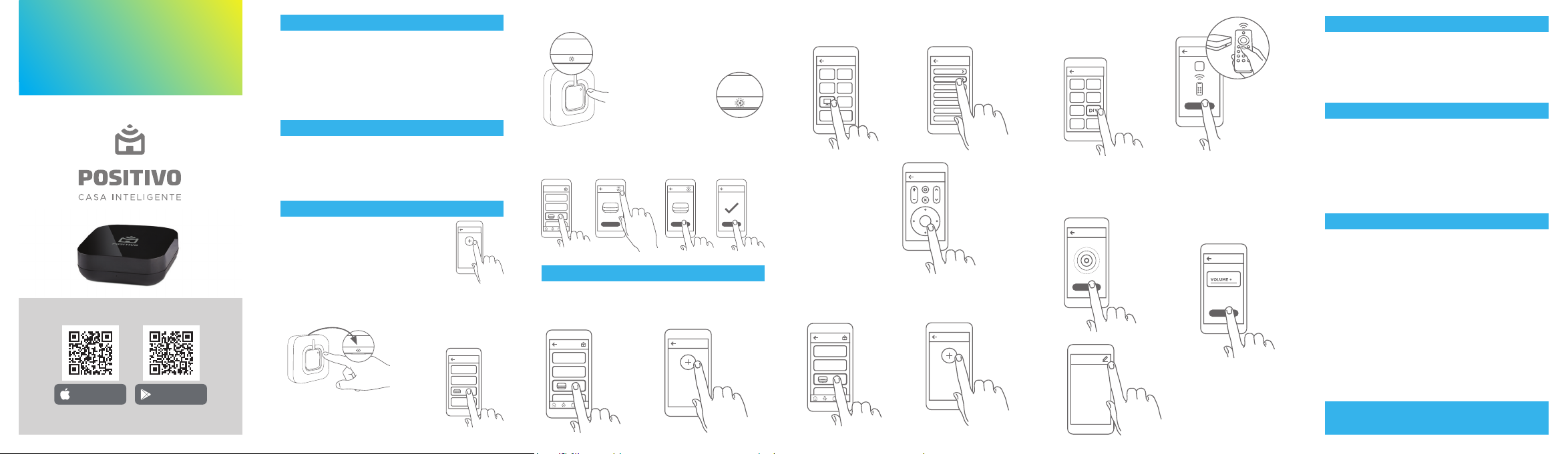 FUNÇÕES 1. Controle seus dispositivos através do aplicativo Positivo Casa Inteligente; 2. Compatível com aparelhos de ar condicionado, televisores e set-top box; 3. Utilize a função de aprendizado para controlar seus outros apa- relhos e eletrodomésticos que necessitam de controle infraver- melho sem biblioteca existente; 4. Cobertura de 360°. Controle dispositivos em todo o ambiente; 5. Crie cenas para controle inteligente do ambiente. SEMPRE CONECTADO 1. Sincronização com a nuvem e atualizações OTA (Over The Air); 2. Expansão para novas categorias de eletrodomésticos/eletro- eletrônicos (Home theaters, ventiladores, etc.); 3. Utilize mais produtos da linha Positivo Casa Inteligente* para criação de cenas inteligentes de controle do ambiente; * vendidos separadamente ADIÇÃO À REDE WIFI Vá até a loja de aplicativos do seu smartphone e procure pelo aplicativo Positivo Casa Inteli- gente (disponível no Google Play e APP Store) e instale gratuitamente. Abra o aplicativo Positivo Casa Inteligente e pressione o botão “+” para adicionar um novo dispositivo. MODO NORMAL 1. Com o Smart Controle Universal ligado na tomada, pressione o botão de reset localizado na parte inferior do produto por 5 segundos. 2. No aplicativo Positivo Casa Inteligente e selecione “Smart Controle Universal” e siga os passos para configuração do dispositivo. GUIA RÁPIDO Efetue o download do aplicativo Positivo Casa Inteligente e crie uma conta Smart Controle Universal (PCU IRN) Google PlayApp Store MODO AP (Access Point) CONFIGURAÇÃO DO SMART CONTROLE UNIVERSAL A PARTIR DE BIBLIOTECA EXISTENTE PASSO 1: Na página inicial, selecione a opção Smart Controle Universal. PASSO 2: Clique no ícone para adicio- nar um dispositivo. PASSO 3: Selecione um dispositivo entre os indicados na lista. PASSO 4: Selecione a marca do seu dispositivo. PASSO 5: Teste alguns botões dos controles pré-configura- dos. Caso eles controlem o seu dispositivo sem problemas, confirme. Se não, clique em “Próximo”. MODO DE APRENDIZADO PASSO 1: Na página inicial, selecione a opção Smart Controle Universal. PASSO 2: Clique no ícone para adicio- nar um dispositivo. Para mais informações, consulte: www.positivocasainteligente.com.br/manuais PADRÃO DE FÁBRICA Para restauração da configuração padrão pressione o botão de reset por, aproximadamente, 10 segundos até que o LED de status pisque rapidamente. Para informações mais detalhadas sobre este produto e toda a linha Positivo Casa Inteligente, acesse nosso site: www.positivocasainteligente.com.br STATUS DOS LEDS INDICATIVOS • Não conectado à rede: LED de status sempre ligado; • Aguardando configuração de rede: LED de status piscando rápido (modo normal) ou lento (modo AP) • Conectado à rede normalmente: LED de status desligado • Conectado à rede, sem acesso à internet: LED de status sem- pre ligado • Transmissão de dados: LED de status piscará uma vez • Entrar em modo de aprendizado: LED de status sempre ligado • Recebendo instrução de aprendizado: LED de status desligado INFORMAÇÕES TÉCNICAS Alimentação......................................................................... 5Vdc 1A, micro USB Frequência do infravermelho................................................................... 38kHz Área de cobertura................................................................................. 360 graus Distância de controle............................................................................... Até 8m* Conexão Wi-Fi......................................................... IEEE 802.11b/g/n, 2.4GHz Segurança e criptografia.......................... WPA/WPA2, WEP/TKIP/AES Plug da fonte........................................................................... Brasil (NBR 14136) Certificações...................................................................................... Anatel, RoHS Armazenamento...................... -20°C~65°C, 20%~93% umidade (40°C) Condições de operação.......... 0°C~50°C, 20%~ 90% umidade (40°C) Dimensões........................................................................................ 68x68x27mm Peso........................................................................................................................... 67 g * Pode variar conforme instalação e ambiente. 1. Pressione o botão de reset por 5 se- gundos. O LED de status começará a piscar rapidamente. 2. Pressione o botão de reset novamente por mais 5 segundos. O LED, então, começará a piscar lentamente. 3. A. Abra o aplicativo Positivo Casa Inteligente, selecione “Smart Controle Universal” B. No canto superior direito, pressione o ícone e siga os passos para configuração. PASSO 7: Caso você queira modificar um con- trole que foi adicionado por este método, basta pressionar o botão “Editar” no canto superior direito na tela de controles customizados e selecionar a opção desejada. PASSO 3: Selecione a opção DIY. Na tela seguinte, selecione o tipo de dispositivo e em seguida PASSO 4: Aproxime o con- trole remoto do seu dispositivo ao Smart Controle Universal e clique em próximo. PASSO 5: Aperte uma tecla do Con- trole Remoto e aguarde até que o Smart Controle Universal receba os co- mandos do dispositivo. PASSO 6: Assim que o controle universal receber o comando do dispos- itivo você deve indicar qual te- cla você havia pressionado no Controle remoto. Siga o mesmo passo para todas as teclas que deseja adicionar e salve. a marca. Caso seja um tipo de dispositivo diferente da listagem, selecione “Tipo personalizado” ouvido, carregador, teclado, capa protetora, cabo conversor mini, micro- -USB, cartão removível, cartão SIM, caneta apontadora e demais itens; c) Danos causados pelo uso de componentes ou produtos de terceiros e acessórios não autorizados ou não homologados pela POSITIVO; d) Formatação do Sistema Operacional do Produto. Importante: é de sua res