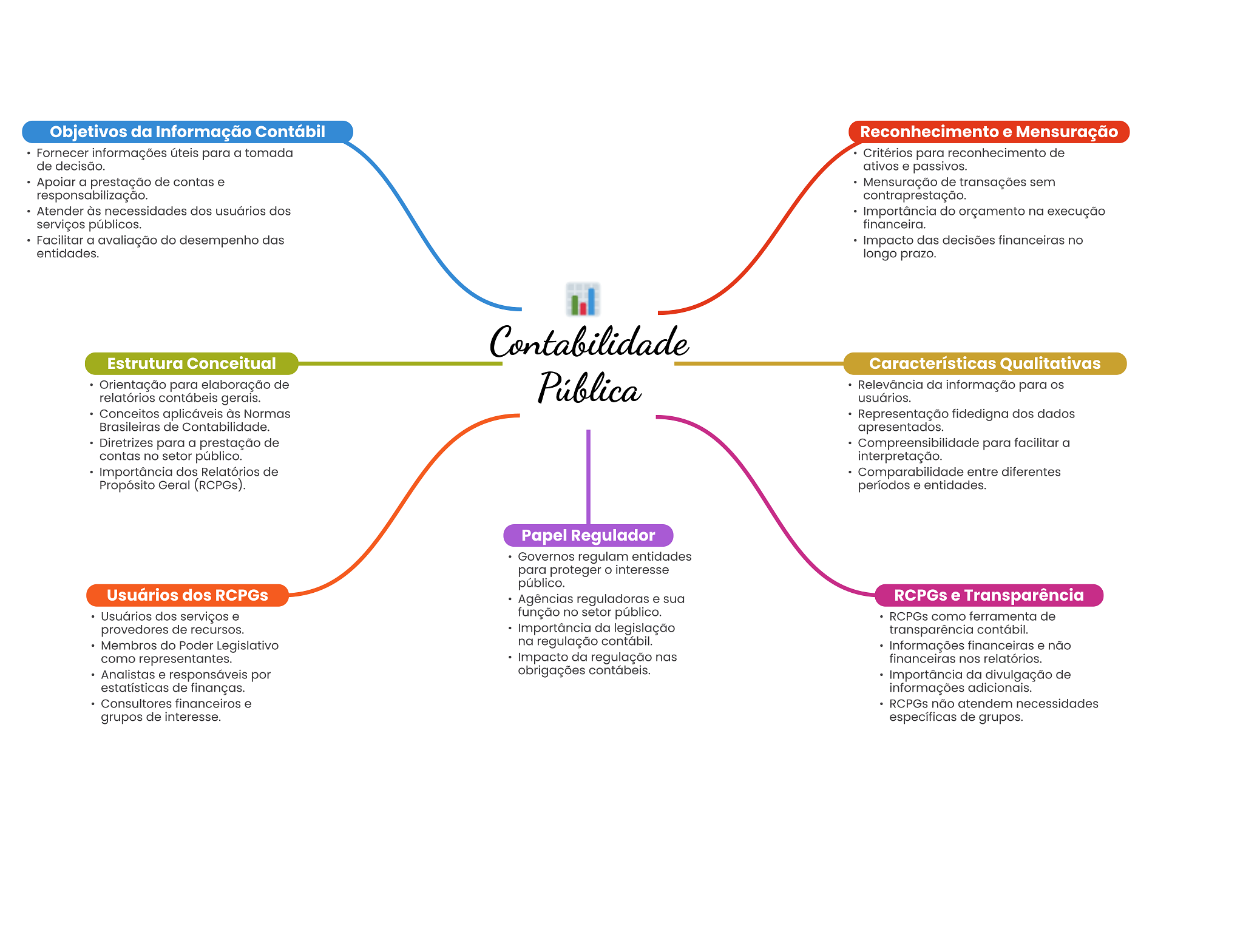Objetivos da Informação Contábil Reconhecimento e Mensuração Fornecer informações úteis para a tomada Critérios para reconhecimento de de decisão. ativos e passivos. Apoiar a prestação de contas e Mensuração de transações sem responsabilização. contraprestação. Atender às necessidades dos usuários dos Importância do orçamento na execução serviços públicos. financeira. Facilitar a avaliação do desempenho das Impacto das decisões financeiras no entidades. longo prazo. Contabilidade Estrutura Conceitual Características Qualitativas Orientação para elaboração de Pública Relevância da informação para relatórios contábeis gerais. usuários. Conceitos aplicáveis às Normas Representação fidedigna dos dados Brasileiras de Contabilidade. apresentados. Diretrizes para a prestação de Compreensibilidade para facilitar a contas no setor público. interpretação. Importância dos Relatórios de Comparabilidade entre diferentes Propósito Geral (RCPGs). períodos e entidades. Papel Regulador Governos regulam entidades para proteger interesse público. Usuários dos RCPGs Agências reguladoras e sua RCPGs e Transparência Usuários dos serviços e função no setor público. RCPGs como ferramenta de provedores de recursos. Importância da legislação transparência contábil. Membros do Poder Legislativo na regulação contábil. Informações financeiras e não como representantes. Impacto da regulação nas financeiras nos relatórios. Analistas e responsáveis por obrigações contábeis. Importância da divulgação de estatísticas de finanças. informações adicionais. Consultores financeiros e RCPGs não atendem necessidades grupos de interesse. específicas de grupos.