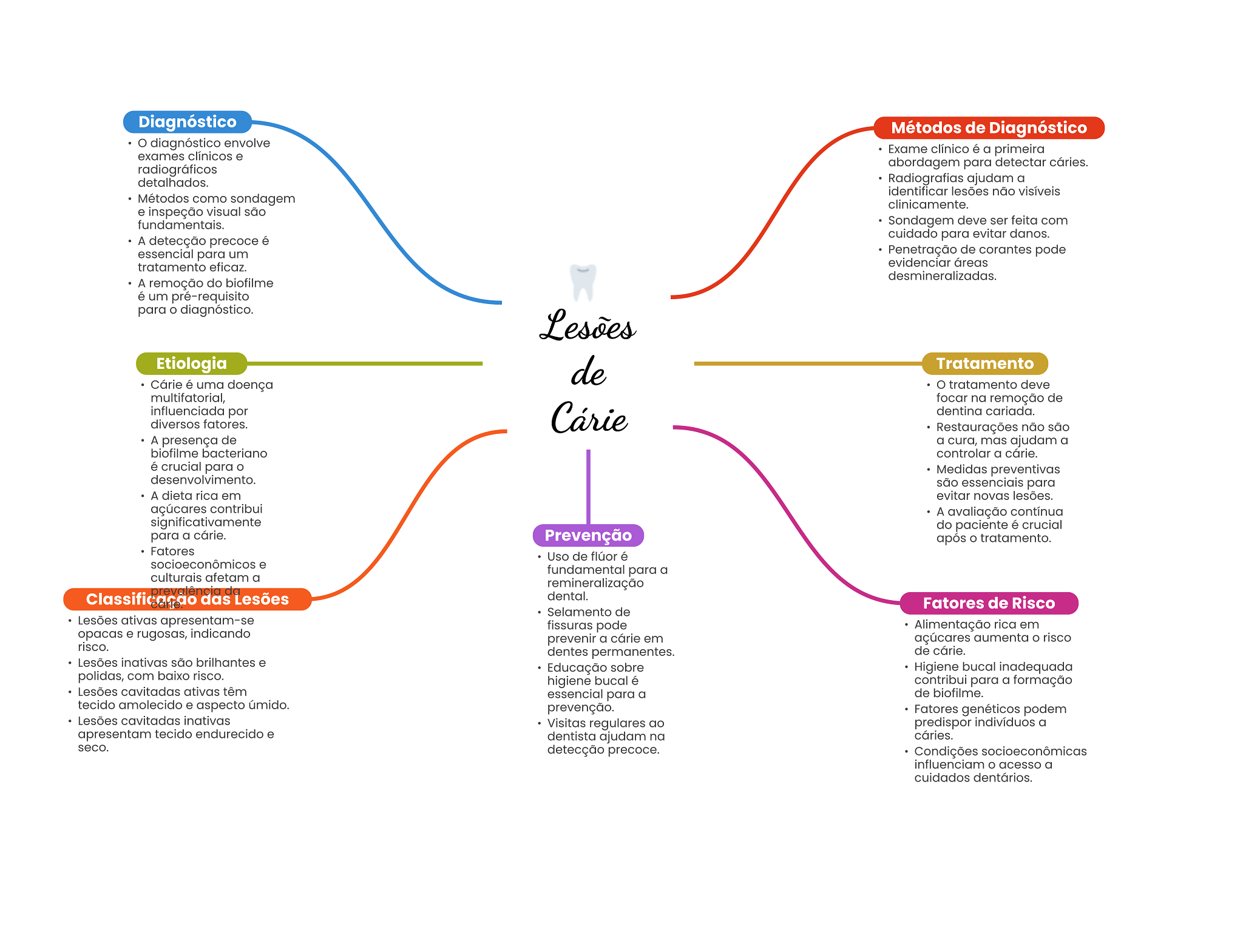 Diagnóstico Métodos de Diagnóstico diagnóstico envolve exames clínicos e Exame clínico é a primeira radiográficos abordagem para detectar cáries. detalhados. Radiografias ajudam a identificar lesões não visíveis Métodos como sondagem clinicamente. e inspeção visual são fundamentais. Sondagem deve ser feita com A detecção precoce é cuidado para evitar danos. essencial para um Penetração de corantes pode tratamento eficaz. evidenciar áreas desmineralizadas. A remoção do biofilme é um pré-requisito para O diagnóstico. Lesões Etiologia de Tratamento Cárie é uma doença tratamento deve multifatorial, focar na remoção de influenciada por diversos fatores. Cárie dentina cariada. Restaurações não são A presença de a cura, mas ajudam a biofilme bacteriano controlar a cárie. é crucial para Medidas preventivas são essenciais para A dieta rica em evitar novas lesões. açúcares contribui A avaliação contínua significativamente do paciente é crucial para a cárie. Prevenção após O tratamento. Fatores Uso de flúor é socioeconômicos e fundamental para a culturais afetam a remineralização Classificação das da Lesões dental. Fatores de Risco Selamento de Lesões ativas apresentam-se fissuras pode Alimentação rica em opacas e rugosas, indicando prevenir a cárie em açúcares aumenta risco risco. dentes permanentes. de cárie. Lesões inativas são brilhantes e Educação sobre Higiene bucal inadequada polidas, com baixo risco. higiene bucal é contribui para a formação Lesões cavitadas ativas têm essencial para a de biofilme. tecido amolecido e aspecto úmido. prevenção. Fatores genéticos podem Lesões cavitadas inativas Visitas regulares ao predispor indivíduos a apresentam tecido endurecido e dentista ajudam na cáries. seco. detecção precoce. Condições socioeconômicas influenciam acesso a cuidados dentários.