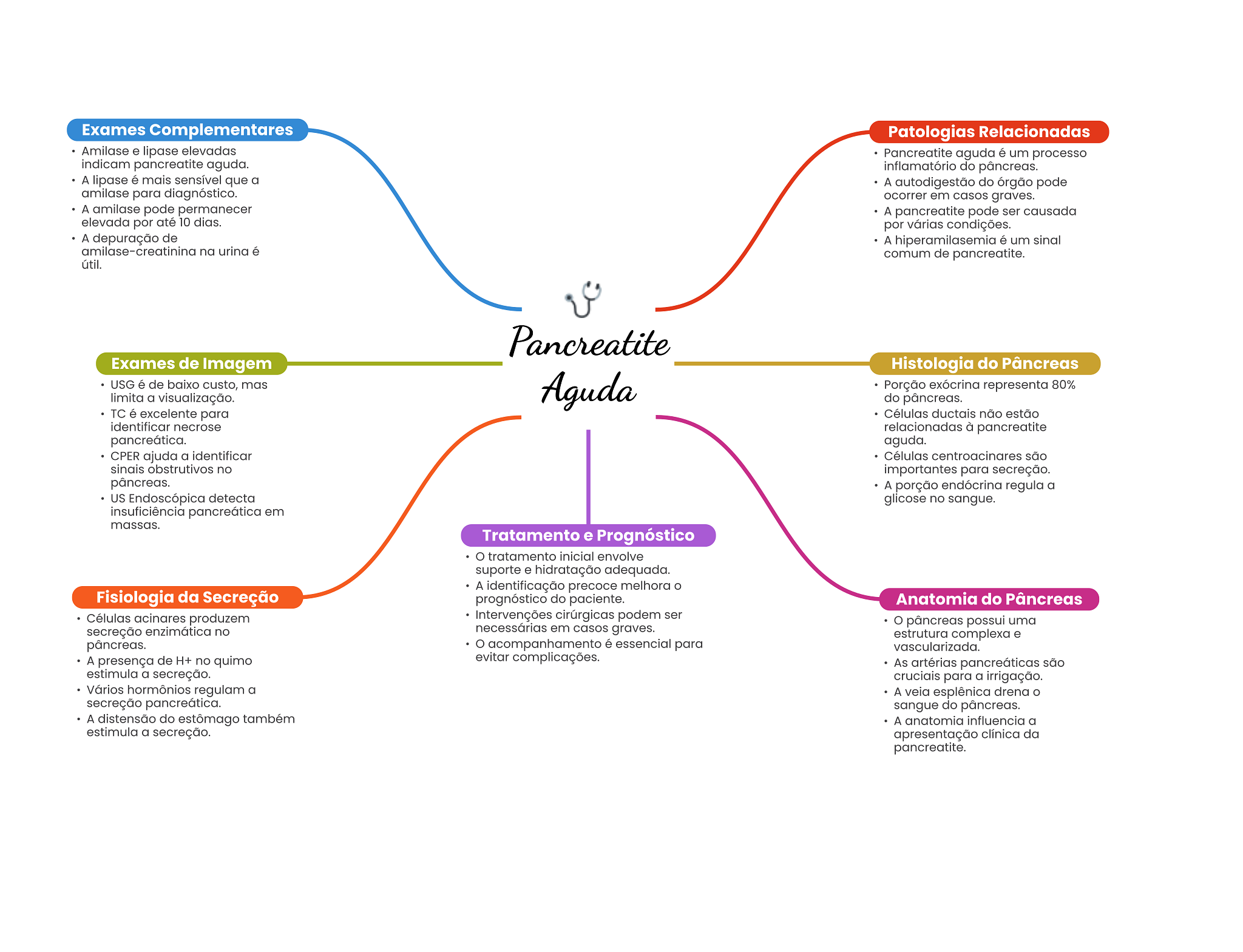 Exames Complementares Patologias Relacionadas Amilase e lipase elevadas Pancreatite aguda é um processo indicam pancreatite aguda. inflamatório do pâncreas. A lipase é mais sensível que a A autodigestão do órgão pode amilase para diagnóstico. ocorrer em casos graves. A amilase pode permanecer A pancreatite pode ser causada elevada por até 10 dias. por várias condições. A depuração de A hiperamilasemia é um sinal amilase-creatinina na urina é comum de pancreatite. útil. Pancreatite Exames de Imagem Histologia do Pâncreas USG é de baixo custo, mas limita a visualização. Aguda Porção exócrina representa 80% do pâncreas. TC é excelente para Células ductais não estão identificar necrose relacionadas à pancreatite aguda. CPER ajuda a identificar Células centroacinares são sinais obstrutivos no importantes para secreção. pâncreas. A porção endócrina regula a US Endoscópica detecta glicose no sangue. insuficiência pancreática em massas. Tratamento e Prognóstico tratamento inicial envolve suporte e hidratação adequada. A identificação precoce melhora Fisiologia da Secreção prognóstico do paciente. Anatomia do Pâncreas Células acinares produzem Intervenções cirúrgicas podem ser pâncreas possui uma secreção enzimática no necessárias em casos graves. estrutura complexa e pâncreas. acompanhamento é essencial para vascularizada. A presença de H+ no quimo evitar complicações. As artérias pancreáticas são estimula a secreção. cruciais para a irrigação. Vários hormônios regulam a A veia esplênica drena secreção sangue do pâncreas. A distensão do estômago também A anatomia influencia a estimula a secreção. apresentação clínica da pancreatite.