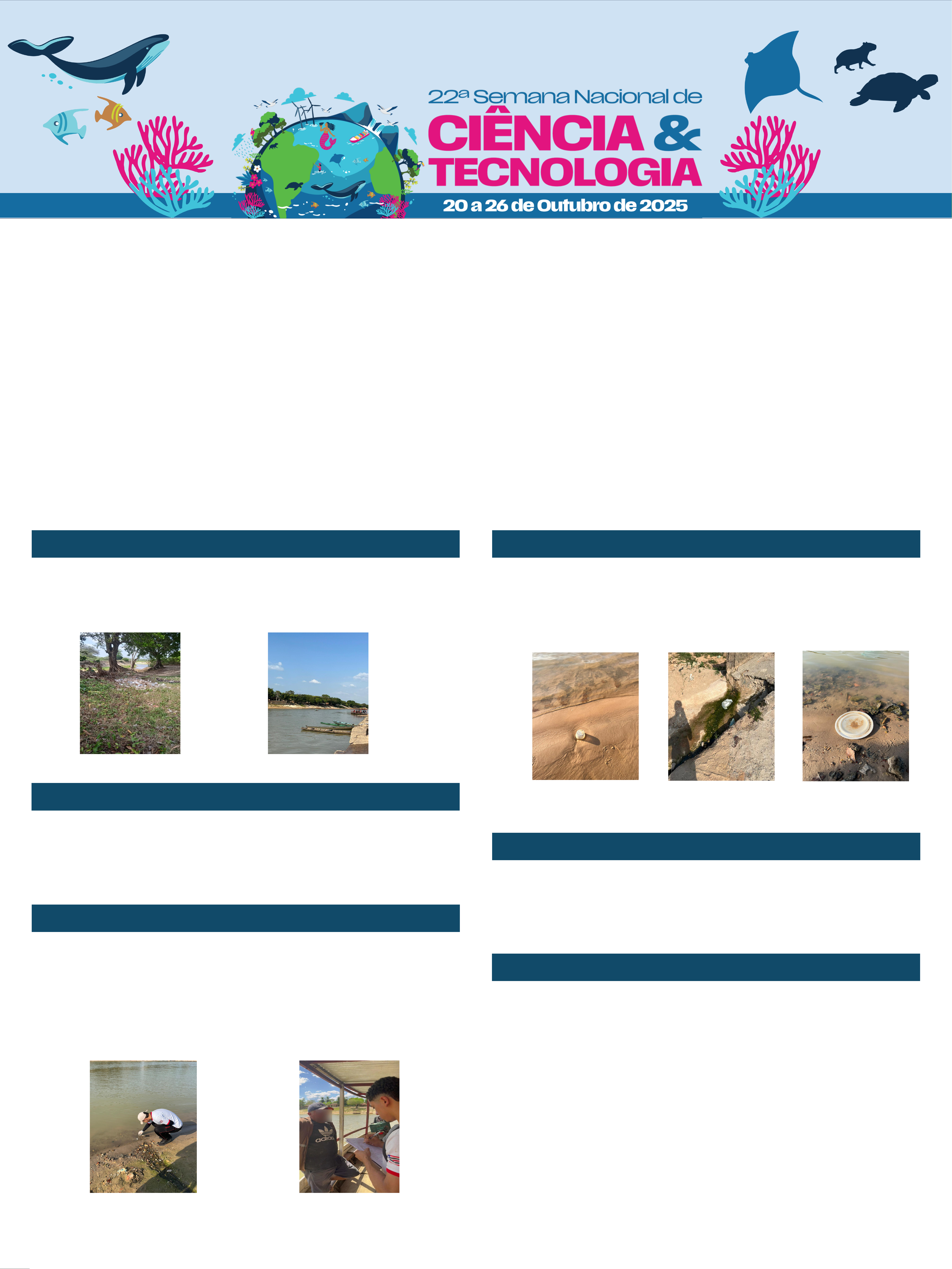 Mateus Sousa Veras1; Camila Conceição Silva Rodrigues2; Sara Rodrigues Viera3; Andreson de Carvalho Alves4; Maria Andréia Pereira da Silva5 1,2,3,4,5 (Centro Educa Mais Poeta Antônio José, Ciência Agrária e da Terra. Engenharia) 102.mateusveras.cempoeta@gmail.com. Palavras-chave: Educação ambiental; Microplásticos; Poluição fluvial; Rios maranhenses; Sustentabilidade Contaminação por Microplásticos em Rios Maranhenses: Estudo de Caso nos Rios Pindaré e Grajaú INTRODUÇÃO RESULTADOS E DISCUSSÃO OBJETIVOS METODOLOGIA CONSIDERAÇÕES FINAIS REFERÊNCIAS A poluição por microplásticos é uma preocupação ambiental crescente, afetando não apenas os oceanos, mas também os rios que atuam como canais de transporte desses poluentes. No Maranhão, rios como o Pindaré e o Grajaú, importantes para a subsistência de comunidades ribeirinhas e para a biodiversidade local, têm sido impactados pela crescente presença de resíduos plásticos, cuja fragmentação gera microplásticos quase imperceptíveis DESFORGES, J. P. W., GALBRAITH, M., & ROSS, P. S. Ingestion of microplastics by zooplankton in the Northeast Pacific Ocean. Archives of environmental contamination and toxicology, 2015. 69: 320-330. the environment. In: Rocha-Santos, T.A.P., Duarte, A.C. (Eds.), Comprehensive Analytical Chemistry, Characterization and Analysis of Microplastics. 2017. Elsevier, pp. 1–24 O objetivo geral deste estudo é identificar a presença de microplásticos nas águas desses rios, por meio da coleta e análise de amostras, e compreender a extensão da contaminação ambiental causada por esses poluentes. Além disso, busca-se analisar de forma aprofundada a percepção das comunidades locais sobre o problema, investigando o nível de conscientização, as preocupações relacionadas aos impactos ambientais e à saúde, bem como possíveis práticas adotadas para mitigar ou evitar a poluição por microplásticos. A pesquisa foi dividida em duas etapas principais: ⮚ coleta de amostras superficiais de água nos rios Pindaré e Grajaú em pontos próximos a áreas urbanas e rurais, com análise visual em laboratório utilizando peneiras de malha fina e microscopia estereoscópica para identificação qualitativa de microplásticos; ⮚ realização de entrevistas semiestruturadas com moradores, pescadores e representantes comunitários para investigar o nível de conhecimento local sobre a poluição por microplásticos e suas possíveis fontes As análises visuais confirmaram a presença de microplásticos nos dois rios, especialmente fragmentos e fibras plásticas de pequeno porte. O Rio Pindaré apresentou maior presença nas áreas urbanas, enquanto no Rio Grajaú os registros foram mais discretos, porém presentes. As entrevistas demonstraram que a maioria dos moradores não associa o lixo plástico à poluição fluvial e muito menos aos impactos nos oceanos, revelando um desconhecimento generalizado sobre o ciclo do plástico no ambiente. Os dados reforçam a importância dos rios como percursores da poluição oceânica e apontam para falhas no manejo do lixo e na educação ambiental local. O estudo confirmou que os rios Pindaré e Grajaú apresentam contaminação por microplásticos, embora de forma ainda pouco perceptível pelas populações locais. Os objetivos propostos foram alcançados ao identificar a presença desse poluente e evidenciar a carência de conhecimento da população sobre o tema. Entre as limitações do estudo, destaca-se a análise apenas qualitativa das amostras. Recomenda se ampliar o monitoramento contínuo e promover ações de educação ambiental para reduzir a entrada de plásticos nos rios e, consequentemente, nos oceanos. Fonte: AutorFonte: Autor Fonte: Autor Fonte: AutorFonte: Autor Fonte: Autor Fonte: Autor Slide 1