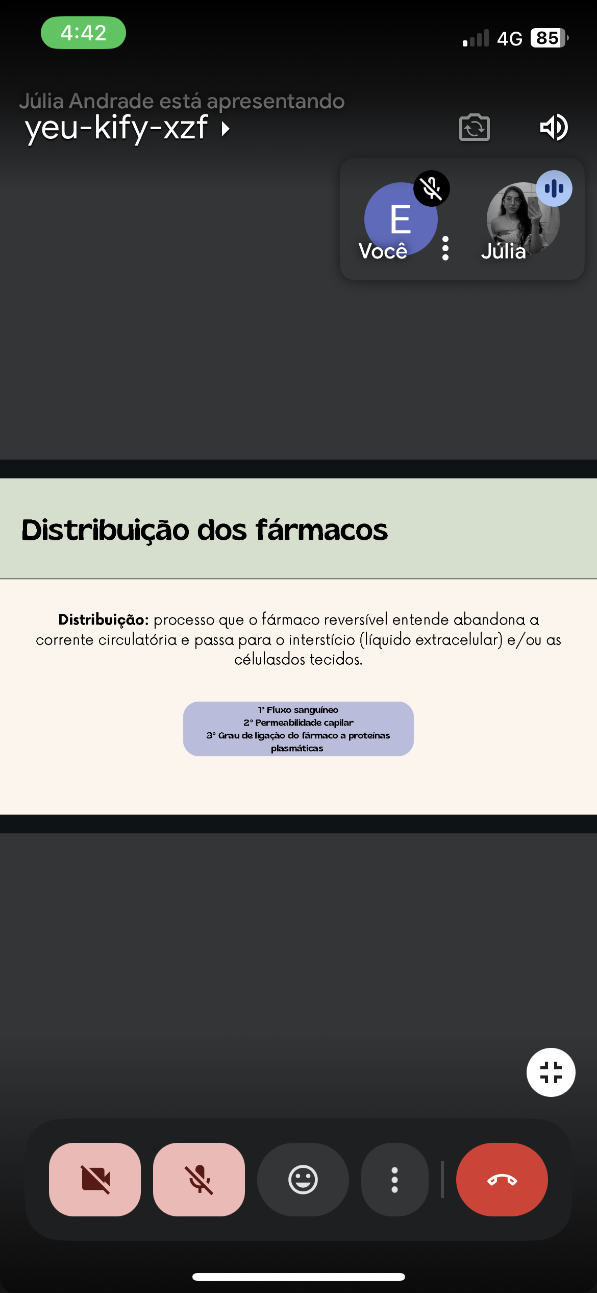 4:42 4G 85 Júlia Andrade está apresentando yeu-kify-xzf E Você Júlia Distribuição dos fármacos Distribuição: processo que fármaco reversível entende abandona a corrente circulatória e passa para interstício (líquido extracelular) e/ou as célulasdos tecidos. 1° Fluxo sanguíneo 2° Permeabilidade capilar 3° Grau de ligação do fármaco a proteínas plasmáticas L