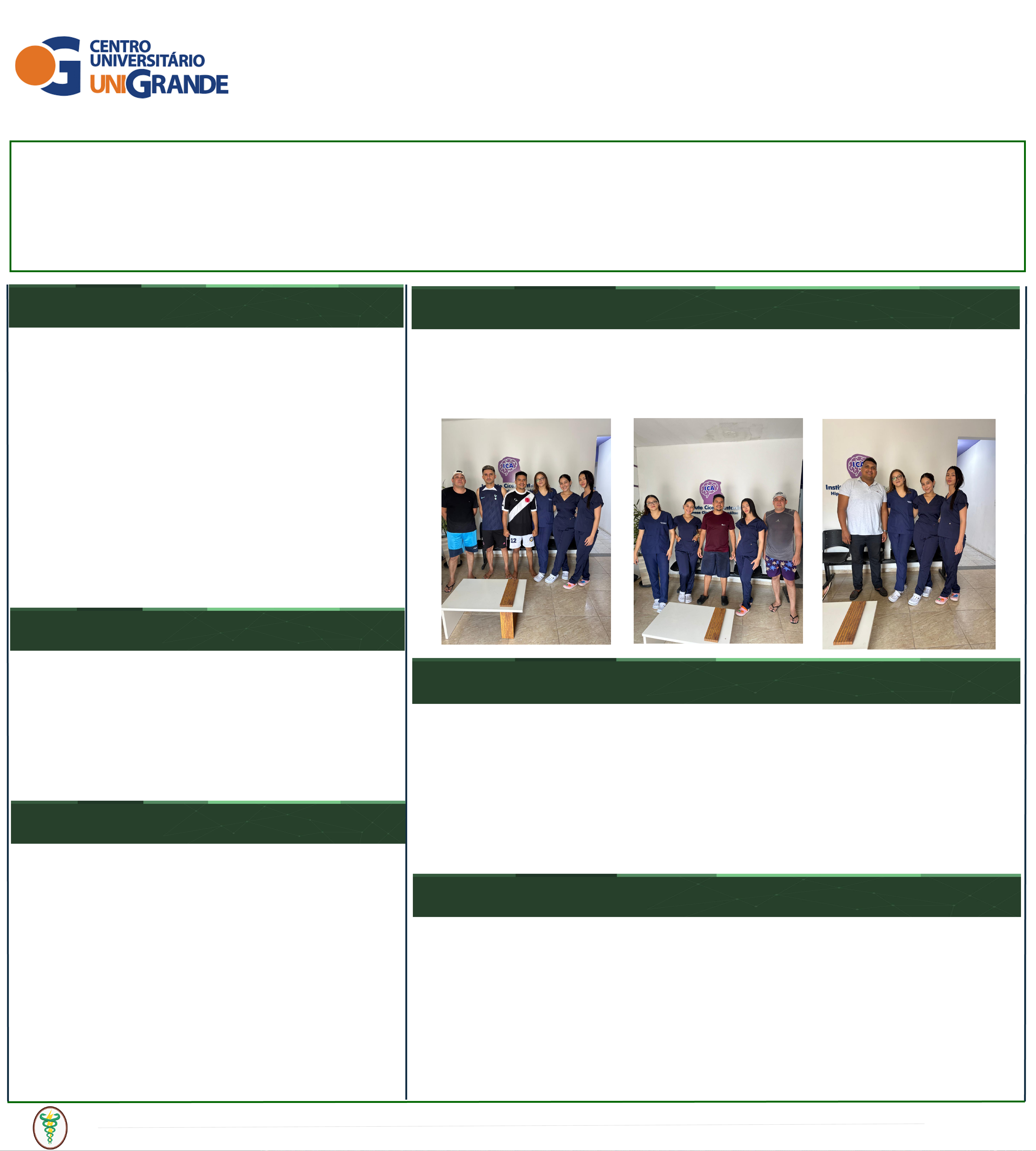 ABORDAGEM FISIOTERAPÊUTICA NA RECUPERAÇÃO FUNCIONAL APÓS RUPTURA DO TENDÃO DE AQUILES O tendão de Aquiles é o maior e mais resistente do corpo humano, sendo essencial para a locomoção e o desempenho funcional. A ruptura desse tendão é uma lesão frequente, principalmente entre praticantes de atividades físicas, e pode comprometer significativamente a mobilidade e a qualidade de vida. A fisioterapia desempenha papel fundamental nesse contexto, pois atua na restauração da força, amplitude de movimento e controle proprioceptivo, promovendo o retorno seguro às atividades diárias e esportivas. 4. CONCLUSÃO INTRODUÇÃO REFERÊNCIAS CENTRO UNIVERSITÁRIO DA GRANDE FORTALEZA REFERÊNCIAS BIBLIOGRÁFICAS ARAÚJO, F. S.; PINHEIRO, A. L.; LIMA FILHO, J. C. Reabilitação fisioterapêutica após ruptura do tendão de Aquiles: revisão integrativa. 2023. BAXTER, J. R.; ARAÚJO, F. S.; LIMA FILHO, J. C. Cargas e progressão funcional na reabilitação do tendão de Aquiles. 2020. PARK, J. H.; ARAÚJO, F. S.; PINHEIRO, A. L.; LIMA FILHO, J. C. Aspectos anatômicos e fisiológicos do tendão de Aquiles e implicações terapêuticas. 2020. SAXENA, A. et al. Protocolo GAIT para reabilitação de lesões no tendão de Aquiles. 2022. SOUZA, R. F.; LIMA, A. P.; ALMEIDA, C. S. Reabilitação fisioterapêutica em pacientes com ruptura do tendão de Aquiles. 2020. OBJETIVOS METODOLOGIA O objetivo deste trabalho é facilitar a restauração da função em pessoas que sofreram lesão no tendão de Aquiles, utilizando métodos fisioterapêuticos eficazes. Busca-se: • Prevenir rigidez articular e aderências; • Recuperar a amplitude de movimento; • Fortalecer a musculatura da panturrilha e tornozelo; • Reeducar a marcha; • Restabelecer padrões funcionais de movimento; • Promover o retorno progressivo às atividades físicas e esportivas. O estudo foi desenvolvido por meio de pesquisa bibliográfica em bases científicas (PubMed, SciELO e Google Acadêmico) e aplicação prática em ambiente clínico, ao longo de dois meses. Três pacientes submetidos à cirurgia de reparo do tendão de Aquiles foram acompanhados semanalmente, de acordo com protocolos de reabilitação específicos: Fase 1: controle da dor, redução do edema e exercícios passivos; Fase 2: ganho de amplitude de movimento e fortalecimento leve; Fase 3: treino de marcha, equilíbrio e exercícios de alta intensidade. CONCLUSÃO A fisioterapia tem papel essencial na recuperação funcional após a ruptura do tendão de Aquiles, contribuindo para o restabelecimento da força, amplitude de movimento, estabilidade e propriocepção. A aplicação de protocolos individualizados e progressivos, respeitando as fases de cicatrização tecidual, mostrou-se eficaz para promover a reabilitação segura e evitar recidivas. Os resultados obtidos confirmam que o acompanhamento fisioterapêutico sistemático é determinante para o retorno gradual às atividades diárias e esportivas, garantindo melhor qualidade de vida e autonomia aos pacientes. RESULTADOS Os pacientes apresentaram melhora progressiva na força, mobilidade e estabilidade articular, evidenciando que a reabilitação fisioterapêutica individualizada e progressiva é essencial para o restabelecimento da função e prevenção de recidivas. Eviane Carria Rodrigues;Maralice dos Santos Nascimento; Vitória Karoline Macêdo Neres. Professora: Fabilson Cutrim| Disciplina: Fisioterapia Ortopédica| Período: 6º ##FLTS1514