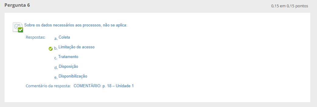 Pergunta 6 0,15 em 0,15 pontos Sobre os dados necessários aos processos, não se aplica: Respostas: a. Coleta b. Limitação de acesso Tratamento d. Disposição e. Disponibilização Comentário da resposta: COMENTÁRIO: p. 18 - Unidade 1