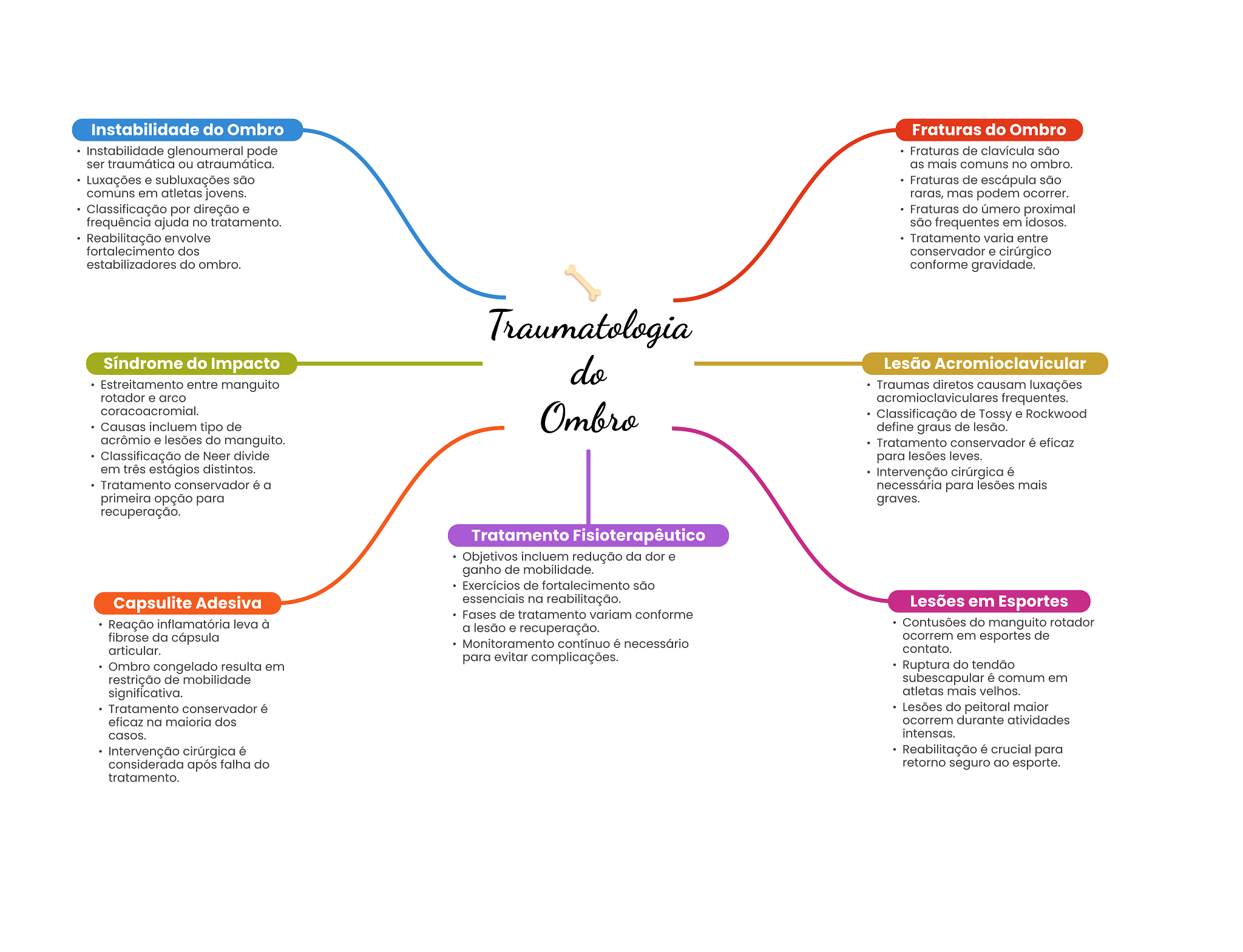 Instabilidade do Ombro Fraturas do Ombro Instabilidade glenoumeral pode Fraturas de clavícula são ser traumática ou atraumática. as mais comuns no ombro. Luxações e subluxações são Fraturas de escápula são comuns em atletas jovens. raras, mas podem ocorrer. Classificação por direção e Fraturas do úmero proximal frequência ajuda no tratamento. são frequentes em idosos. Reabilitação envolve Tratamento varia entre fortalecimento dos conservador e cirúrgico estabilizadores do ombro. conforme gravidade. Traumatologia Síndrome do Impacto do Lesão Acromioclavicular Estreitamento entre manguito Traumas diretos causam luxações rotador e arco acromioclaviculares frequentes. coracoacromial. Causas incluem tipo de Ombro Classificação de Tossy e Rockwood define graus de acrômio e lesões do manguito. Tratamento conservador é eficaz Classificação de Neer divide para lesões leves. em três estágios distintos. Intervenção cirúrgica é Tratamento conservador é a necessária para lesões mais primeira opção para graves. recuperação. Tratamento Fisioterapêutico Objetivos incluem redução da dor e ganho de mobilidade. Exercícios de fortalecimento são Capsulite Adesiva essenciais na reabilitação. Lesões em Esportes Fases de tratamento variam conforme Reação inflamatória leva à a lesão e recuperação. Contusões do manguito rotador fibrose da cápsula ocorrem em esportes de Monitoramento contínuo é necessário articular. contato. para evitar complicações. Ombro congelado resulta em Ruptura do tendão restrição de mobilidade subescapular é comum em significativa. atletas mais velhos. Tratamento conservador é Lesões do peitoral maior eficaz na maioria dos ocorrem durante atividades casos. intensas. Intervenção cirúrgica é Reabilitação é crucial para considerada após falha do retorno seguro ao esporte. tratamento.
