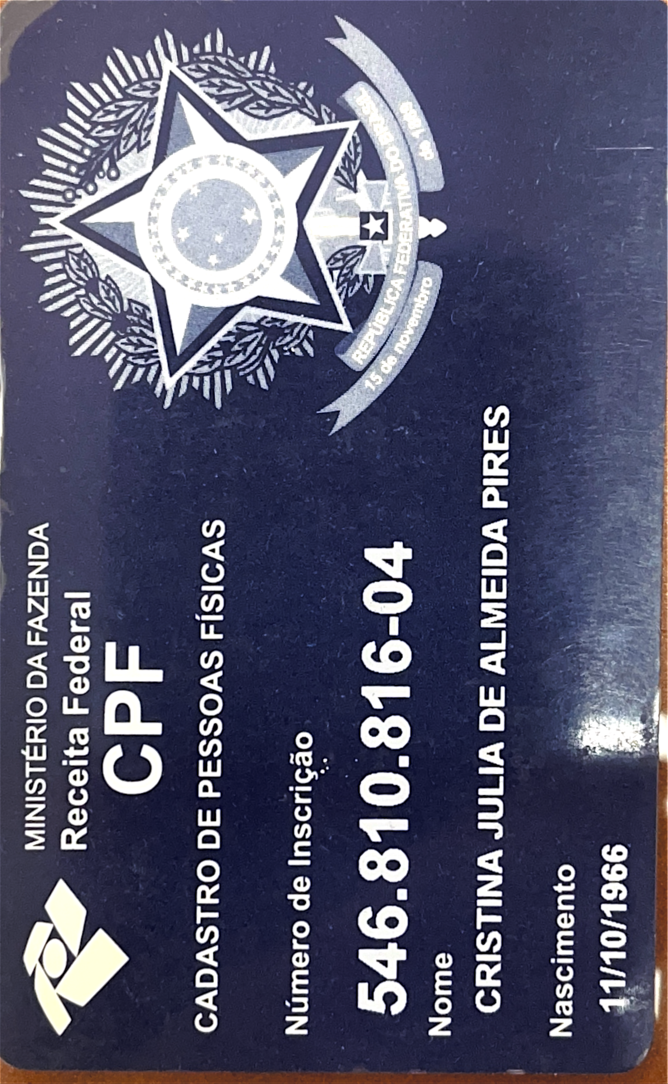 MINISTÉRIO DA FAZENDA Receita Federal CPF CADASTRO DE PESSOAS FÍSICAS Número de Inscrição 546.810.816-04 15 * Nome CRISTINA JULIA DE ALMEIDA PIRES Nascimento 11/10/1966Cartão de uso pessoal e intransferível Deve ser apresentado junto com um documento de identidade Emissão JUN/2010 CORREIOS