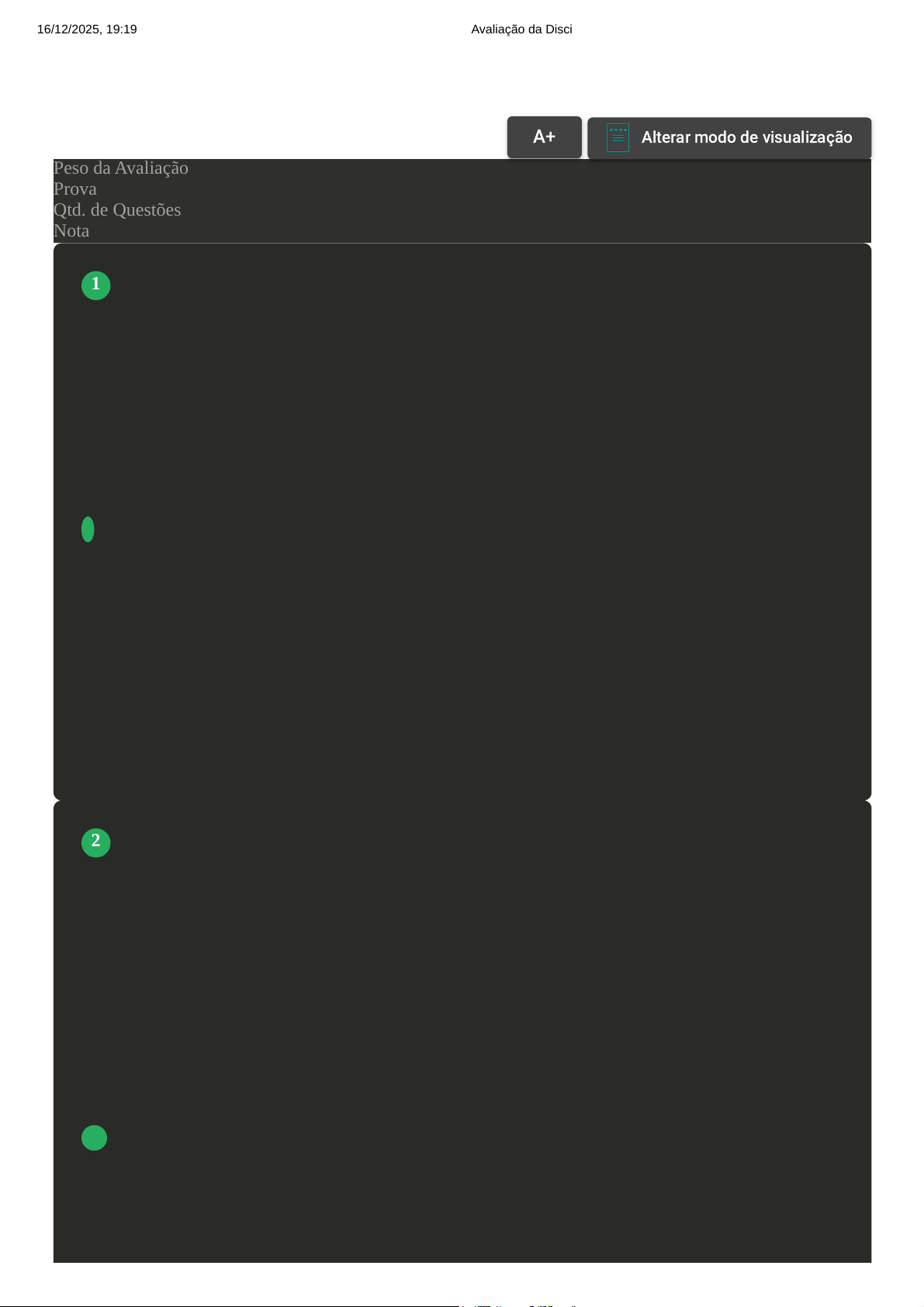 Prova Impressa GABARITO | Avaliação da Disciplina (Cod.:645429) Peso da Avaliação 10,00 Prova 103594316 Qtd. de Questões 20 Nota 9,50 A LDB 9394/96 (BRASIL, 1996) garante, através do seu Artigo número 59, aos alunos com necessidades especiais, os seguintes direitos: A Aprovação automática, dispensa de realização de provas e métodos próprios voltados à sua deficiência. B Currículos, métodos, técnicas, recursos educativos e organização específicos de forma que atendam às suas necessidades, visando a sua qualificação profissional de forma a garantir a sua efetiva integração na vida em sociedade. C Bolsa família para ele e para os familiares que lhe prestem atendimento em função de sua deficiência. D Currículos, métodos, técnicas, recursos educativos e organização específicos de forma que atendam às suas necessidades, na escola especial. A corrente que visa introduzir a diferença surda na educação, a partir da própria vocação do surdo para ensinar outro surdo, e utilizando mecanismos introduzidos pela alteridade surda, recebe o nome de: A Bilinguismo. B Libras. C Pedagogia dos surdos. VOLTAR A+ Alterar modo de visualização 1 2 16/12/2025, 19:19 Avaliação da Disciplina about:blank 1/11 D Comunicação total. A programação neurolinguística (PNL) faz com que todos tenham uma predominância sensorial, ou seja, interpreta-se o mundo de forma mais visual, auditiva ou sinestésica. Embora todos tenham os sistemas visual, auditivo e sinestésico, é comum que um deles seja mais desenvolvido que os outros e que isso influencie na forma de aprender sobre os mais diversos temas. Diante disso, analise e associe os itens que seguem: I – Estilo de aprendizagem visual. II – Estilo de aprendizagem auditiva. III – Estilo de aprendizagem sinestésica. ( ) As pessoas com este estilo de aprendizagem fazem uso de imagens para obter e reter as informações. ( ) As pessoas com este estilo de aprendizagem captam melhor as informações fazendo ou executando. ( ) As pessoas com este estilo de aprendizagem captam e retêm melhor as informações ouvindo. Assinale a alternativa que apresenta a sequência correta de respostas: A II – III – I. B I – II – III. C III – I – II. D I – III – II. De acordo com o que foi estudado sobre o papel educacional que a família possui em relação ao indivíduo, analise as alternativas abaixo e classifique-as com verdadeiras (V) ou falsas (F). Ao final, escolha a alternativa que contém a sequência correta. I – Na maioria das vezes de maneira inconsciente, a criança aprende sobre o mundo e a vida através de cada pessoa da família, sendo os membros da família são os seus primeiros mestres. 3 4 16/12/2025, 19:19 Avaliação da Disciplina about:blank 2/11 II – A educação existe difusa em todos os mundos sociais, entre as incontáveis práticas dos mistérios do aprender. III – Os pais, as mães e outros parentes próximos como irmãos e avós são educadores das crianças, muitas vezes os primeiros, ensinando-lhes não somente os valores e costumes da sociedade em que vivem como também a falar, à conviver com os seus pares, a se expressar publicamente e, em alguns casos, a escrever as primeiras palavras, os números e as operações básicas da matemática. IV – A chave para o processo do crescimento está na oportunidade que a família oferece à criança de ter um lugar seguro para descobrirem a si mesmas e às outras pessoas no seu mundo. Em essência, a família é o primeiro campo de treinamento significativo para o recém-nascido. V – A família continua a desempenhar seu papel mesmo depois que a criança está apta a interagir no ambiente fora do lar. As crianças passam por novos e por vezes frustrantes períodos de crescimento, à medida que se tornam parte da estrutura social mais ampla. A V, V, V,V, V. B V, F, V, F, V. C V, F, V, V, V. D V, V, F, V, F. De acordo com as ideias de Vygotsky (1989), conceitos cotidianos são aqueles: A Provenientes de estudos realizados pela comunidade científica e que possuem como características a sistematização e a organização, sendo adquiridos de forma consciente pelos indivíduos. B Construídos pelo sujeito de maneira informal e inconsciente, a partir das experiências que vivencia em seu dia-a-dia. C Que o sujeito adquire a partir de fontes diversas como internet, enciclopédias impressas, jornais e revistas. D Adquiridos pelos professores para que possam ser trabalhados em sala de aula com os alunos, a partir de uma metodologia baseada na utilização de material concreto. 5 16/12/2025, 19:19 Avaliação da Disciplina about:blank 3/11 Em relação ao que discutimos no caderno de estudos em relação à educação, assinale a alternativa incorreta: A A escola é a instituição encarregada de oferecer oficial e formalmente o acesso aos conhecimentos científicos aos indivíduos (OLIVEIRA, 1999). B A educação faz parte da nossa vida desde o momento em que nascemos e nos acompanha durante toda a nossa existência. C Educação é uma das atividades básicas da sociedade humana, pois contribui de forma decisiva para a transmissão da herança cultural aos indivíduos jovens (OLIVEIRA, 1999). D No início dos tempos a educação dos indivíduos dava-se de forma sistemática e formal, diluindo- se nas experiências práticas que os indivíduos vivenciavam em seu dia-a-dia, na convivência com os seus pares, sobretudo os mais velhos e experientes. Segundo Oliveira (1999), a função educacional assumida pela família em relação à criança consiste em: A Trabalhar os conceitos científicos antes do indivíduo frequentar a escola. B Transmitir os valores cultuados pela mídia, para que a criança seja aceita no ambiente escolar. C Transmitir à criança os valores e padrões culturais da sociedade. D Construir uma barreira psicológica para que a criança saiba defender-se de ações preconceituosas quando frequentar a sociedade. Já o termo int