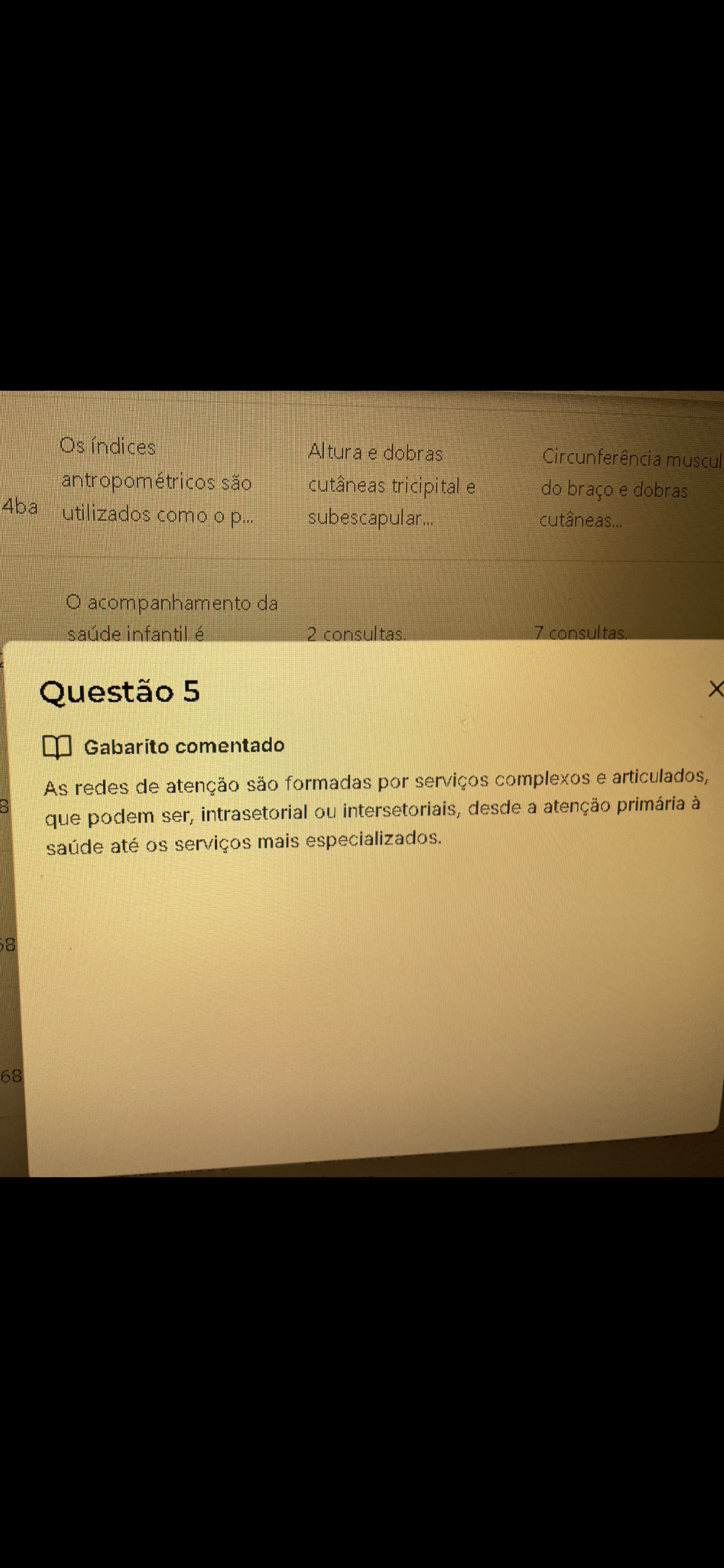 Os índices Altura e dobras Circunferência muscul antropométricos são cutâneas tricipital e 4ba do braço e dobras utilizados como subescapular... cutâneas... 0 acompanhamento da saúde infantil é 2 consultas. 7 consultas. Questão 5 X Gabarito comentado As redes de atenção são formadas por serviços complexos e articulados, que podem ser, intrasetorial ou intersetoriais, desde a atenção primária à saúde até OS serviços mais especializados.