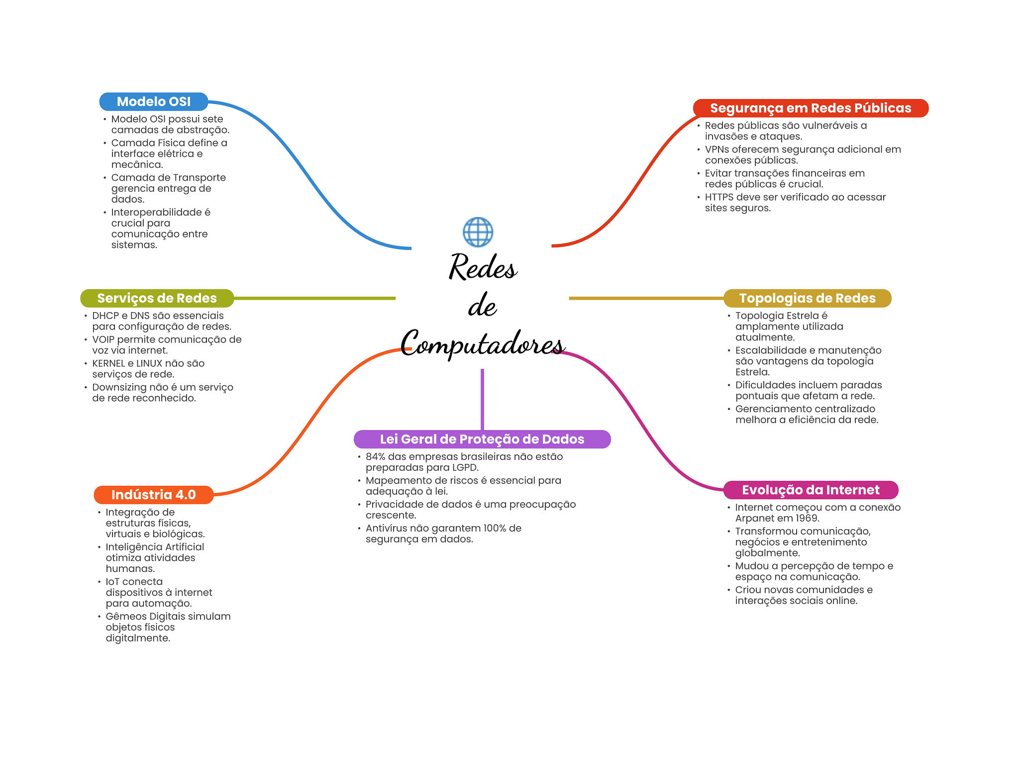 Modelo OSI Segurança em Redes Públicas Modelo OSI possui sete camadas de abstração. Redes públicas são vulneráveis a invasões e ataques. Camada Física define a interface elétrica e VPNs oferecem segurança adicional em mecânica. conexões públicas. Camada de Transporte Evitar transações financeiras em gerencia entrega de redes públicas é crucial. dados. HTTPS deve ser verificado ao acessar Interoperabilidade é sites seguros. crucial para comunicação entre sistemas. Redes Serviços de Redes de Topologias de Redes DHCP e DNS são essenciais Topologia Estrela é para configuração de redes. amplamente utilizada VOIP permite comunicação de via internet. Computadores atualmente. Escalabilidade e manutenção KERNEL e LINUX não são são vantagens da topologia serviços de rede. Estrela. Downsizing não é um serviço Dificuldades incluem paradas de rede reconhecido. pontuais que afetam a rede. Gerenciamento centralizado melhora a eficiência da rede. Lei Geral de Proteção de Dados 84% das empresas brasileiras não estão preparadas para LGPD. Mapeamento de riscos é essencial para Indústria 4.0 adequação à lei. Evolução da Internet Privacidade de dados é uma preocupação Integração de Internet começou com a conexão crescente. estruturas físicas, Arpanet em 1969. virtuais e biológicas. Antivírus não garantem 100% de Transformou comunicação, segurança em dados. Inteligência Artificial negócios e entretenimento otimiza atividades globalmente. humanas. Mudou a percepção de tempo e loT conecta espaço na comunicação. dispositivos à internet Criou novas comunidades e para automação. interações sociais online. Gêmeos Digitais simulam objetos físicos digitalmente.