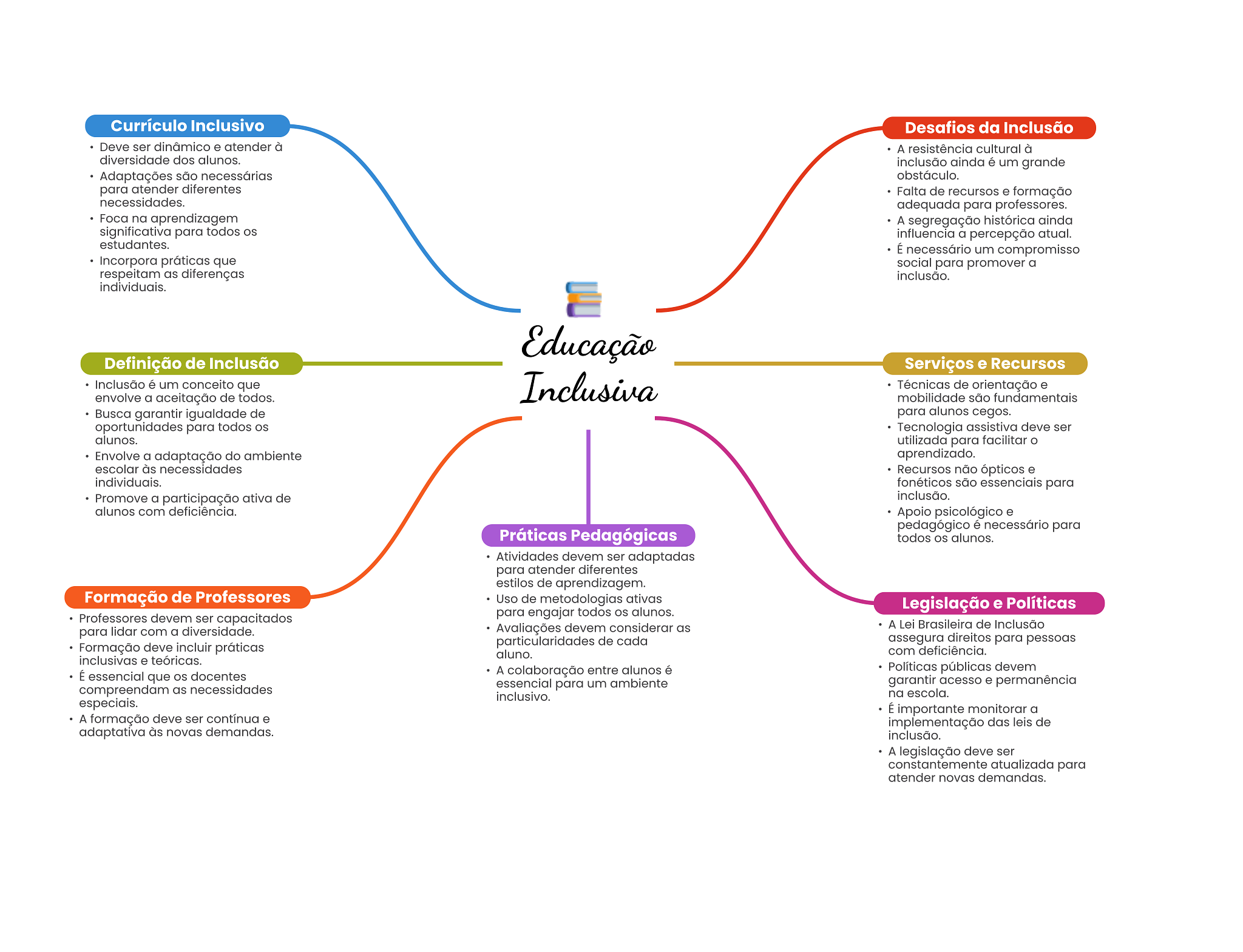 Currículo Inclusivo Desafios da Inclusão Deve ser dinâmico e atender à A resistência cultural à diversidade dos alunos. inclusão ainda é um grande Adaptações são necessárias obstáculo. para atender diferentes Falta de recursos e formação necessidades. adequada para professores. Foca na aprendizagem A segregação histórica ainda significativa para todos influencia a percepção atual. estudantes. É necessário um compromisso Incorpora práticas que social para promover a respeitam as diferenças inclusão. individuais. Educação Definição de Inclusão Serviços e Recursos Inclusão é um conceito que envolve a aceitação de todos. Inclusiva Técnicas de orientação e mobilidade são fundamentais Busca garantir igualdade de para alunos cegos. oportunidades para todos OS Tecnologia assistiva deve ser alunos. utilizada para facilitar Envolve a adaptação do ambiente aprendizado. escolar às necessidades Recursos não ópticos e individuais. fonéticos são essenciais para Promove a participação ativa de inclusão. alunos com deficiência. Apoio psicológico e pedagógico é necessário para Práticas Pedagógicas todos alunos. Atividades devem ser adaptadas para atender diferentes estilos de aprendizagem. Formação de Professores Uso de metodologias ativas Professores devem ser capacitados para engajar todos OS alunos. Legislação e Políticas para lidar com a diversidade. Avaliações devem considerar as A Lei Brasileira de Inclusão Formação deve incluir práticas particularidades de cada assegura direitos para pessoas aluno. com deficiência. inclusivas e teóricas. A colaboração entre alunos é Políticas públicas devem É essencial que docentes essencial para um ambiente garantir acesso e permanência compreendam as necessidades inclusivo. na escola. especiais. É importante monitorar a A formação deve ser contínua e implementação das leis de adaptativa às novas demandas. inclusão. A legislação deve ser constantemente atualizada para atender novas demandas.