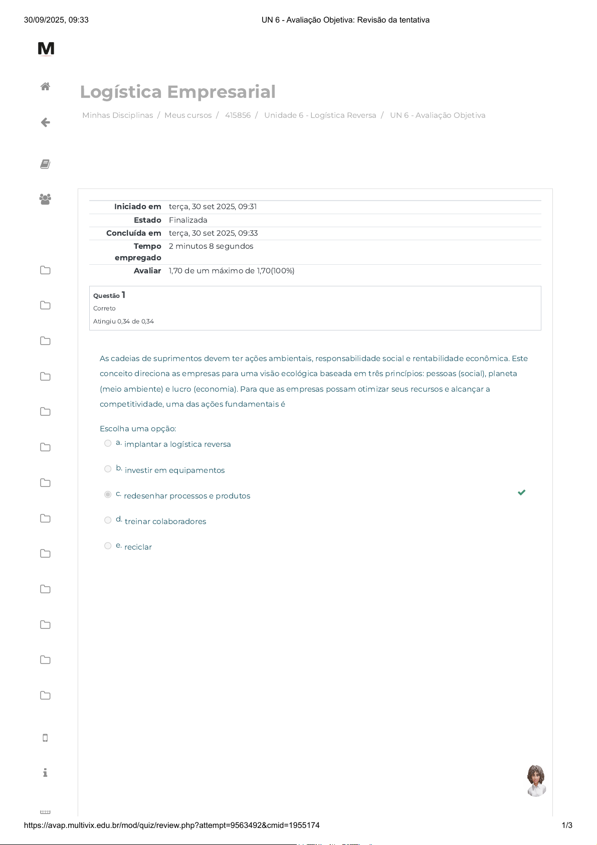 Minhas Disciplinas / Meus cursos / 415856 / Unidade 6 - Logística Reversa / UN 6 - Avaliação Objetiva Logística Empresarial Iniciado em terça, 30 set 2025, 09:31 Estado Finalizada Concluída em terça, 30 set 2025, 09:33 Tempo empregado 2 minutos 8 segundos Avaliar 1,70 de um máximo de 1,70(100%) Questão 1 Correto Atingiu 0,34 de 0,34 As cadeias de suprimentos devem ter ações ambientais, responsabilidade social e rentabilidade econômica. Este conceito direciona as empresas para uma visão ecológica baseada em três princípios: pessoas (social), planeta (meio ambiente) e lucro (economia). Para que as empresas possam otimizar seus recursos e alcançar a competitividade, uma das ações fundamentais é Escolha uma opção: a. implantar a logística reversa b. investir em equipamentos c. redesenhar processos e produtos d. treinar colaboradores e. reciclar 30/09/2025, 09:33 UN 6 - Avaliação Objetiva: Revisão da tentativa https://avap.multivix.edu.br/mod/quiz/review.php?attempt=9563492&cmid=1955174 1/3 https://avap.multivix.edu.br/my/ https://avap.multivix.edu.br/course/view.php?id=36000 https://avap.multivix.edu.br/course/view.php?id=36000§ion=7 https://avap.multivix.edu.br/mod/quiz/view.php?id=1955174 https://avap.multivix.edu.br/my/ https://avap.multivix.edu.br/course/view.php?id=36000 https://avap.multivix.edu.br/user/index.php?id=36000 https://avap.multivix.edu.br/course/view.php?id=36000§ion=1 https://avap.multivix.edu.br/course/view.php?id=36000§ion=2 https://avap.multivix.edu.br/course/view.php?id=36000§ion=3 https://avap.multivix.edu.br/course/view.php?id=36000§ion=4 https://avap.multivix.edu.br/course/view.php?id=36000§ion=5 https://avap.multivix.edu.br/course/view.php?id=36000§ion=6 https://avap.multivix.edu.br/course/view.php?id=36000§ion=7 https://avap.multivix.edu.br/course/view.php?id=36000§ion=8 https://avap.multivix.edu.br/course/view.php?id=36000§ion=9 https://avap.multivix.edu.br/course/view.php?id=36000§ion=10 https://avap.multivix.edu.br/course/view.php?id=36000§ion=11 https://avap.multivix.edu.br/course/view.php?id=36000§ion=12 https://avap.multivix.edu.br/course/view.php?id=36000§ion=13 https://avap.multivix.edu.br/hooks/portal/ https://avap.multivix.edu.br/mod/page/view.php?id=1252%2F%22%20target%3D%22_blank https://avap.multivix.edu.br/calendar/view.php/ https://avap.multivix.edu.br/ https://avap.multivix.edu.br/ https://avap.multivix.edu.br/ https://avap.multivix.edu.br/ Questão 2 Correto Atingiu 0,34 de 0,34 Questão 3 Correto Atingiu 0,34 de 0,34 Os negócios sustentáveis exigem operações responsáveis em termos ambientais e sociais, sendo fundamental na implementação das práticas de sustentabilidade na empresa. Podemos dizer que a empresa terá mais abrangência e influência sustentável interna e externamente por meio do processo Escolha uma opção: a. de atuação no mercado internacional b. de seleção de fornecedores c. de produção d. da cadeia de suprimentos e. de atendimento ao cliente Atualmente, os ativos intangíveis podem ser medidos pelos valores de ações de empresas sustentáveis, que alcançam 12% em comparação com empresas que não possuem esse valor intangível, segundo o DS 400 – Dow Jones Sustainability e S&P 500 (índices de bolsa de valores com empresas sustentáveis e convencionais, respectivamente). O ativo intangível nada mais é que Escolha uma opção: a. a venda de ações de empresas sustentáveis b. empresas centenárias com programas de reciclagem de materiais c. um benefício para a sociedade, reduzindo o impacto negativo para o meio ambiente. d. os direitos autorais relativos a temas de sustentabilidade e. a oferta de serviços de empresas que divulgam projetos para o meio ambiente 30/09/2025, 09:33 UN 6 - Avaliação Objetiva: Revisão da tentativa https://avap.multivix.edu.br/mod/quiz/review.php?attempt=9563492&cmid=1955174 2/3 https://avap.multivix.edu.br/my/ https://avap.multivix.edu.br/course/view.php?id=36000 https://avap.multivix.edu.br/user/index.php?id=36000 https://avap.multivix.edu.br/course/view.php?id=36000§ion=1 https://avap.multivix.edu.br/course/view.php?id=36000§ion=2 https://avap.multivix.edu.br/course/view.php?id=36000§ion=3 https://avap.multivix.edu.br/course/view.php?id=36000§ion=4 https://avap.multivix.edu.br/course/view.php?id=36000§ion=5 https://avap.multivix.edu.br/course/view.php?id=36000§ion=6 https://avap.multivix.edu.br/course/view.php?id=36000§ion=7 https://avap.multivix.edu.br/course/view.php?id=36000§ion=8 https://avap.multivix.edu.br/course/view.php?id=36000§ion=9 https://avap.multivix.edu.br/course/view.php?id=36000§ion=10 https://avap.multivix.edu.br/course/view.php?id=36000§ion=11 https://avap.multivix.edu.br/course/view.php?id=36000§ion=12 https://avap.multivix.edu.br/course/view.php?id=36000§ion=13 https://avap.multivix.edu.br/hooks/portal/ https://avap.multivix.edu.br/mod/page/view.php?id=1252%2F%22%20target%3D%22_blank https://avap.multivix.edu.br/calendar/view.php/ https://avap.multivix.edu.br/ https://avap.multivix.edu.br/ https://avap.multivix.edu.br/ https://avap.multivix.edu.br/ Questão 4 Correto Atingiu 0,34 de 0,34 Questão 5 Correto Atingiu 0,34 de 0,34 John Elkington, além de escritor, é fundador e diretor da consultoria SustainAbility, uma das maiores referências empresariais atuais de negócios sustentáveis. Ele é criador do conceito Triple botton line, também chamado de Tripé da Sustentabilidade no Brasil. O tripé da sustentabilidade é baseado nos princípios de Escolha uma opção: a. pessoas, planeta e lucro b. fabricação, transporte e sustentabilidade c. investimento, lucro e planeta. d. Produção, lucro e atendimento e. planeta, fabricação e pessoas O fluxo direto que envolve a fabricação, transporte e a distribuição de produtos até o cliente final, deverá ser monitorado com relação à geração de resíduos. Segundo a legislação, haverá corresponsabilidade entre importadores, fabricantes, comer