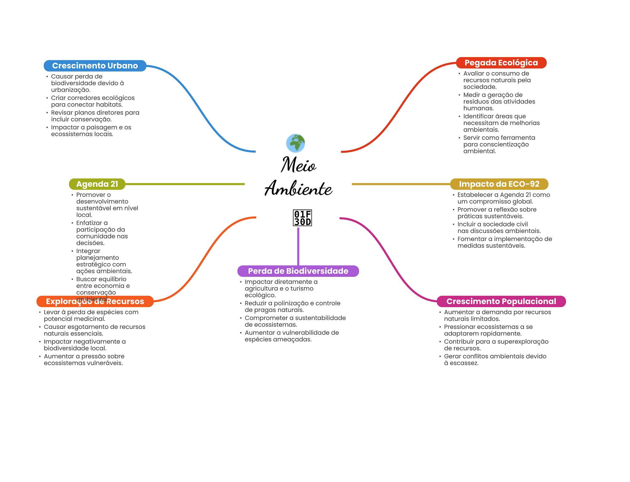 Crescimento Urbano Pegada Ecológica Avaliar consumo de Causar perda de biodiversidade devido à recursos naturais pela sociedade. urbanização. Criar corredores ecológicos Medir a geração de resíduos das atividades para conectar habitats. humanas. Revisar planos diretores para incluir conservação. Identificar áreas que necessitam de melhorias Impactar a paisagem e OS ambientais. ecossistemas locais. Servir como ferramenta para conscientização ambiental. Meio Agenda 21 Ambiente Impacto da ECO-92 Promover Estabelecer a Agenda 21 como desenvolvimento um compromisso global. sustentável em nível Promover a reflexão sobre local. 01F práticas sustentáveis. Enfatizar a 30D Incluir a sociedade civil participação da nas discussões ambientais. comunidade nas Fomentar a implementação de decisões. medidas sustentáveis. Integrar planejamento estratégico com ações ambientais. Perda de Biodiversidade Buscar equilíbrio Impactar diretamente a entre economia e agricultura e O turismo conservação ecológico. Exploração de Recursos Reduzir a polinização e controle Crescimento Populacional Levar à perda de espécies com de pragas naturais. Aumentar a demanda por recursos potencial medicinal. Comprometer a sustentabilidade naturais limitados. Causar esgotamento de recursos de ecossistemas. Pressionar ecossistemas a se naturais essenciais. Aumentar a vulnerabilidade de adaptarem rapidamente. Impactar negativamente a espécies ameaçadas. Contribuir para a superexploração biodiversidade local. de recursos. Aumentar a pressão sobre Gerar conflitos ambientais devido ecossistemas vulneráveis. à escassez.