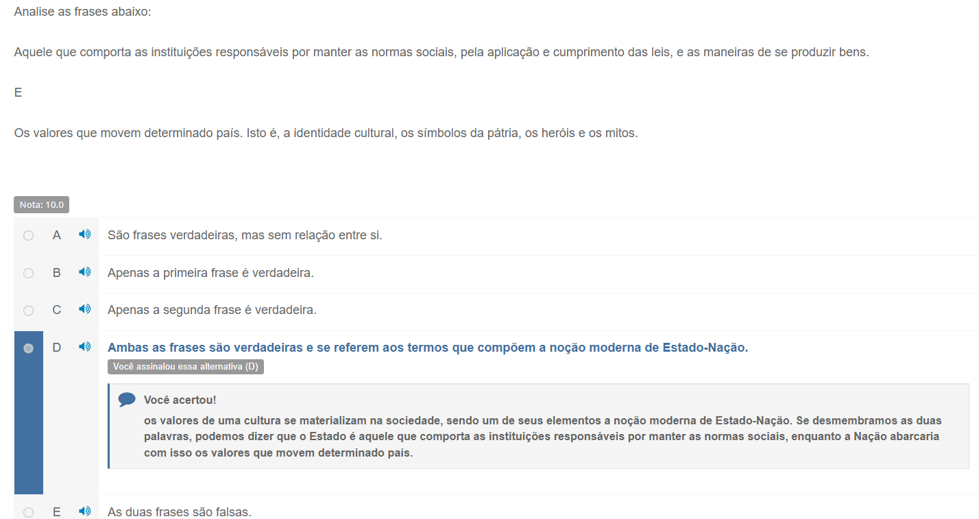 Analise as frases abaixo: Aquele que comporta as instituições responsáveis por manter as normas sociais, pela aplicação e cumprimento das leis, e as maneiras de se produzir bens. E Os valores que movem determinado país. Isto é, a identidade cultural, OS símbolos da pátria, heróis e mitos. Nota: 10.0 A São frases verdadeiras, mas sem relação entre si. B Apenas a primeira frase é verdadeira. C Apenas a segunda frase é verdadeira. D Ambas as frases são verdadeiras e se referem aos termos que compõem a noção moderna de Estado-Nação. Você assinalou essa alternativa (D) Você acertou! os valores de uma cultura se materializam na sociedade, sendo um de seus elementos a noção moderna de Estado-Nação. Se desmembramos as duas palavras, podemos dizer que O Estado é aquele que comporta as instituições responsáveis por manter as normas sociais, enquanto a Nação abarcaria com isso os valores que movem determinado país. E As duas frases são falsas.