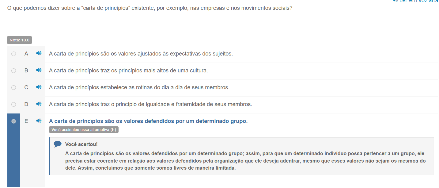 que podemos dizer sobre a "carta de princípios" existente, por exemplo, nas empresas e nos movimentos sociais? Nota: 10.0 A A carta de princípios são valores ajustados às expectativas dos sujeitos. B A carta de princípios traz OS princípios mais altos de uma cultura. C A carta de princípios estabelece as rotinas do dia a dia de seus membros. D A carta de princípios traz O princípio de igualdade e fraternidade de seus membros. E A carta de princípios são valores defendidos por um determinado grupo. Você assinalou essa alternativa (E) Você acertou! A carta de princípios são valores defendidos por um determinado grupo; assim, para que um determinado indivíduo possa pertencer a um grupo, ele precisa estar coerente em relação aos valores defendidos pela organização que ele deseja adentrar, mesmo que esses valores não sejam os mesmos do dele. Assim, concluímos que somente somos livres de maneira limitada.